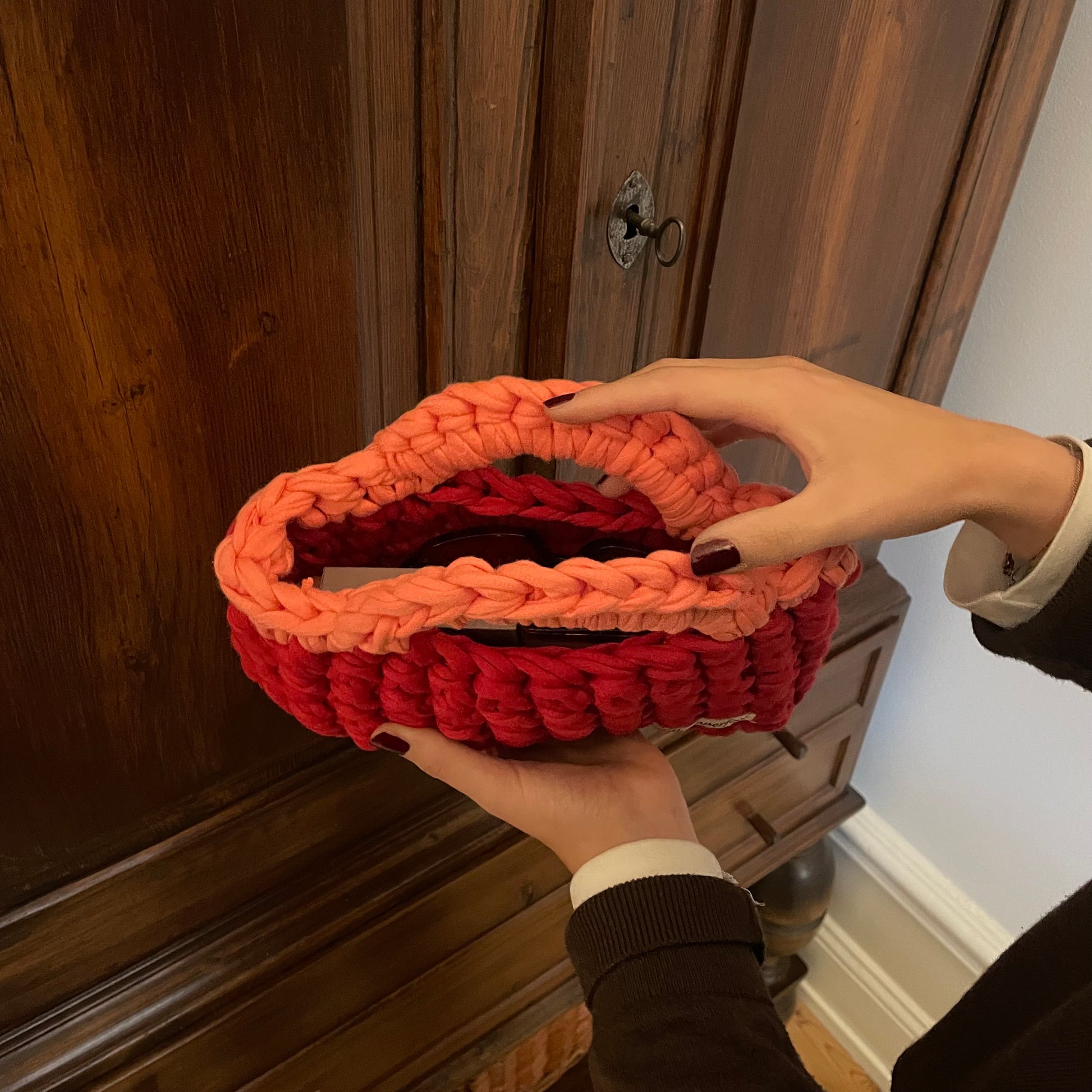 The handbag Elin is a smaller crocheted handbag, despite its size, you can fit the necessary things for a day in town or an evening with friends. It is two colored, in the color combination red/apricot or light blue/petrol, crocheted in a cotton knit.