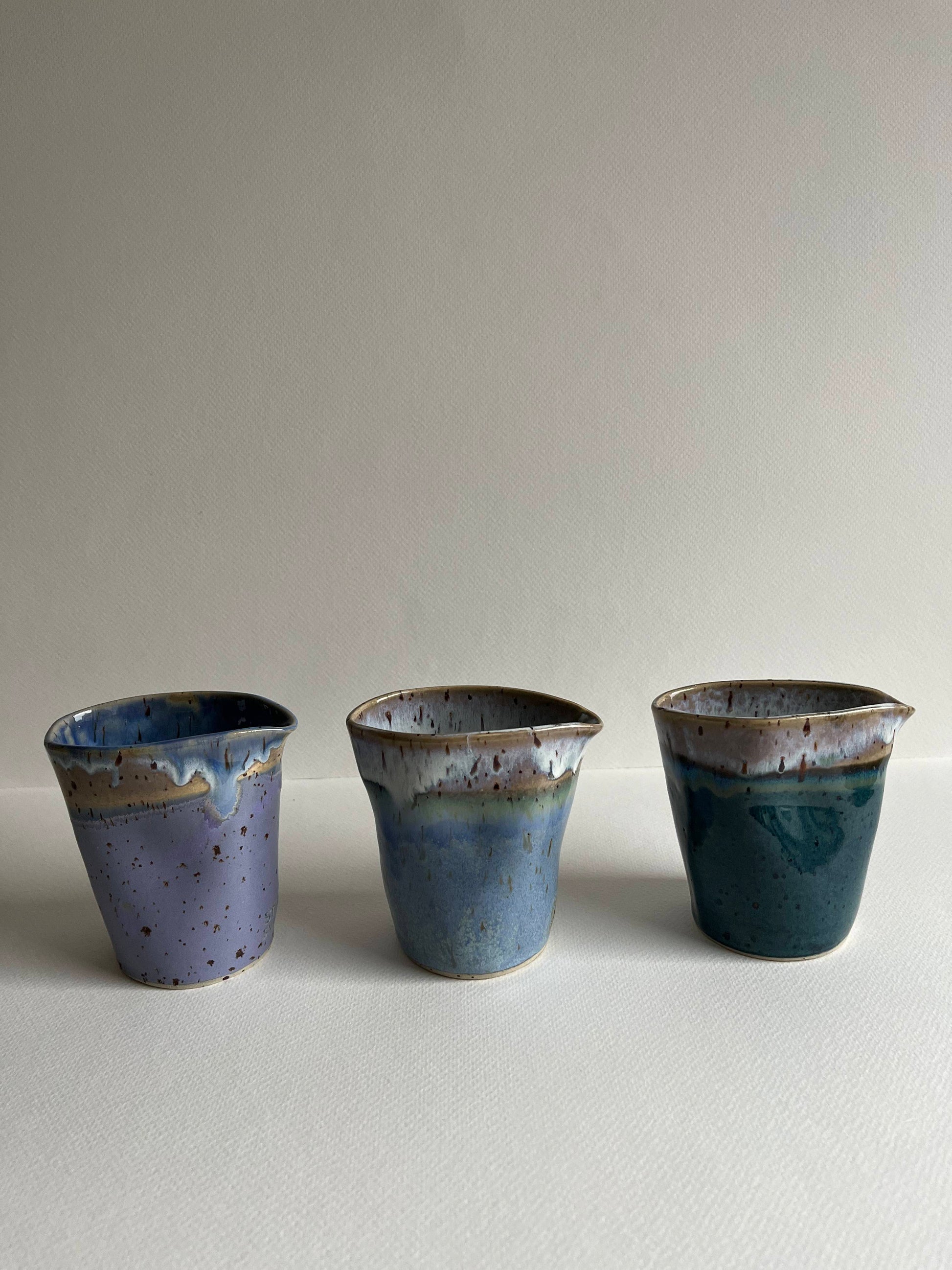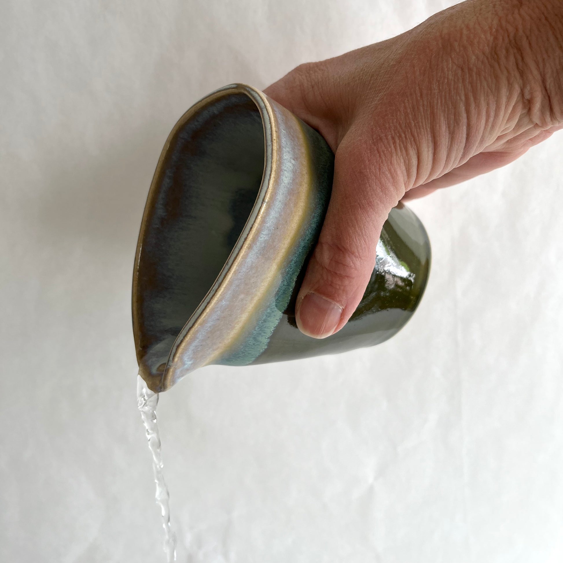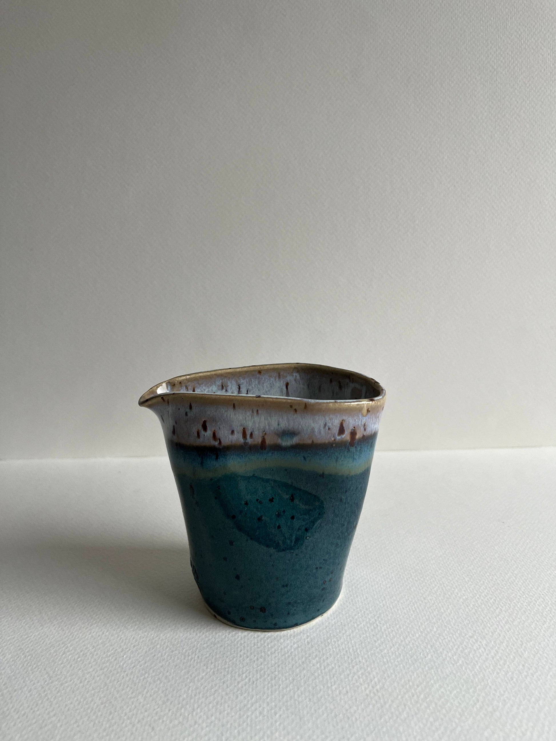 A handmade ceramic jug in a blue color and unique shape, made by the talented Stilla Sinnet. This stylish, timeless piece is perfect for pouring liquids and for elevating your kitchen!