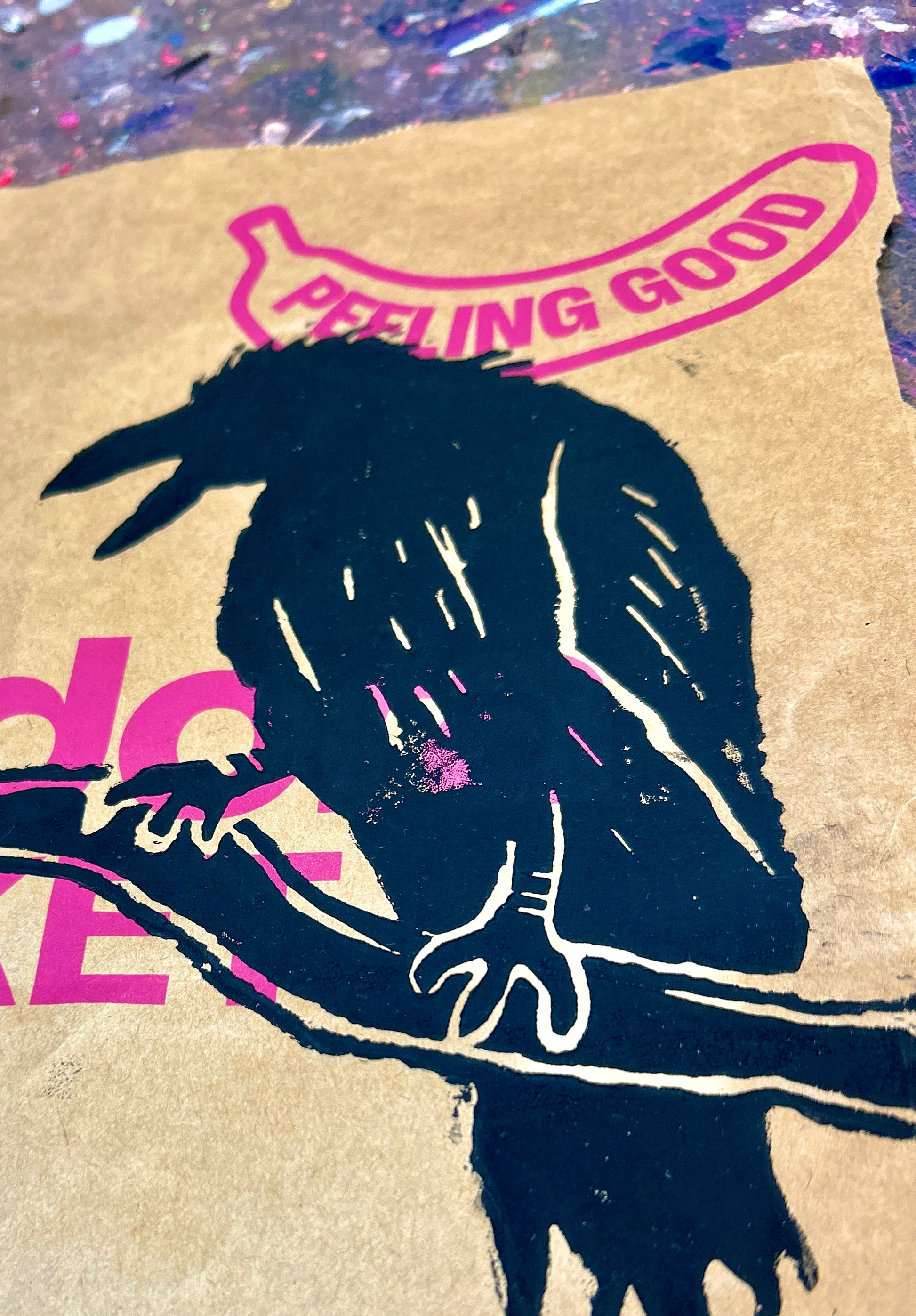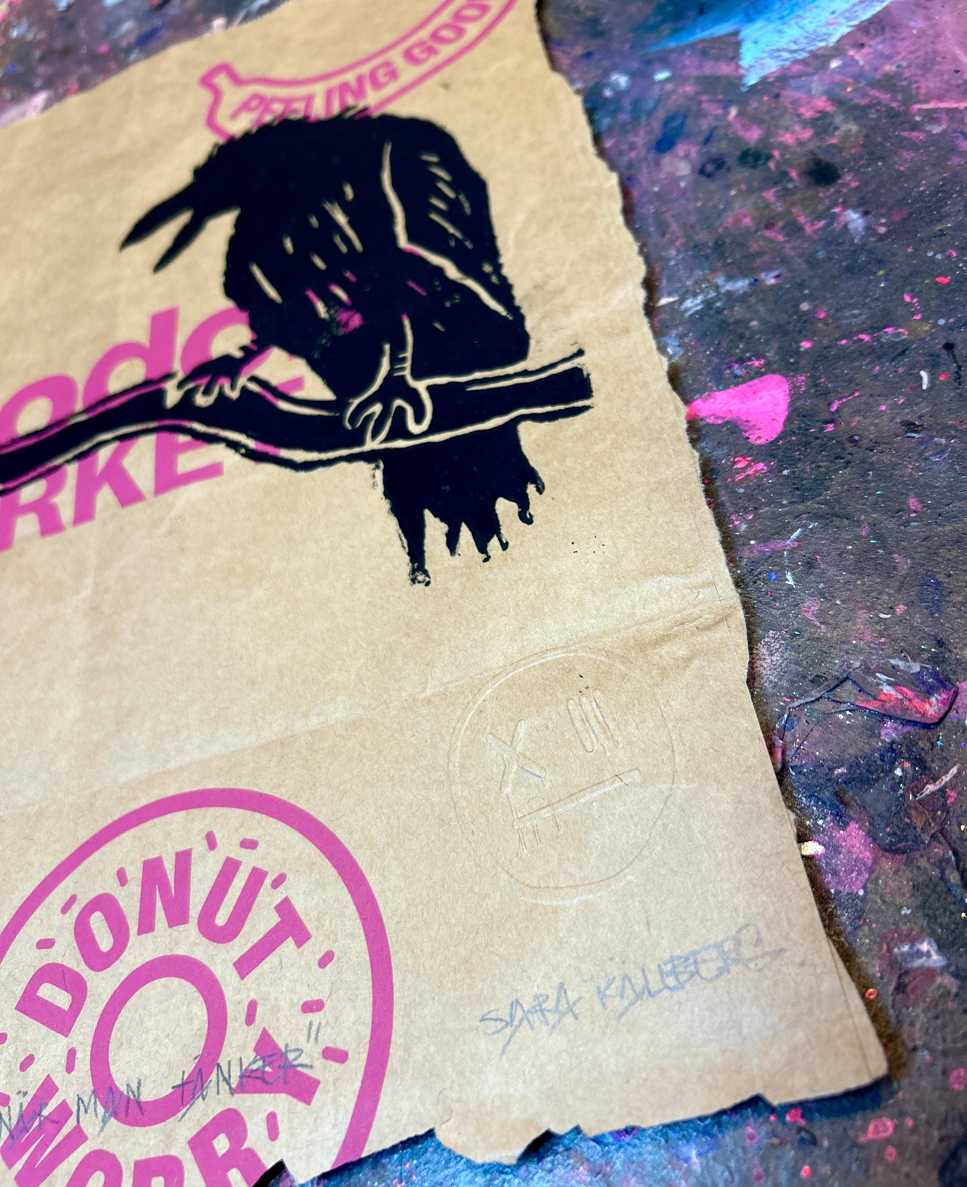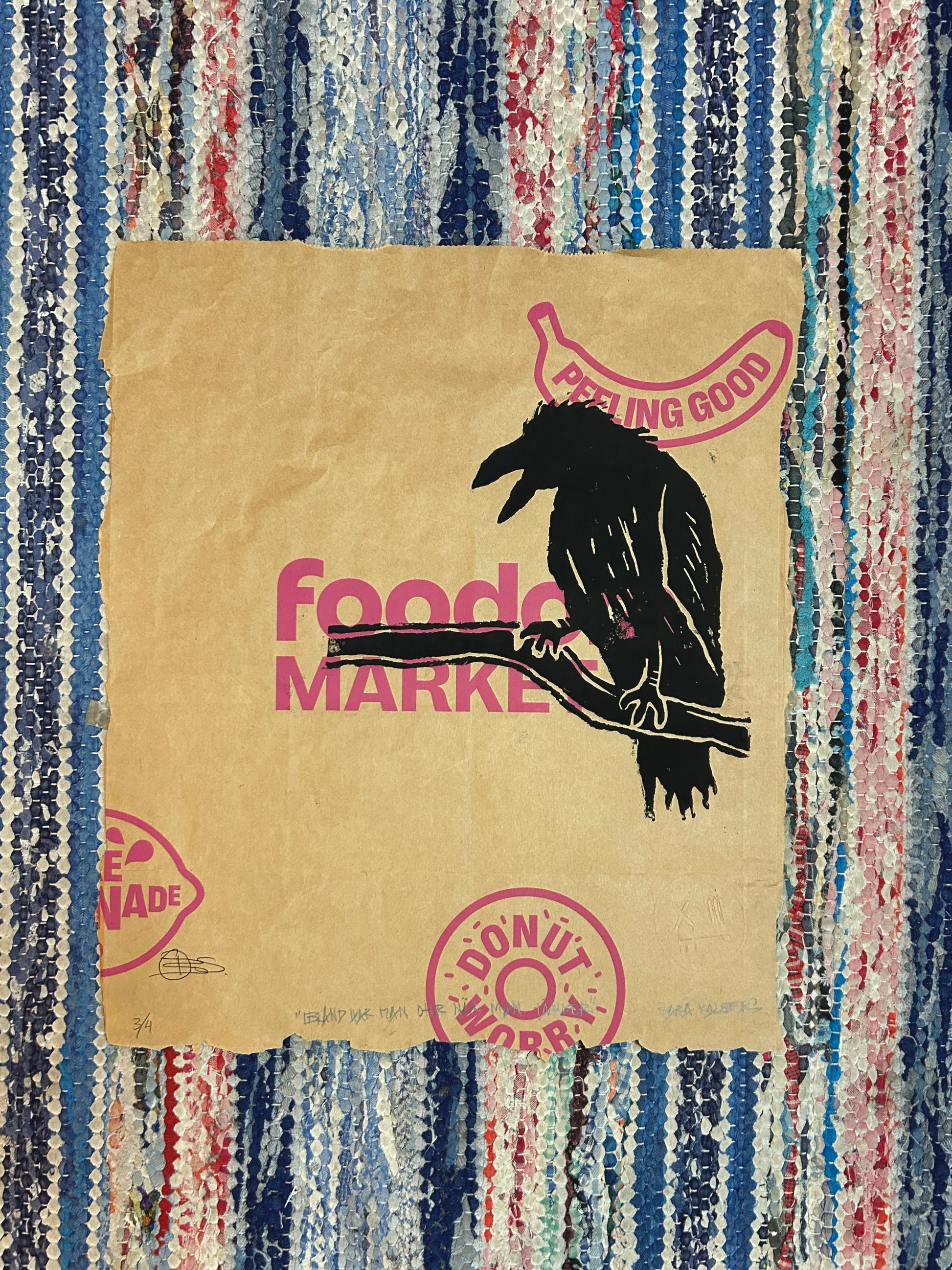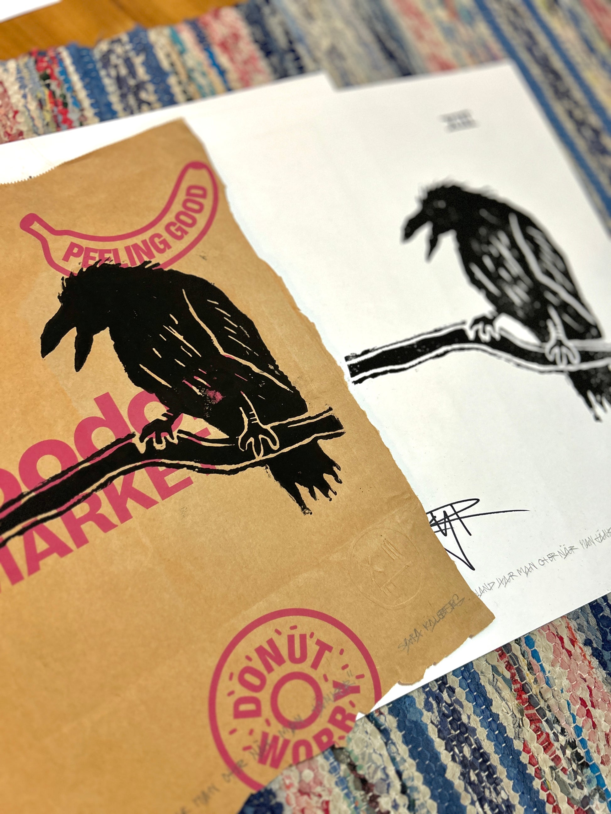 Linolium prints in limited edition. Have made a few versions of print - this version (black raven printed on old Foodora bag) is limited to 4 prints. Signed, numbered and with artist stamp. Please note that each print is unique and may vary slightly from pictures.