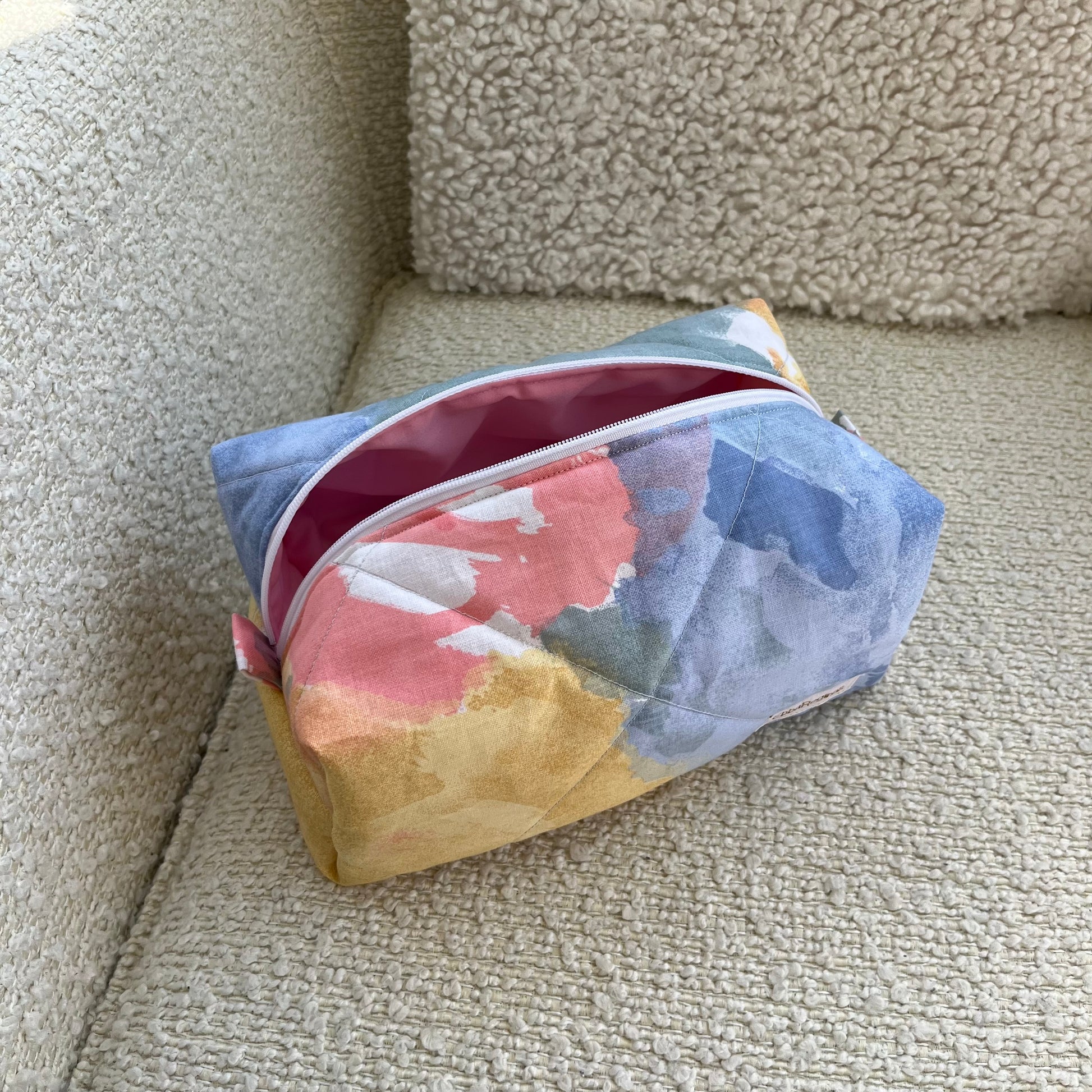 A handmade medium-sized toiletry bag, perfect for organizing your products, whether it’s makeup, skincare, or other essentials you want to bring along.