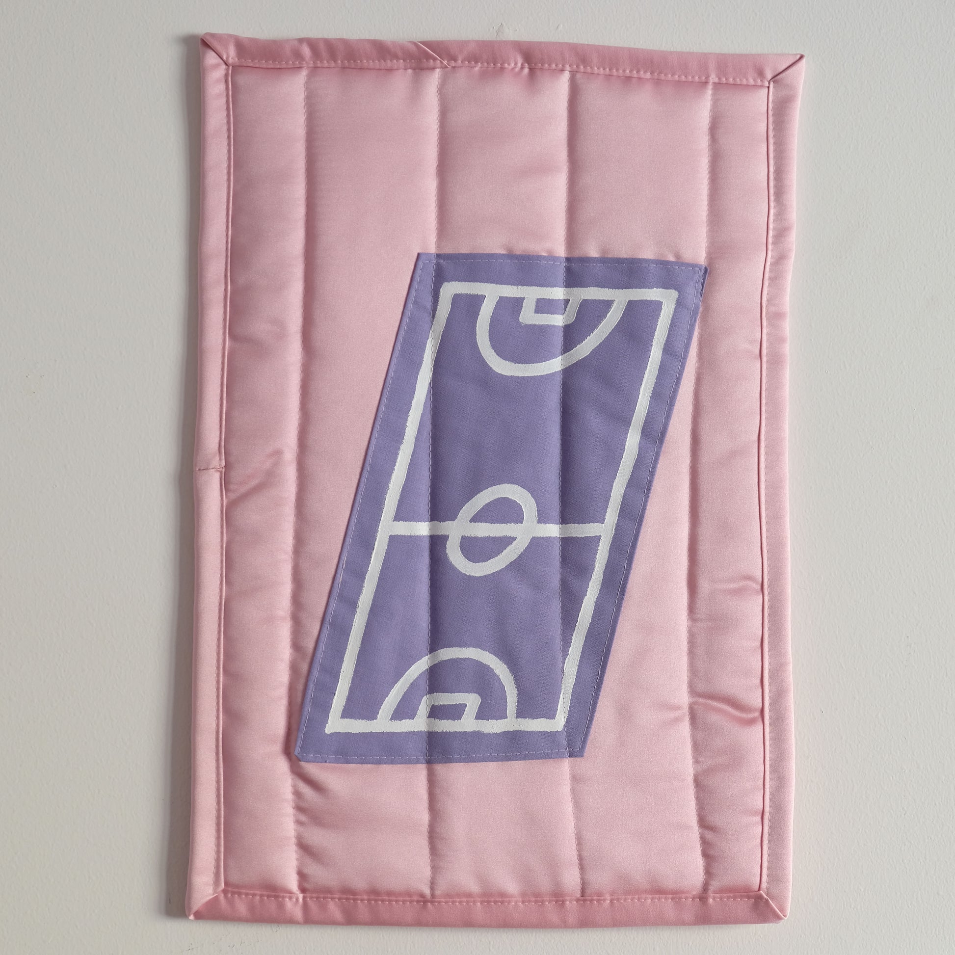A soft handball court to hang on the wall, from the KURSIV series. Light pink satin has been given an application of light purple fabric, painted with white acrylic paint and then sewn using the quilting technique. The quilt is available in only one copy and is ready to hang with the back hanging device.