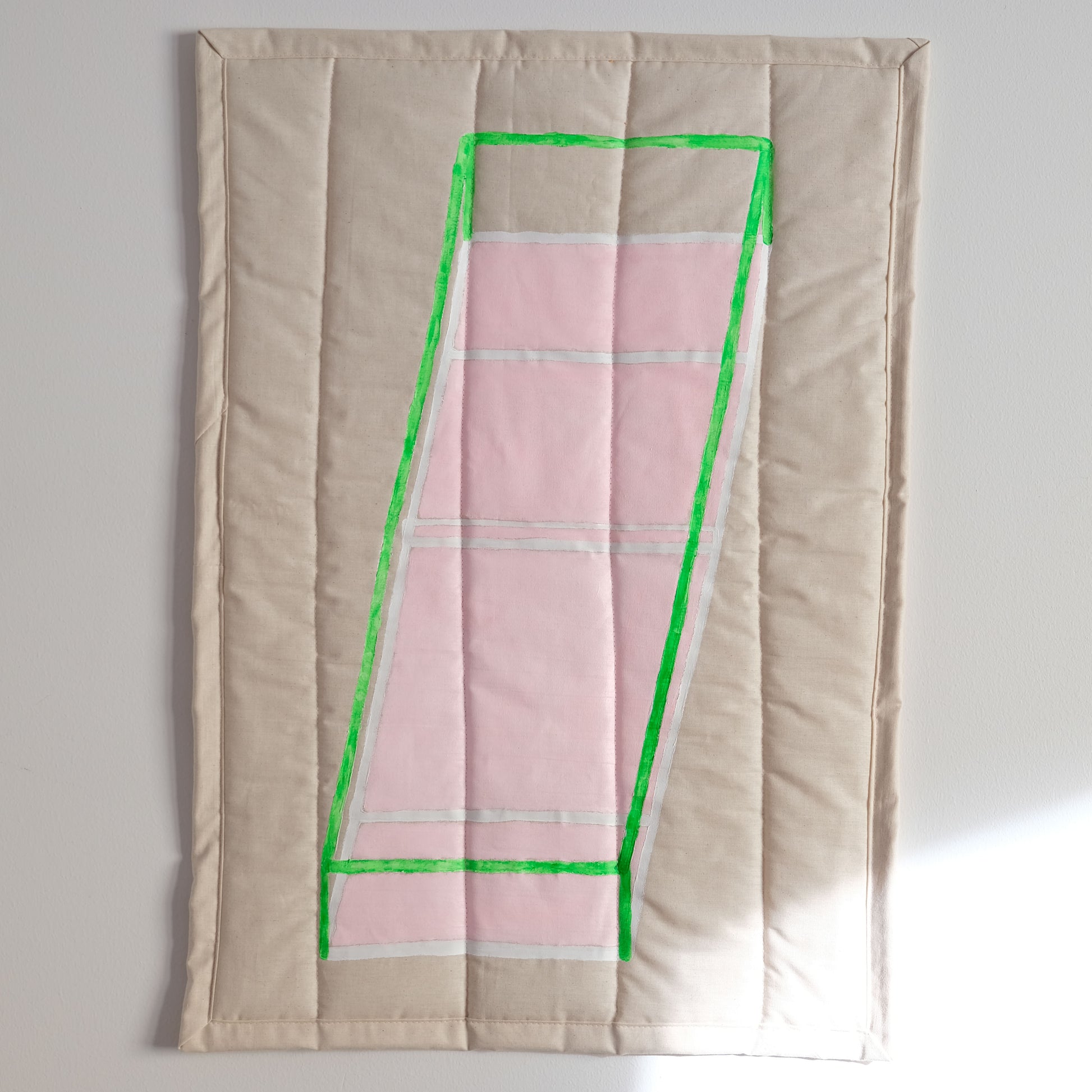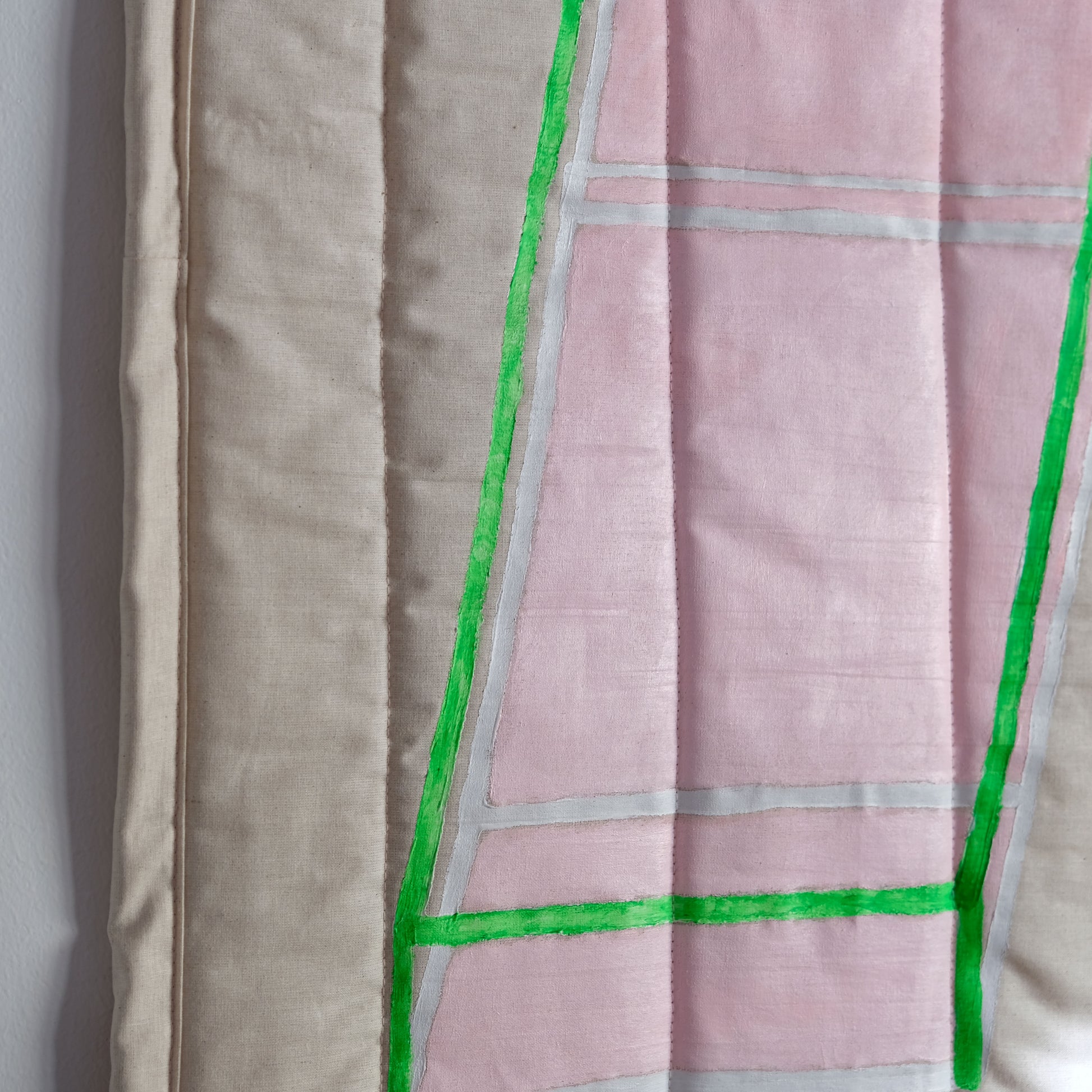 A soft padel court to hang on the wall, from the KURSIV series. Cotton fabric has been painted with white, light pink and neon green acrylic paint and then sewn using the quilting technique. The quilt comes in one copy and is ready to hang with the back hanging device.