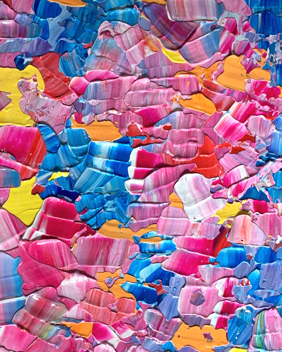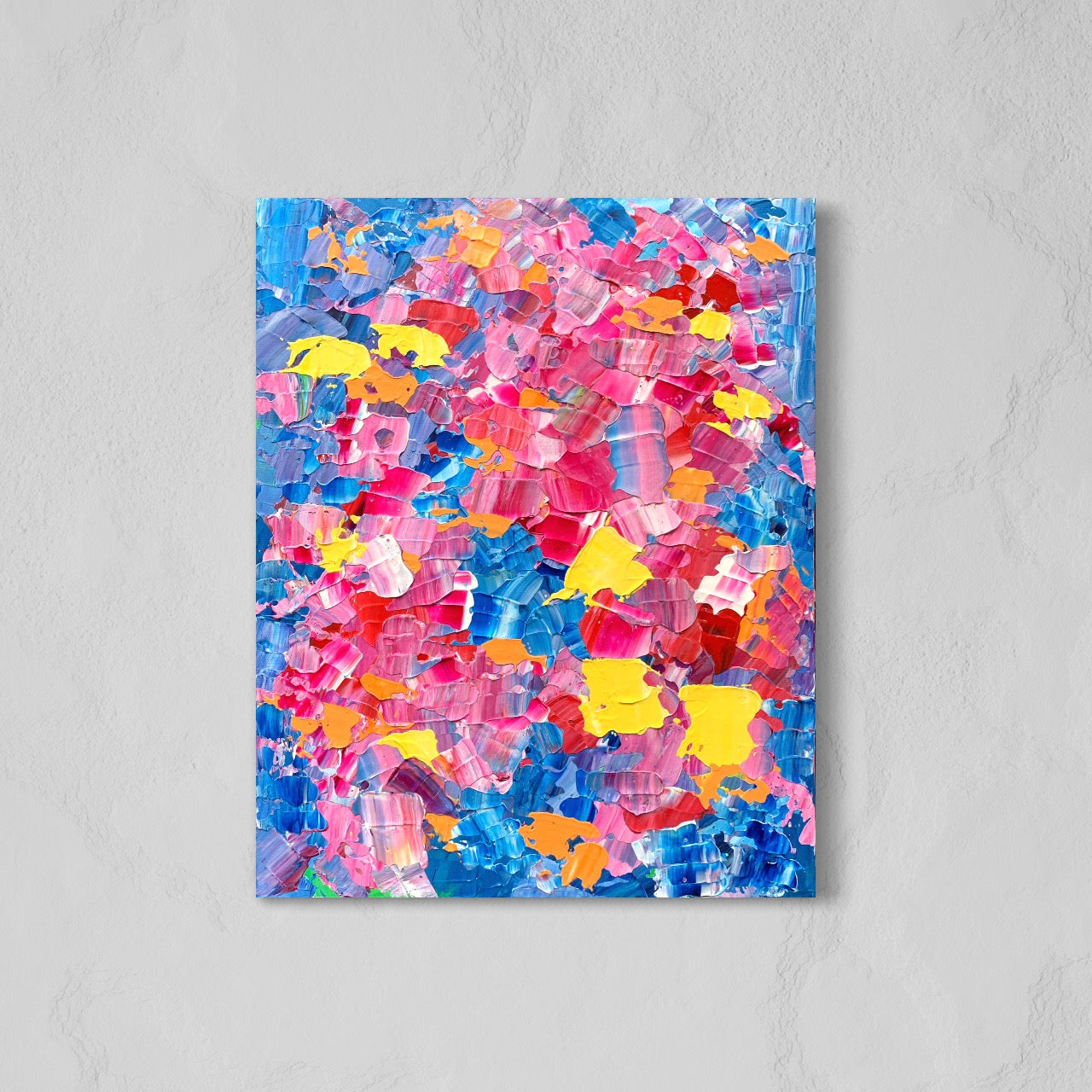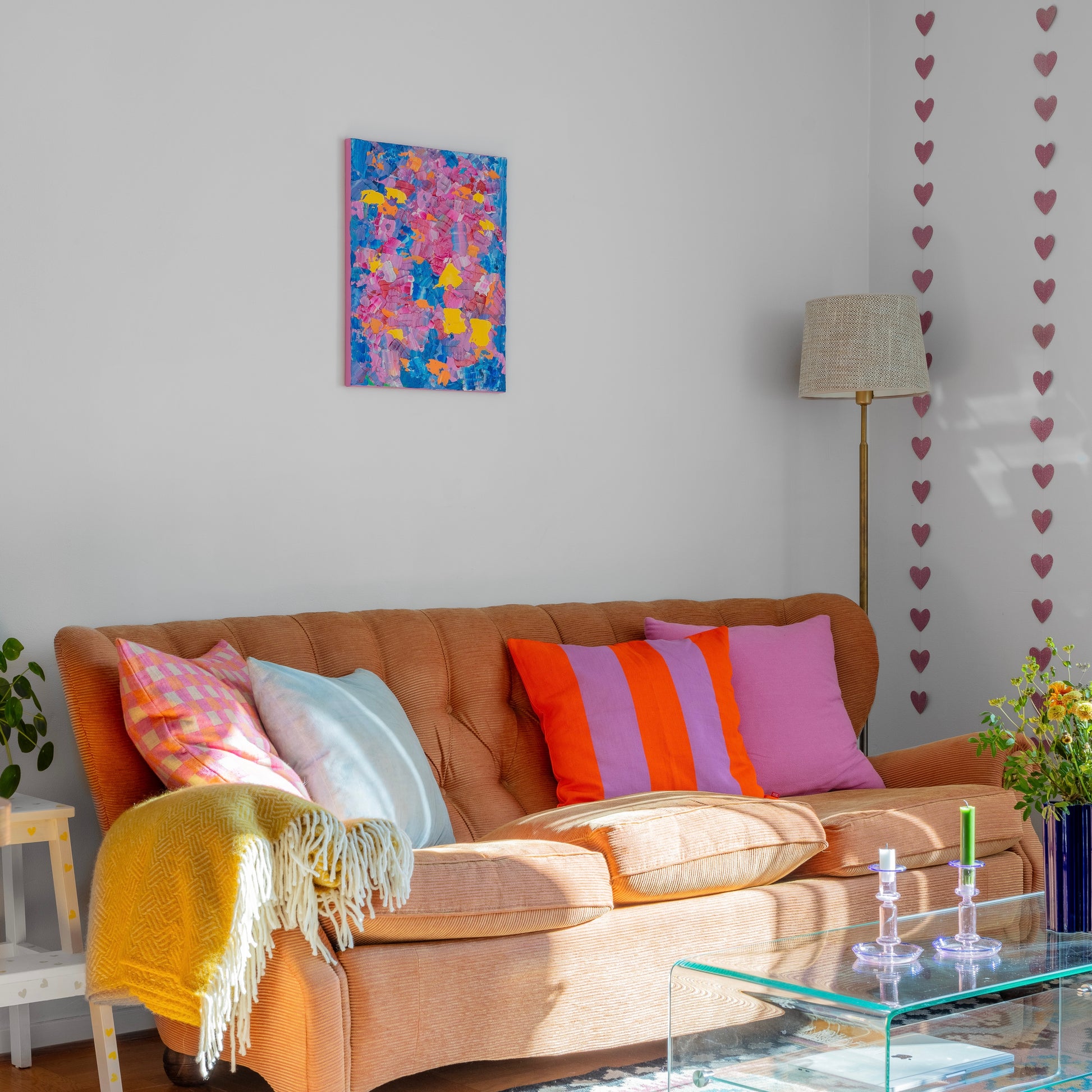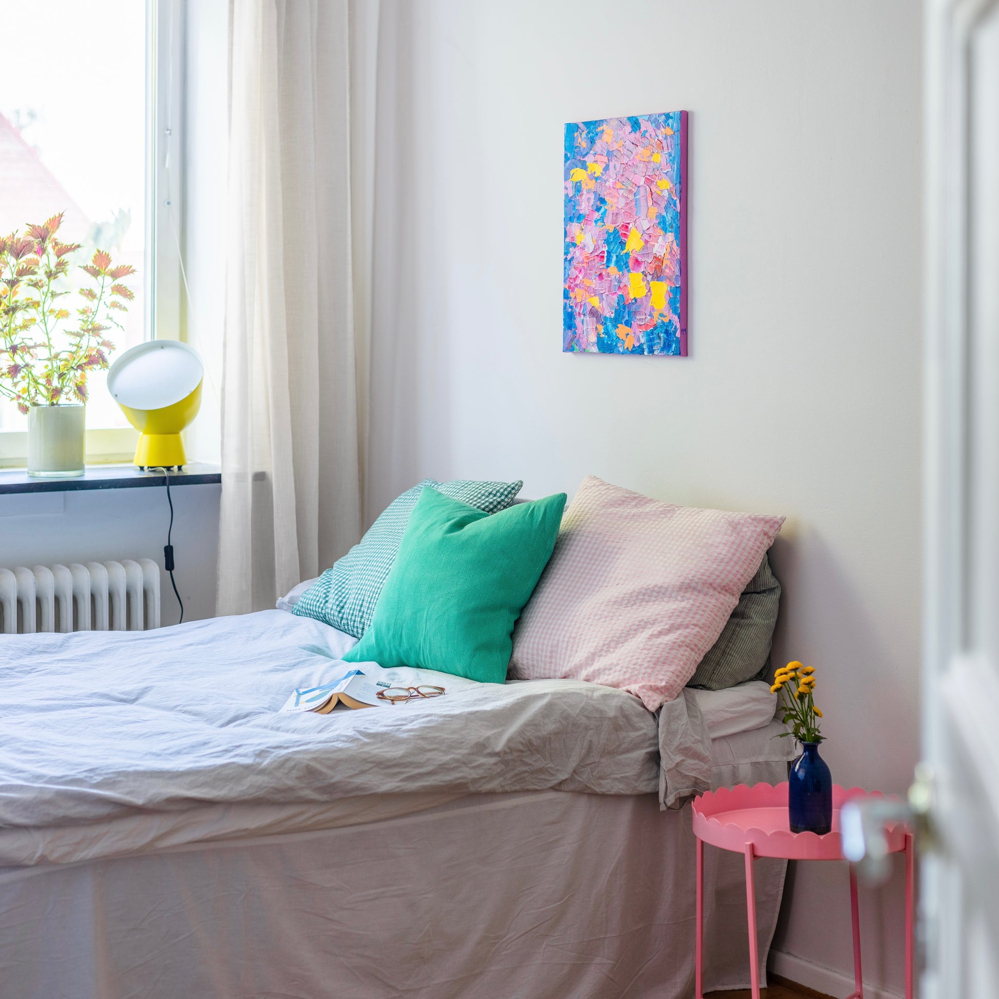 Klaras andra kludd is an original painting by Klara Collin, inspired by her very first piece, Kludd. With its playful blend of vibrant colors and thick, expressive strokes, this painting feels like a burst of energy, bringing a lively atmosphere — just like a party on the wall.