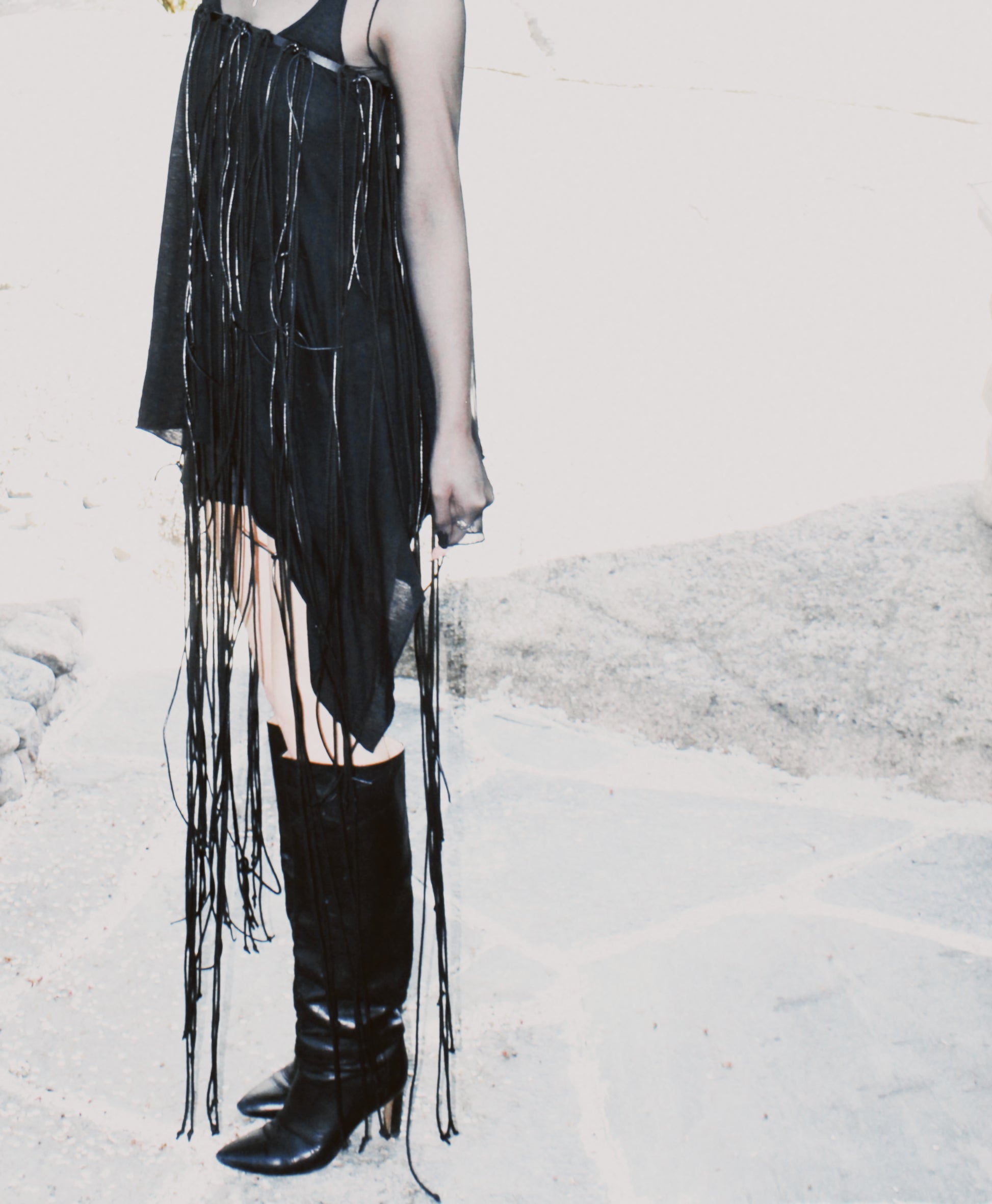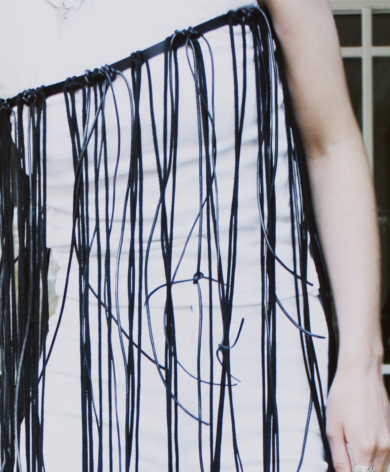 KNOTS HARNESS is a hand-knotted body accessory made from mixed materials. The belt, like life, moves with you and enhances any look. The knots appear at various lengths, symbolizing the ability to choose new paths along the journey.