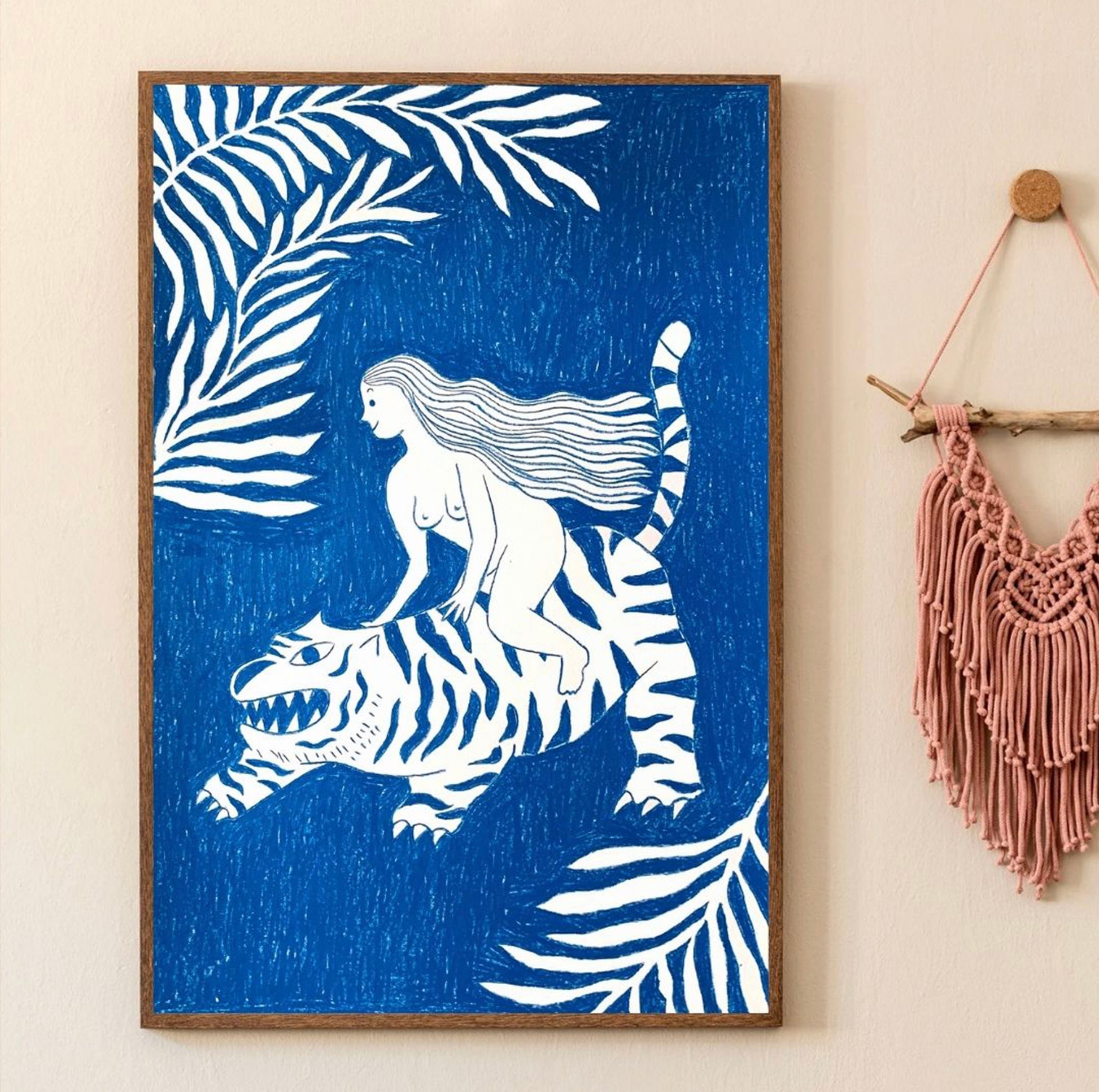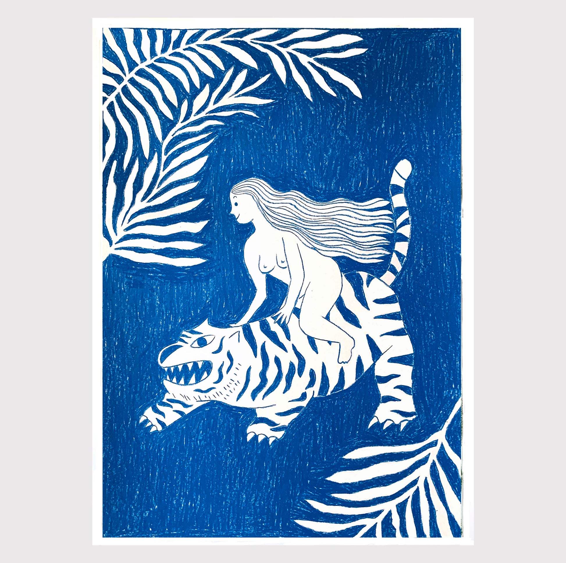 An empowering woman riding a tiger. Original painting, created with oil pastels in blue on 250g Materica paper, size 50 x 70 cm.
