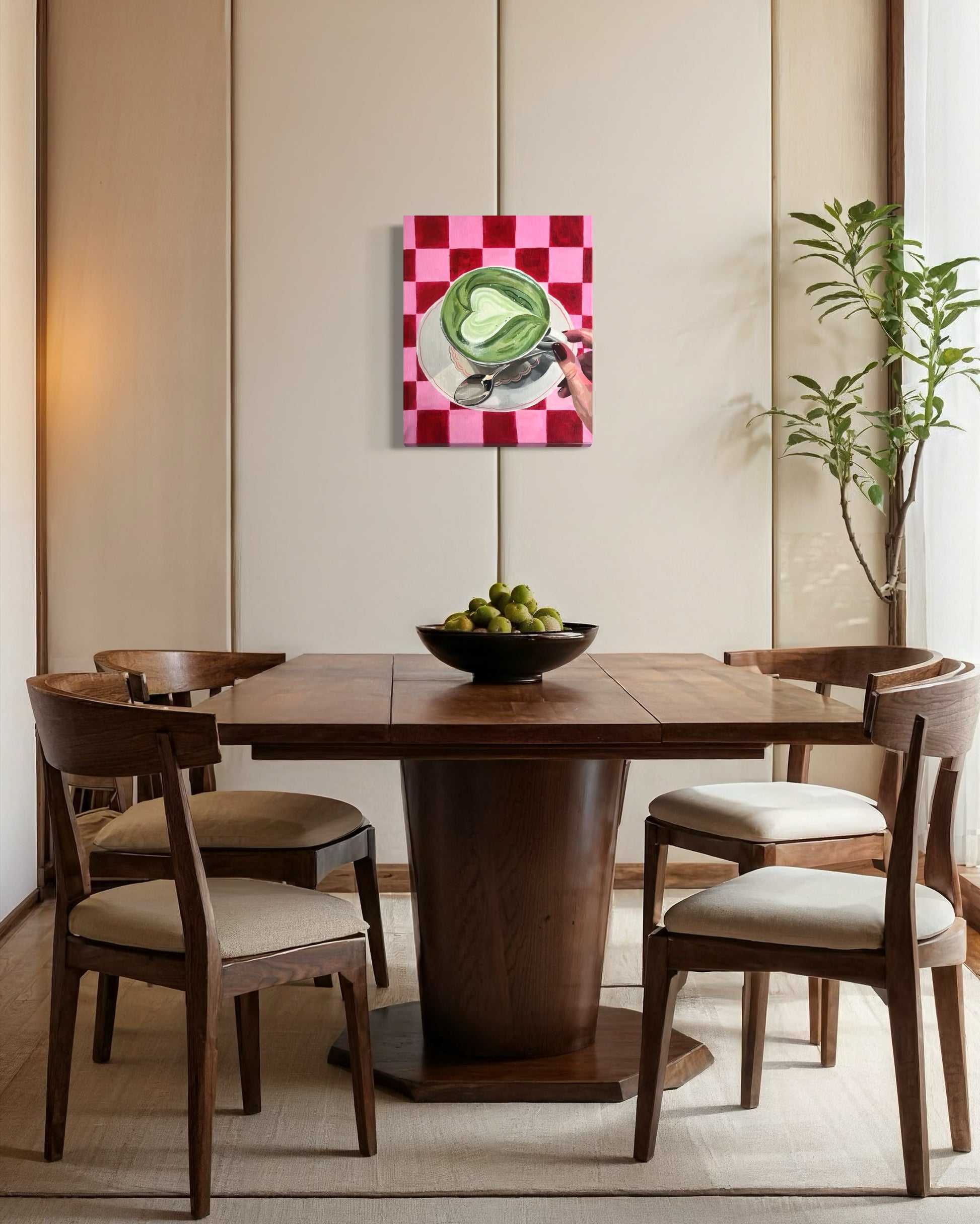 Matcha lovers - look over here! This is a handmade, colorful painting of a cup of matcha on a red and pink checkered background, made by the artist Julia Andersen. Make your home more unique and stylish with this feminine, joyful artwork.