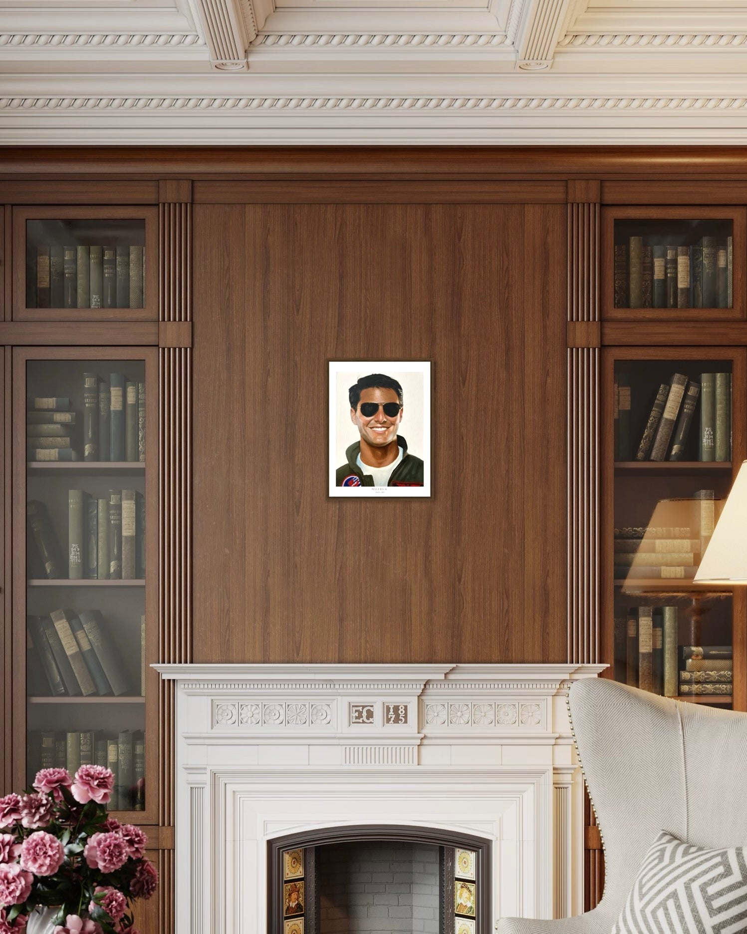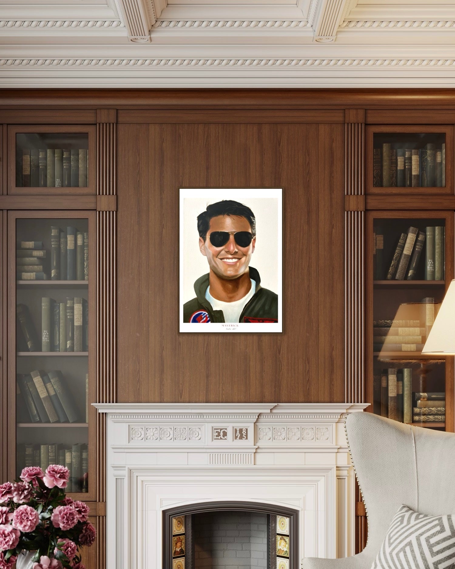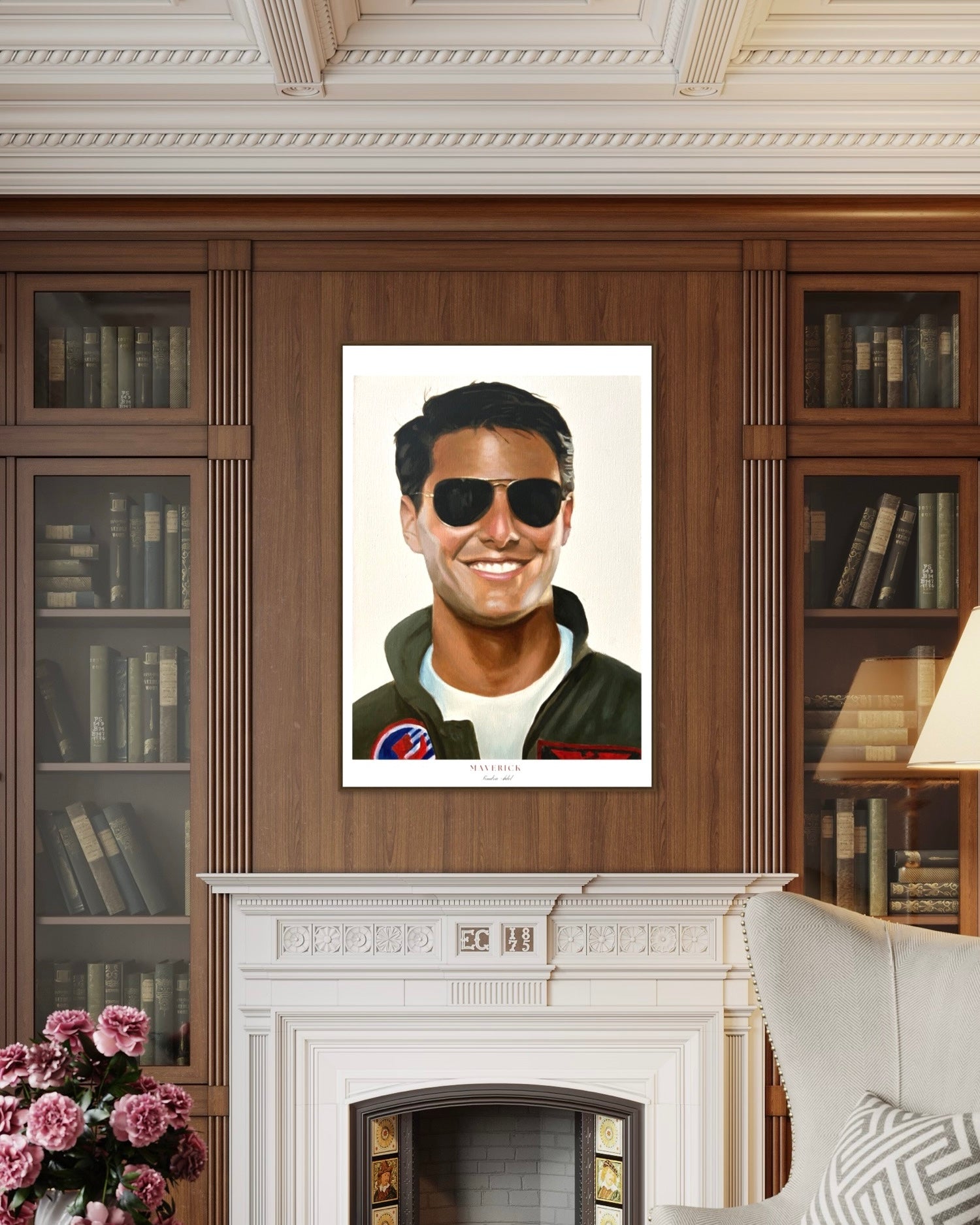 Poster of Tom Cruise in Top Gun 1986. Painted by Tindra Ädel. Museum-quality poster made on thick matte paper. ”Maverick”-text is dark red. Frame not included!