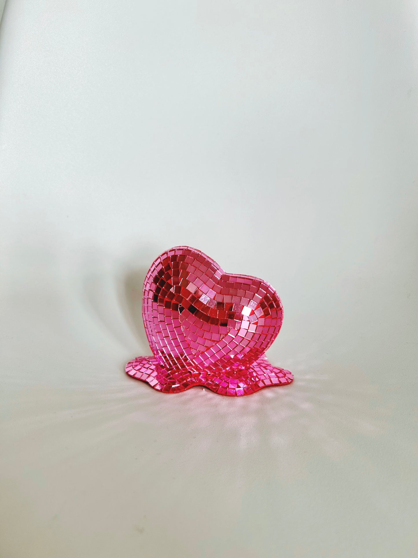 The perfect disco ball to gift to someone you love, or to yourself! This disco ball is a romantic and playful interpretation of a melting heart – perfect for spreading love in any room! It is handcrafted from styrofoam and clay, then painted in a pink shade, with pink mirror tiles placed on top.