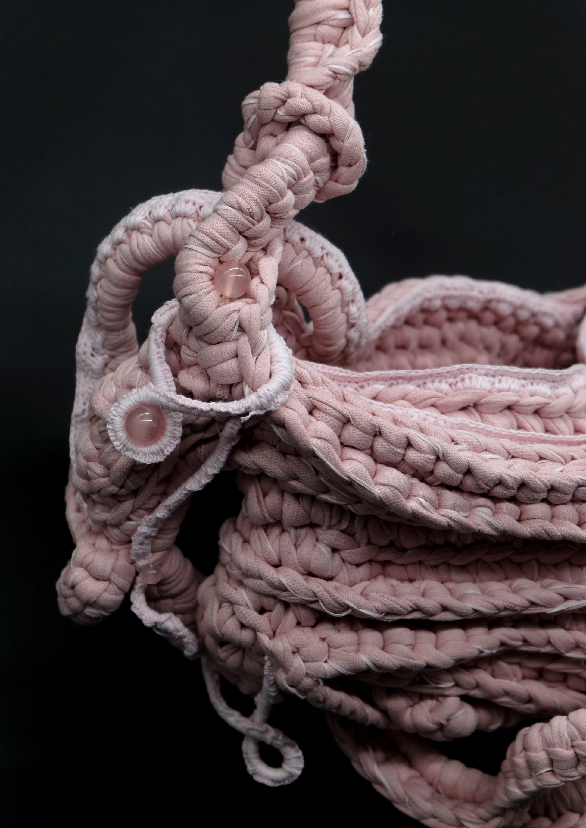 Crocheted in soft, blush-pink tones, Embellished with intricate details and vintage rose quartz beads like three ripe berries as the fruitious jewels of nature.
