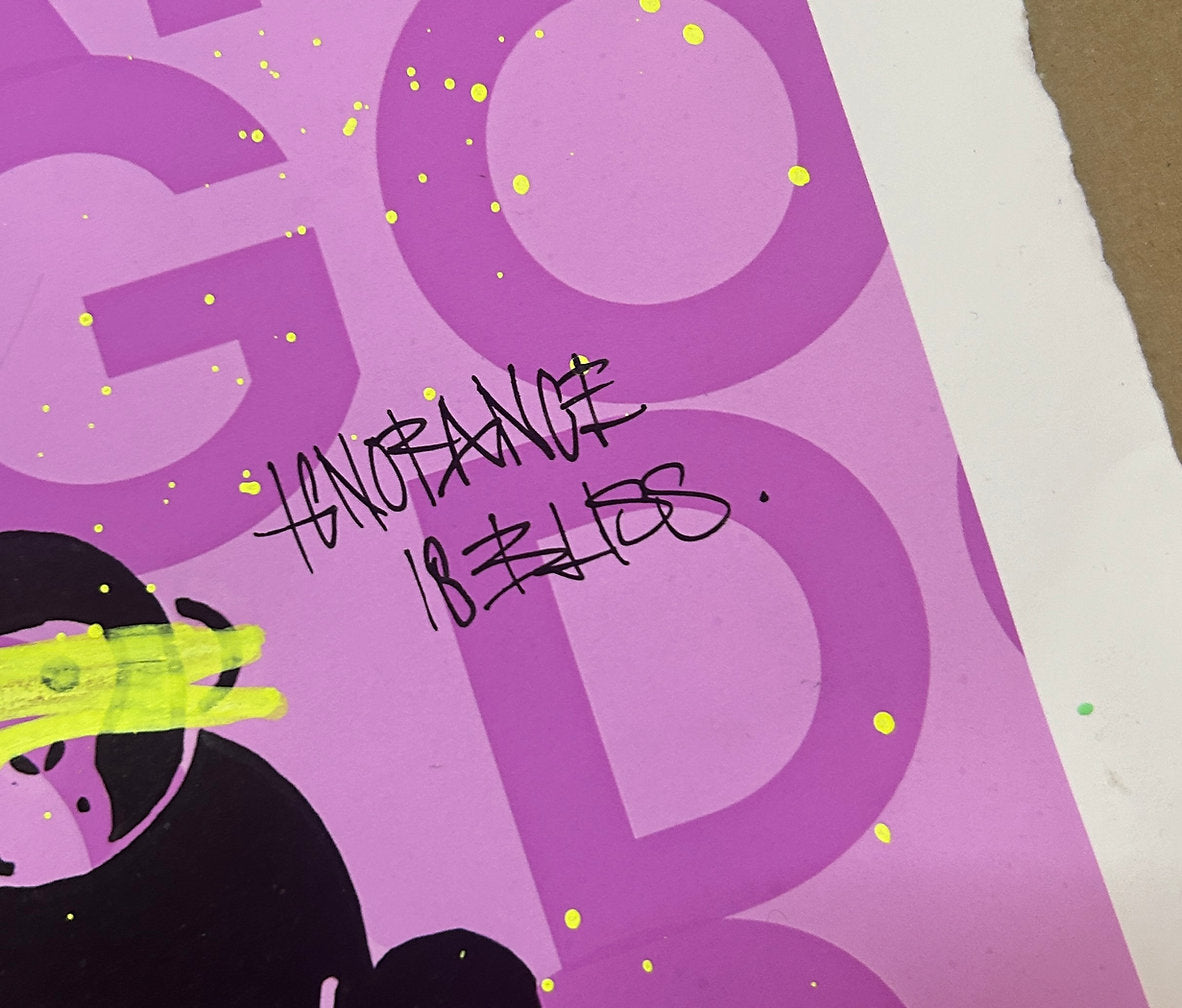 Every print is enhanced with hand-painted details, varying color accents, a shimmering “text halo,” and occasionally a handwritten comment – creating infinite combinations where no two pieces are ever the same. It’s an open edition, but each print carries its own soul.