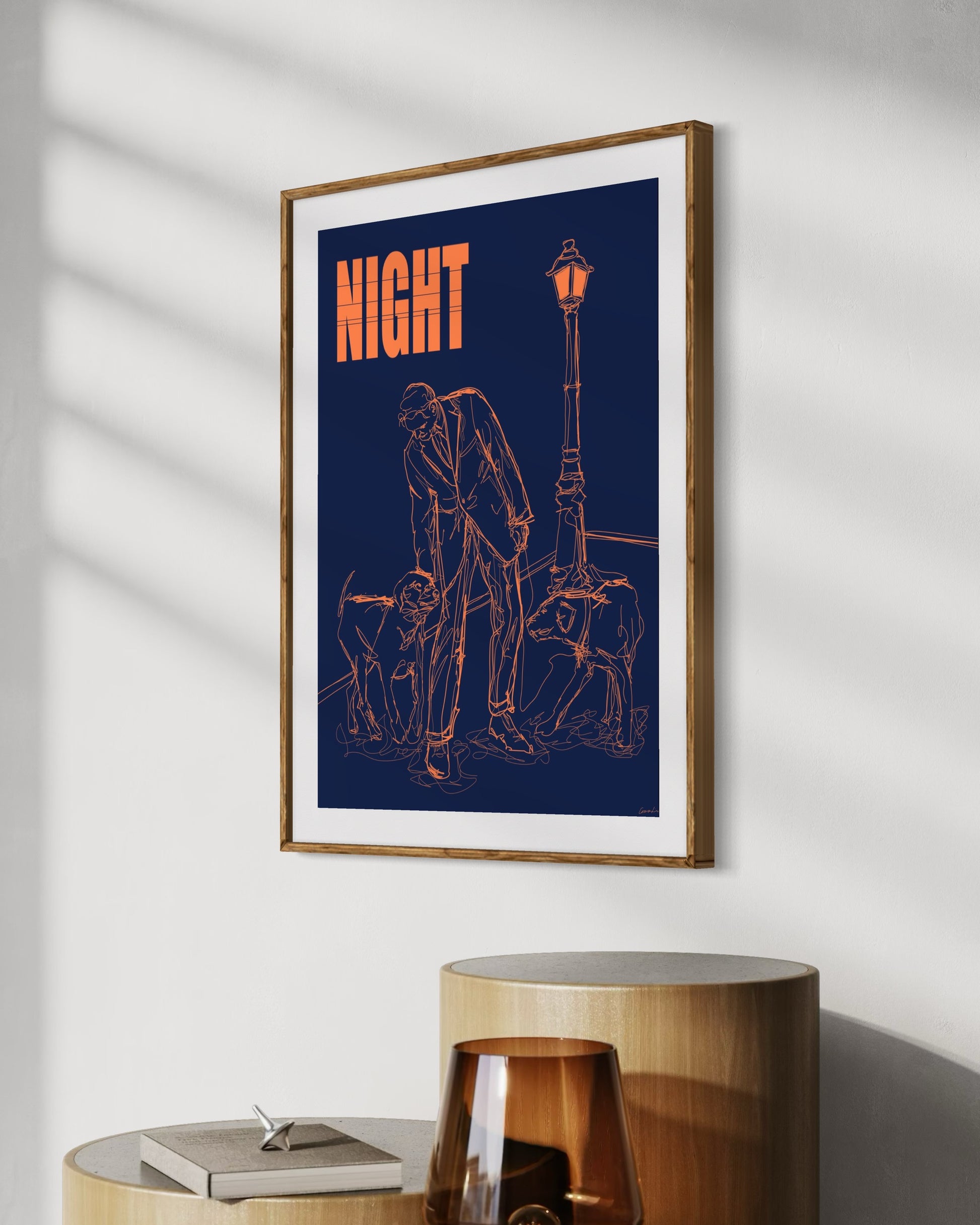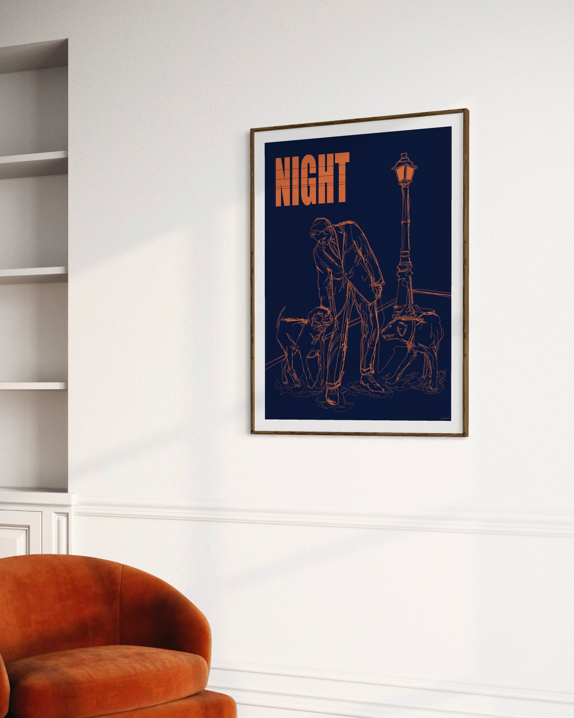 Capture the mystery and elegance of evening with “Night”, part of the poster series “A Day” created by Emma Lisnell. Featuring bold, golden-yellow line art and typography against a deep, navy blue background, this artwork evokes the quiet stillness and allure of the night. The high-contrast color palette and clean design make it a striking addition to modern, minimalist, or eclectic interiors.
