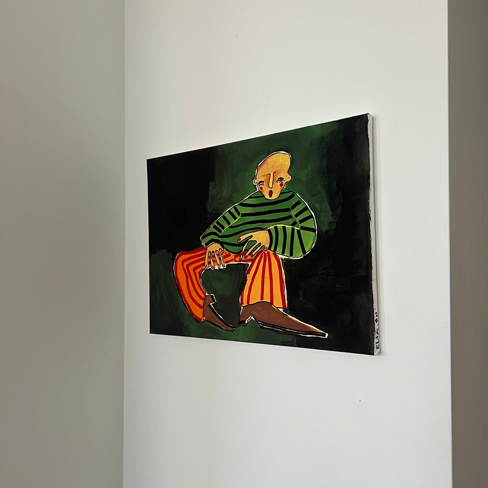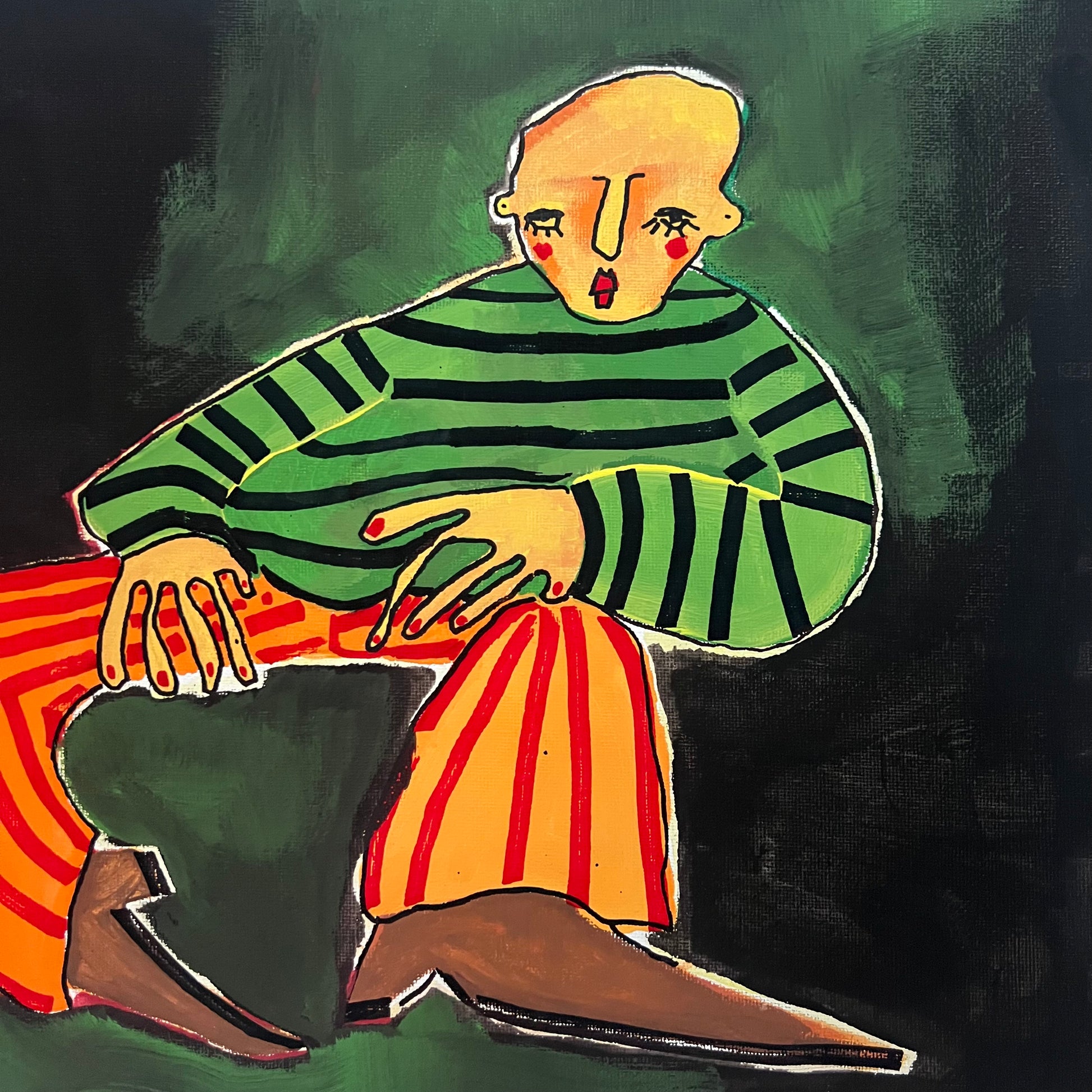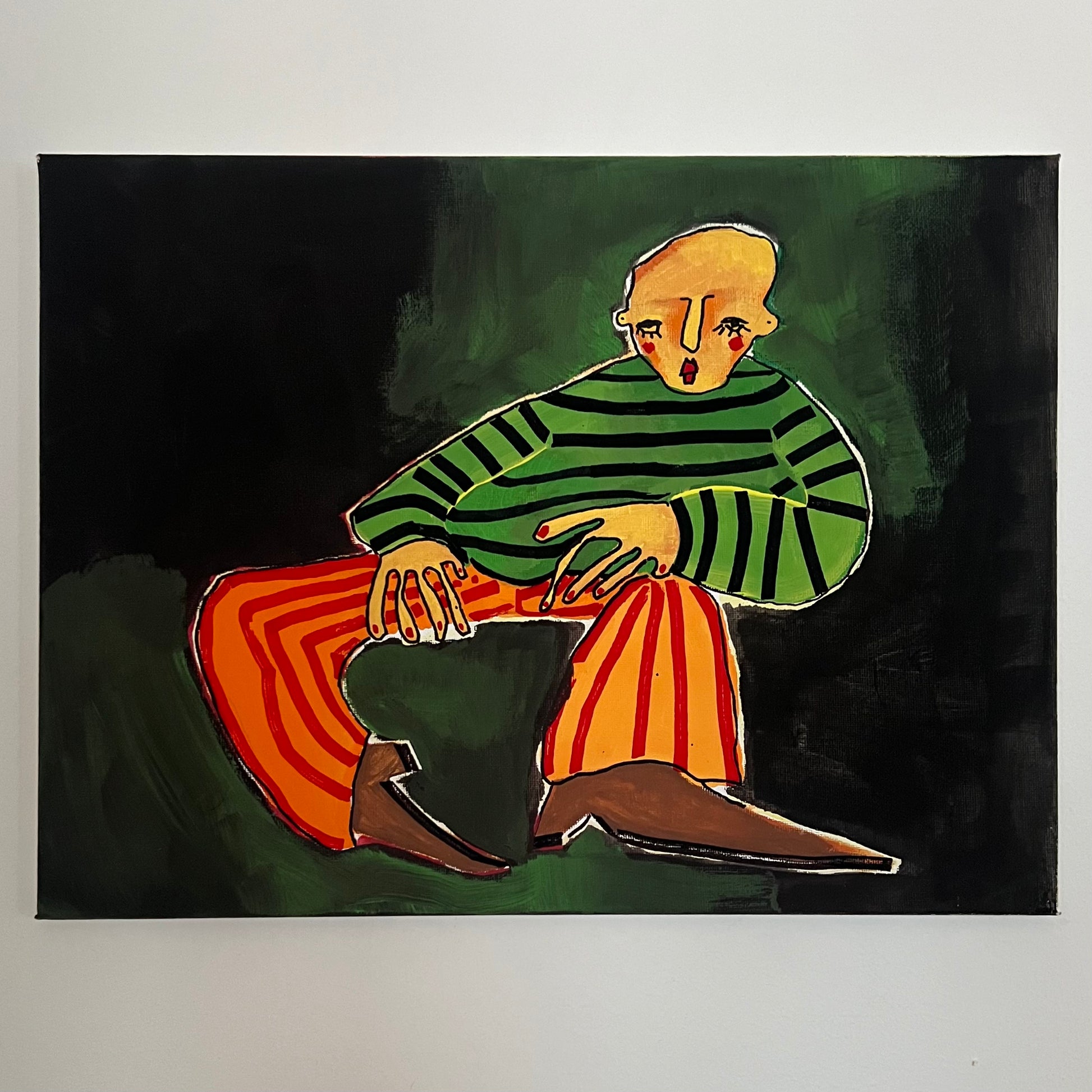 This is a painting depicting a person sitting in an unknown place.