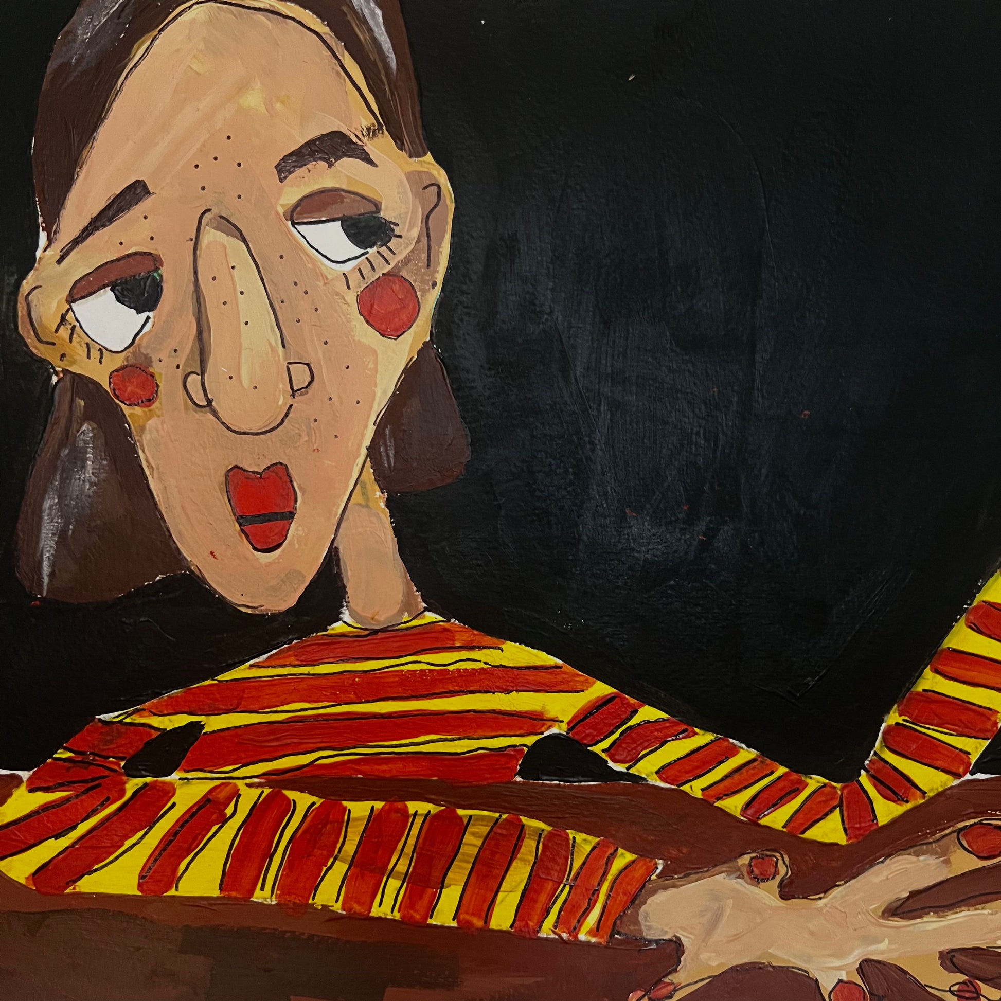 Portrait of an unknown person sitting in darkness wearing a striped shirt and a scarf.