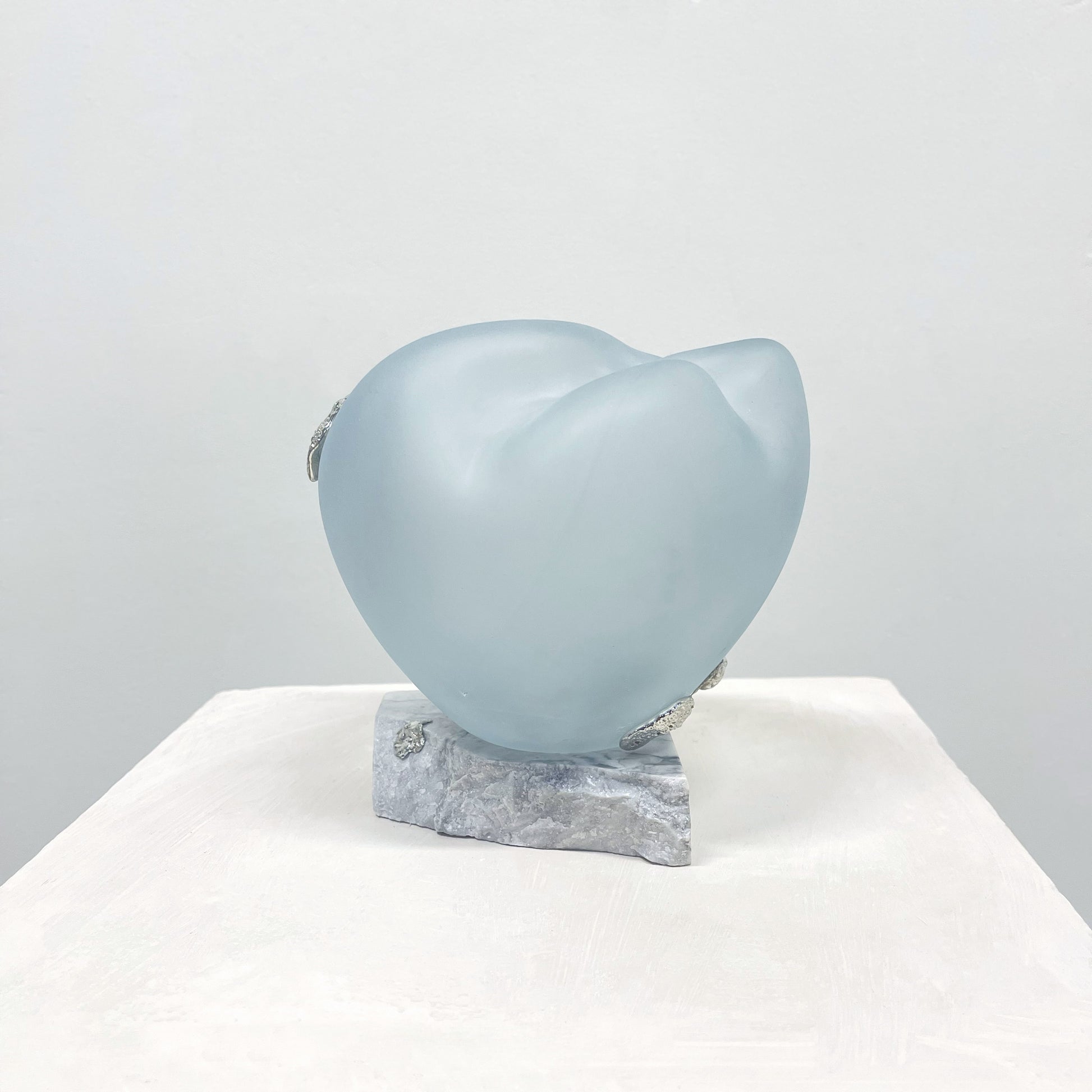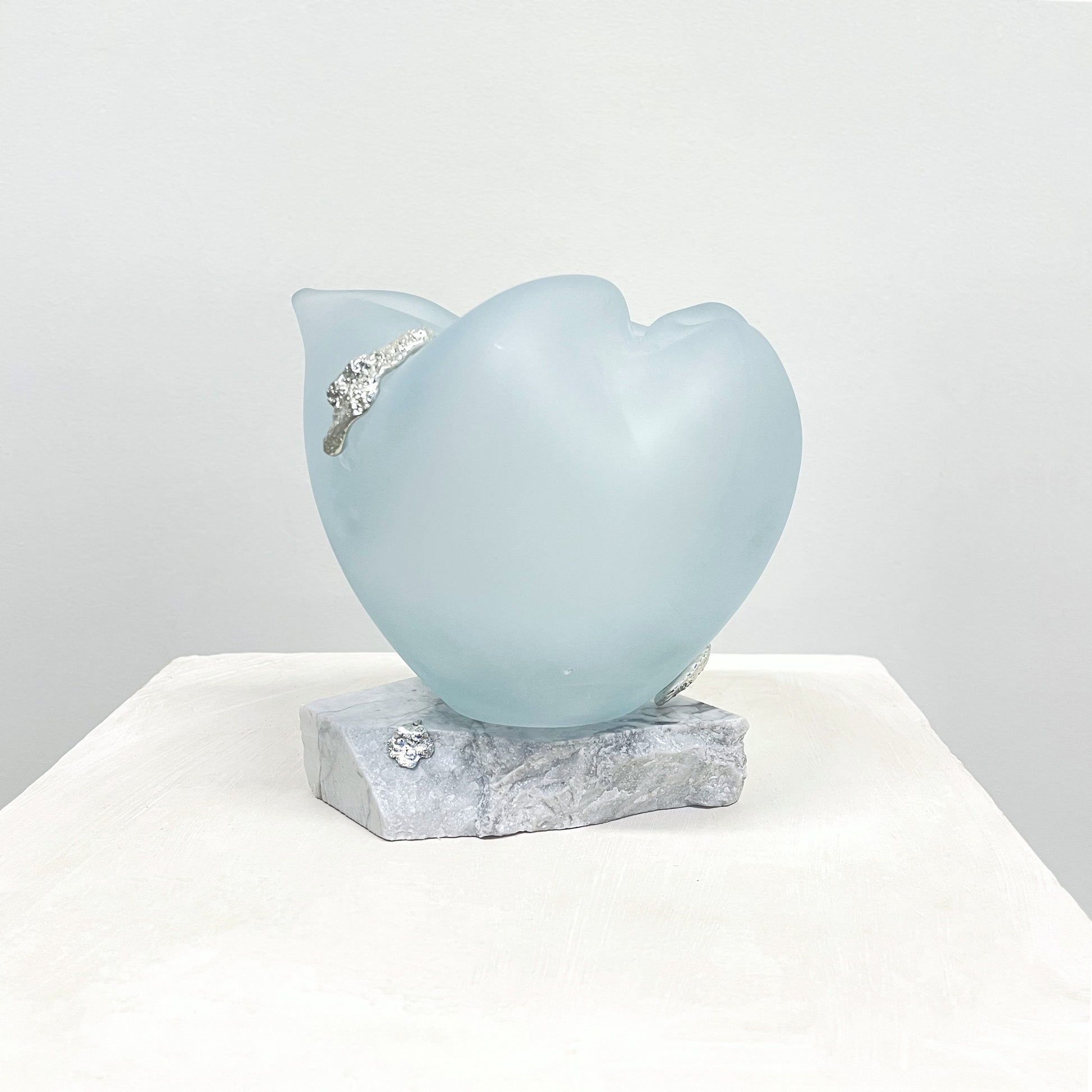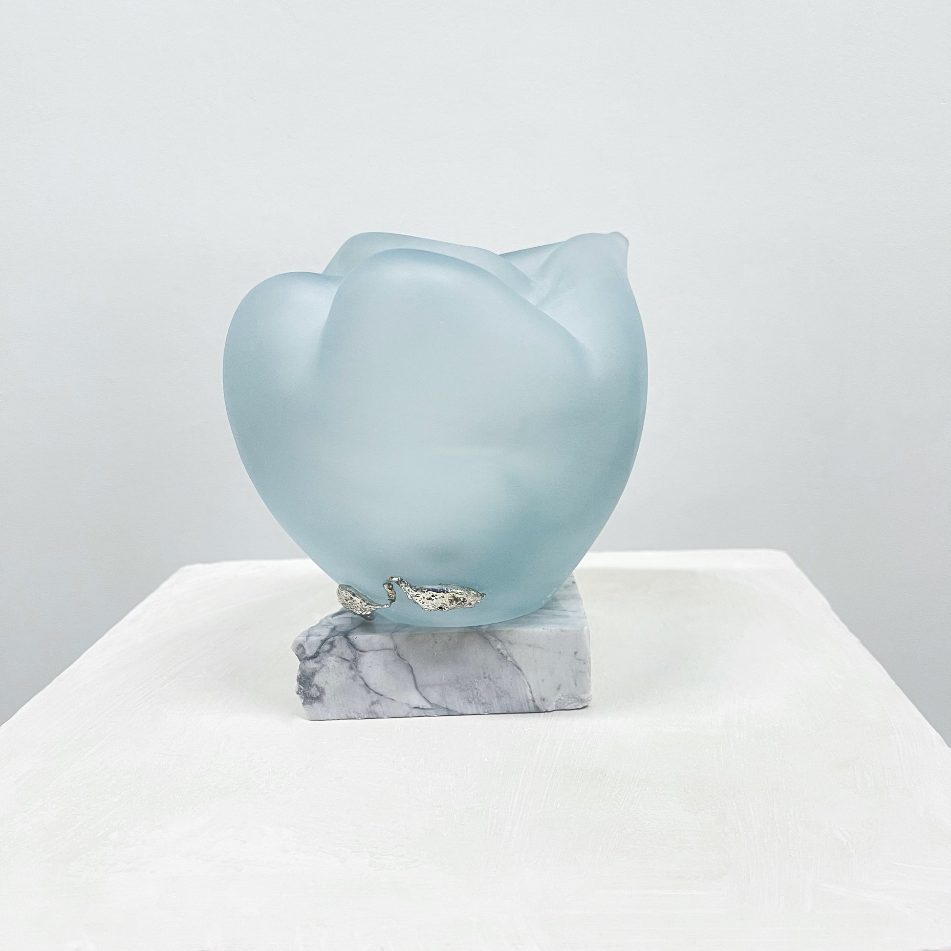 Sculpture in mouth-blown blue glass, sandblasted, with details in sand-cast tin. Mounted on a base of 3 cm thick Carrara marble.