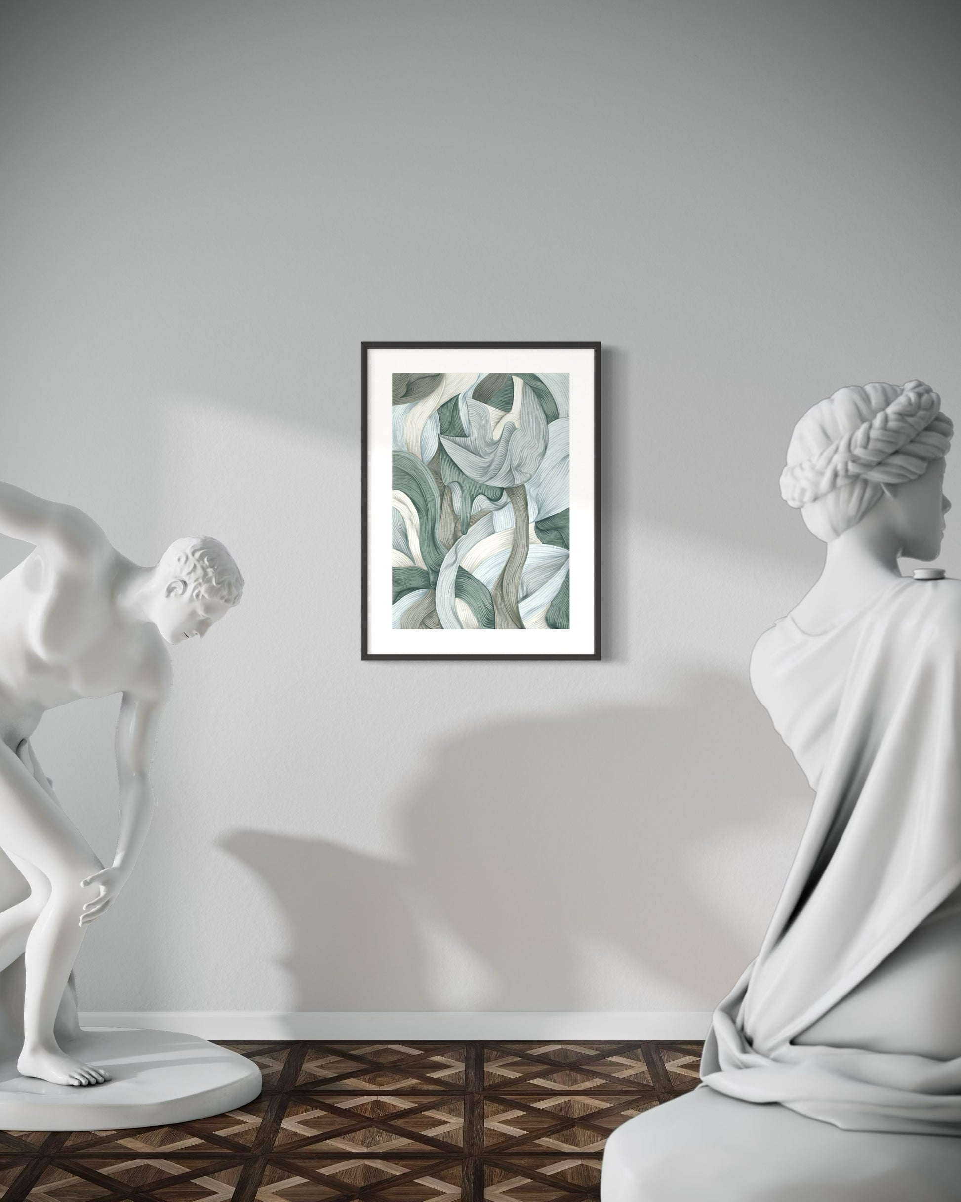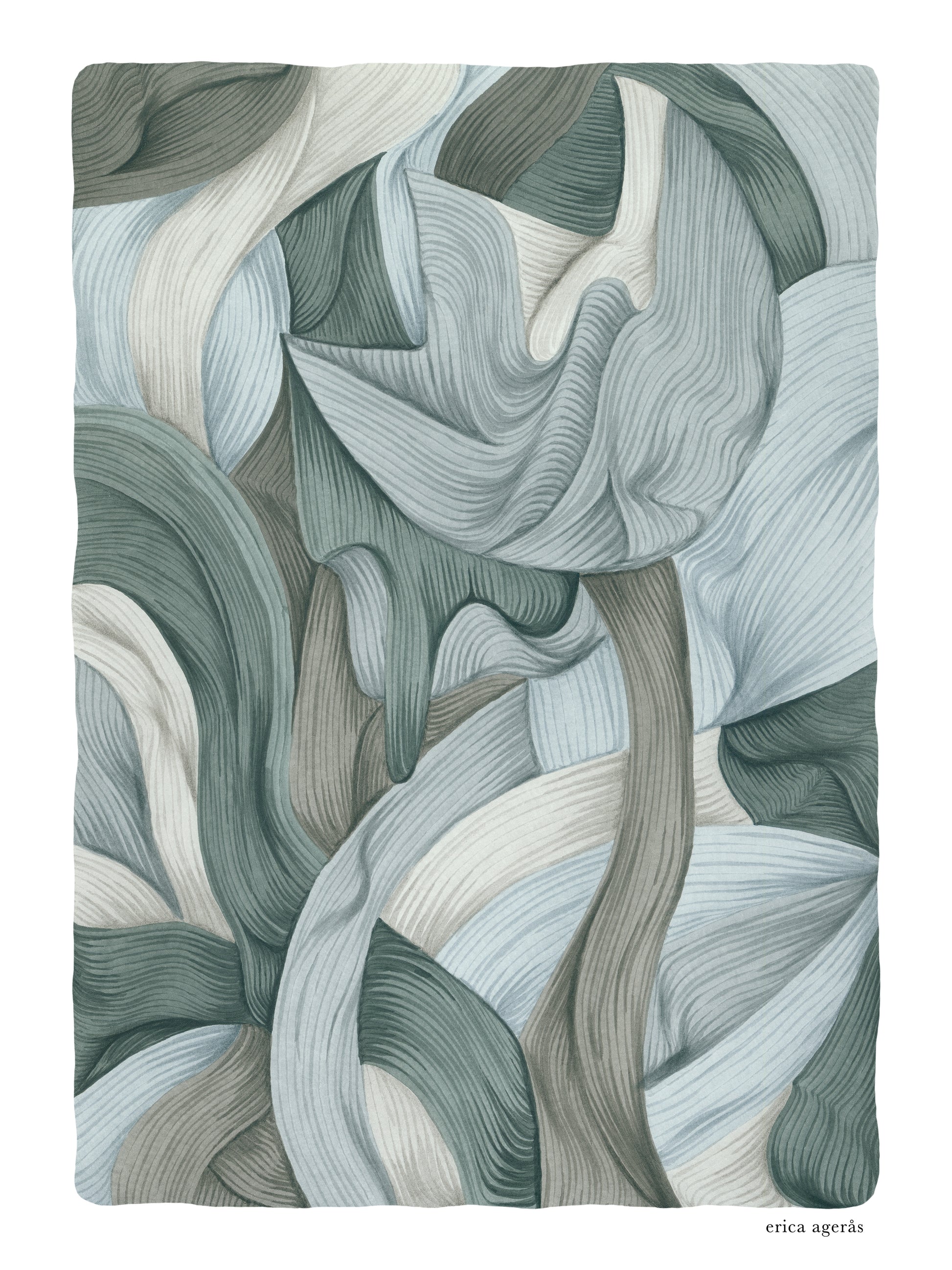 This art poster features the abstract artwork "One is drained" by Erica Agerås. With its soft, flowing shapes and muted green-gray tones, the piece captures a sense of introspection and calm—perfect for bringing a modern, meditative mood into your home.