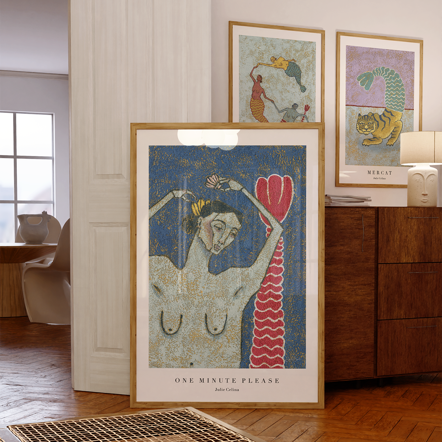 This print belongs to the collection, Sisters of the Sea, about swimming down the stream to new beginnings, and letting yourself be open to magic and wonder. This print has been photographed and edited so it resembles the original oil painting as much as possible. The original painting is highly textured to give the illusion that it has been painted directly on a rock or a weathered wall, which comes through clearly and beautifully in the print. This print will look great as a part of a gallery wall together with other beloved pieces, or as a stand alone artwork in any space.