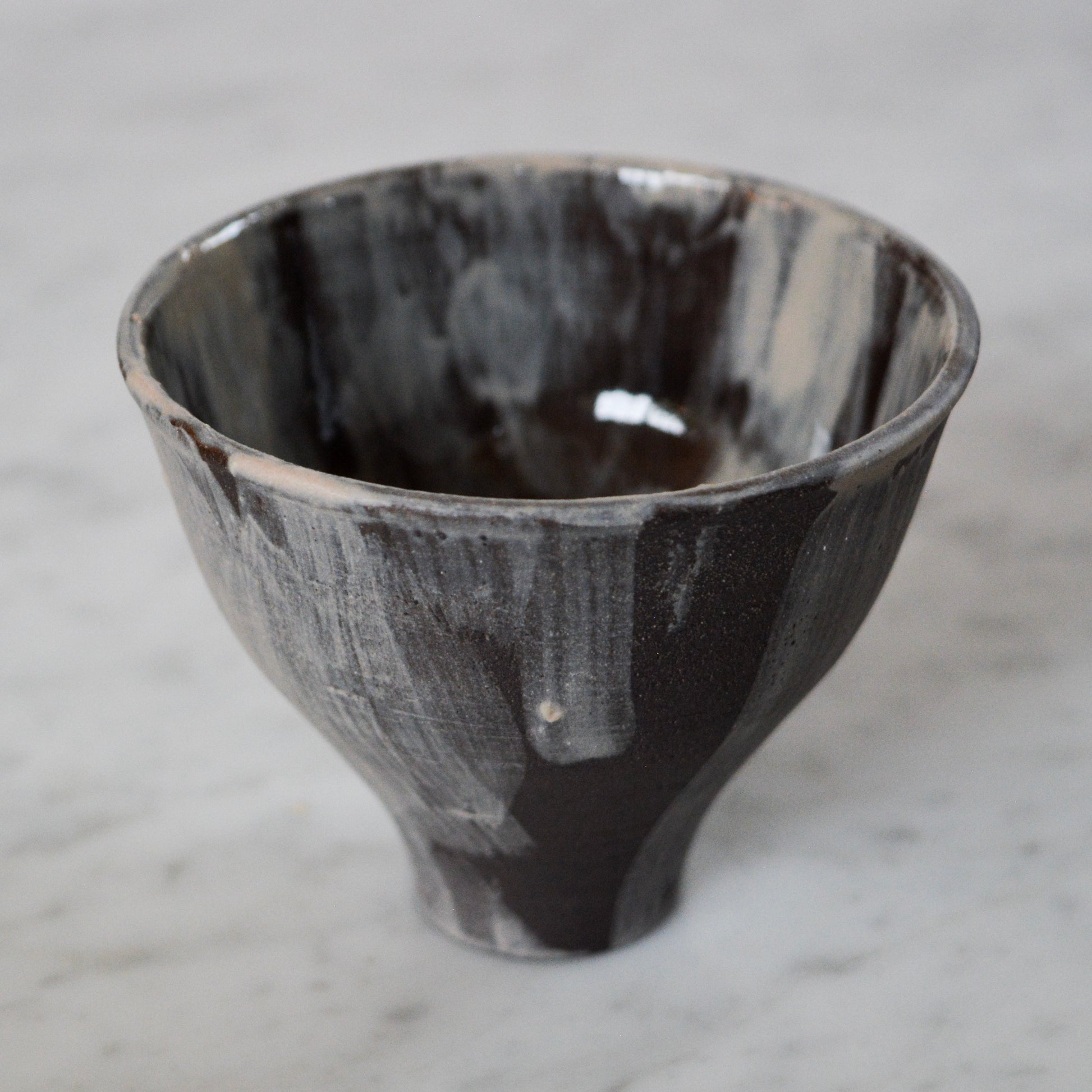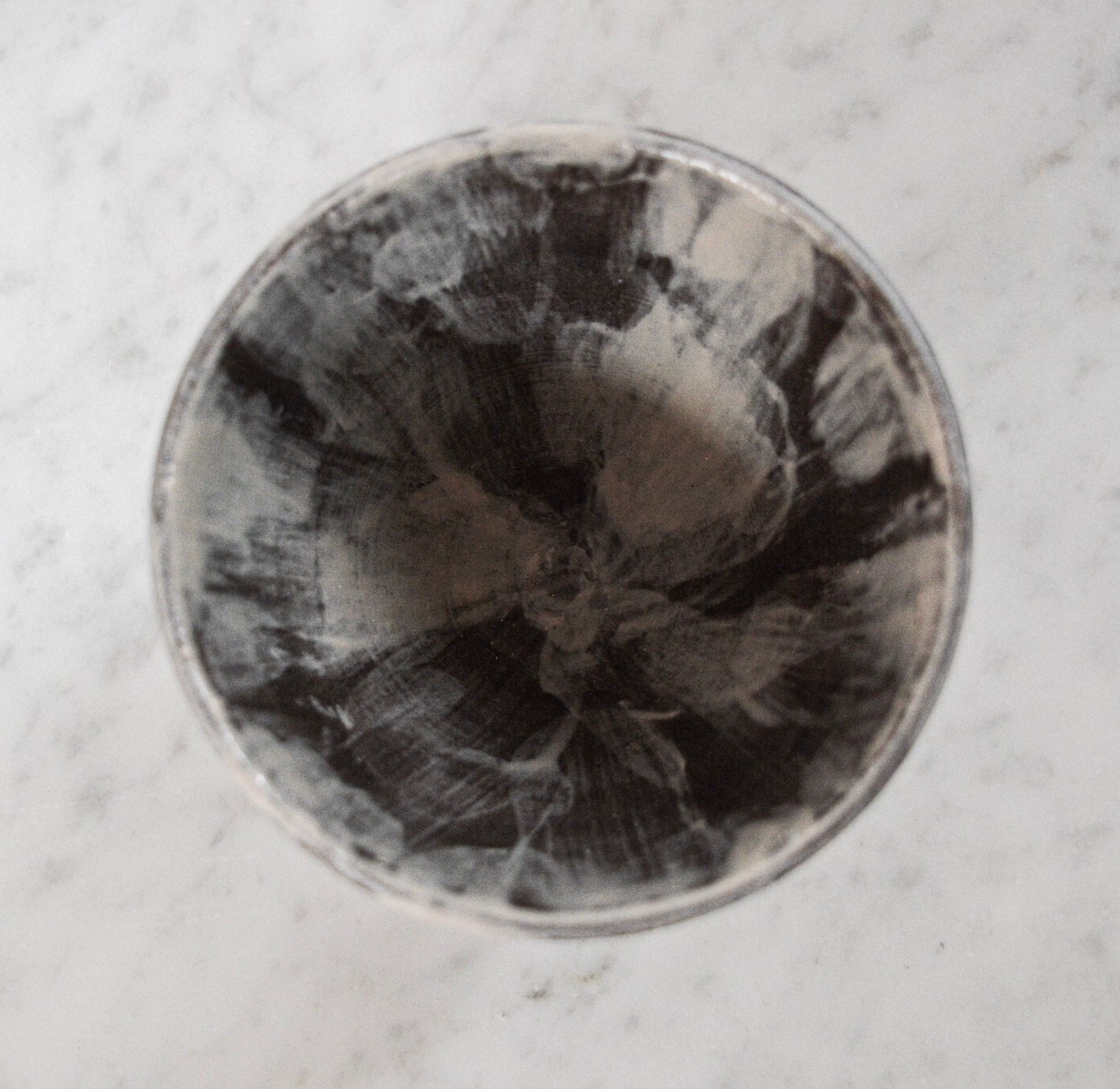 A unique hand-turned bowl in black stoneware clay, painted with light engobe. The inside is covered with a transparent glaze and the outside is left raw.