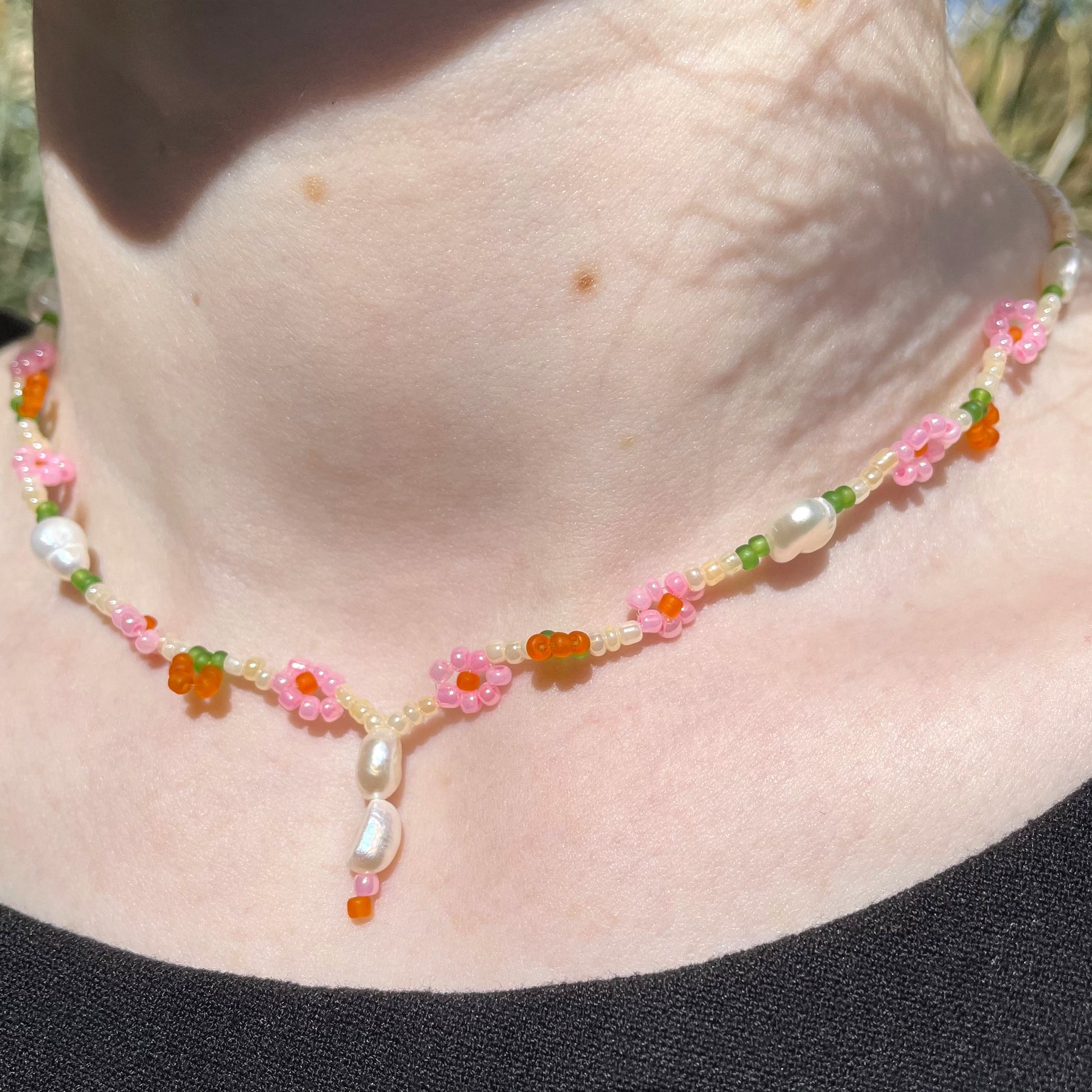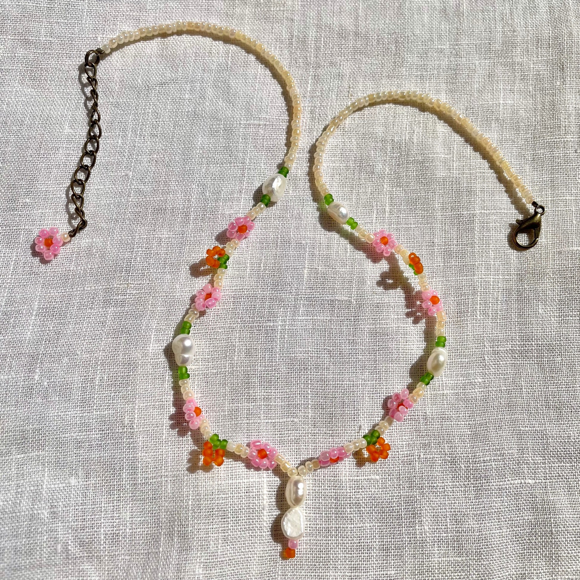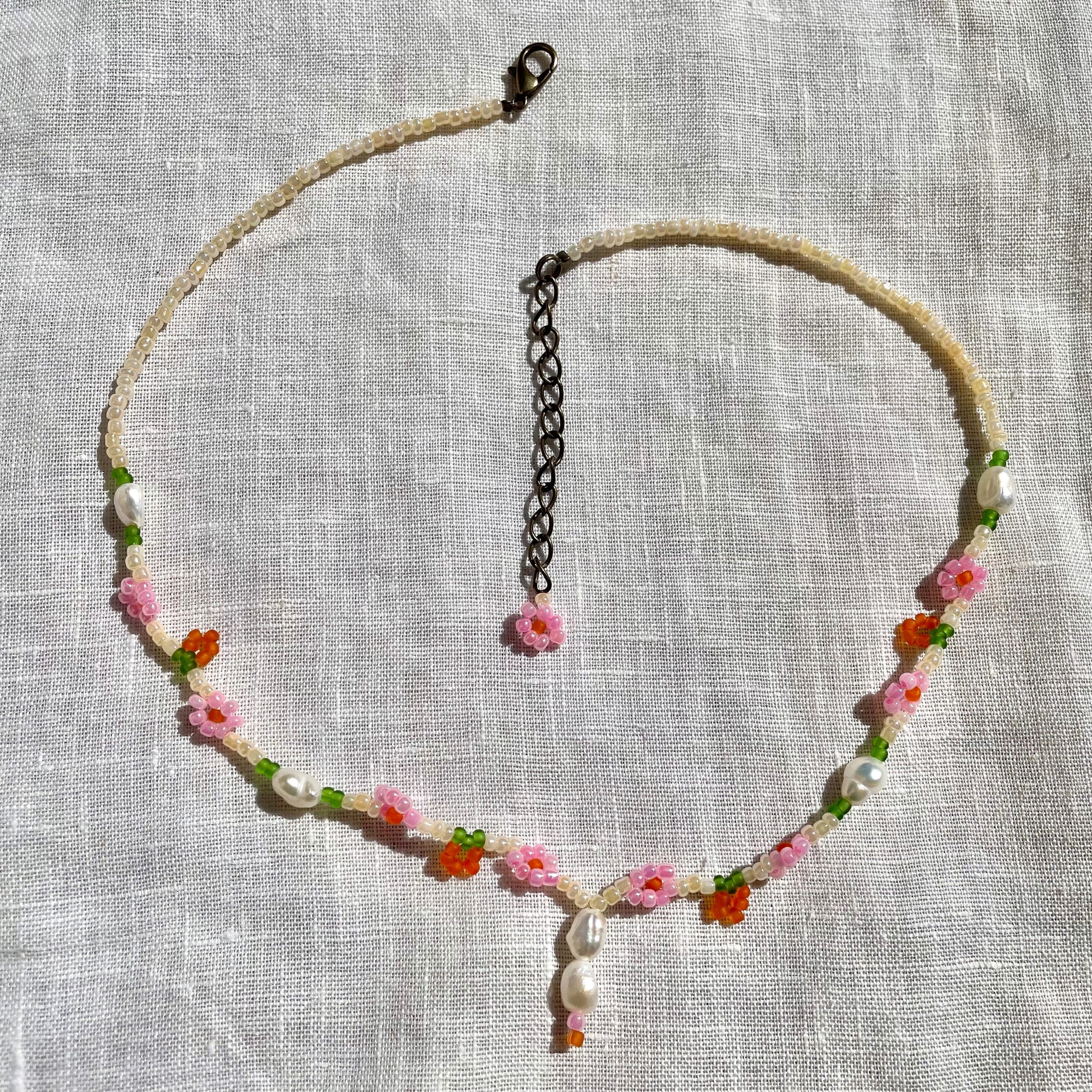A beaded necklace with peaches and pearls is handmade with love and care. Inspired by ’90s aesthetics, it brings back nice memories and emotions.