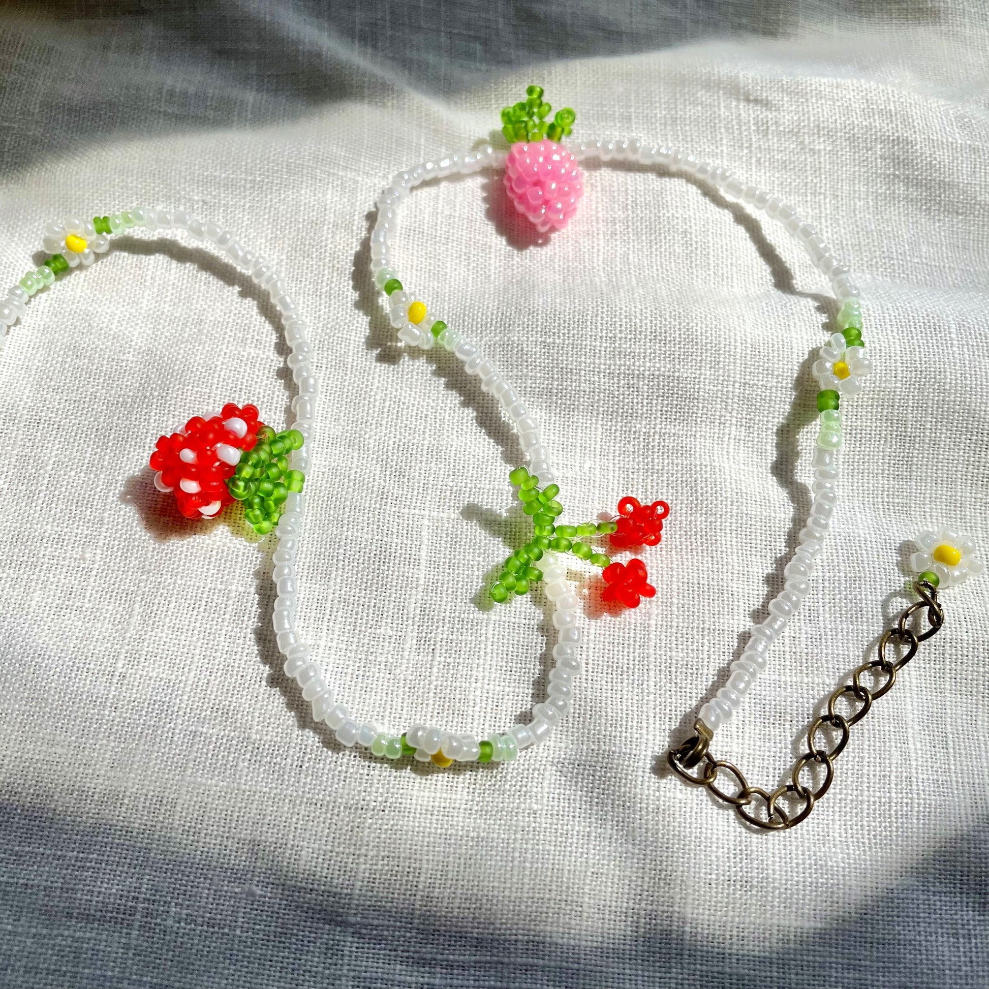 A daisy flower beaded necklace with summer berries is handmade with love and care. Inspired by fruity summer vibes, it will bring colourful positive feelings to its owner.