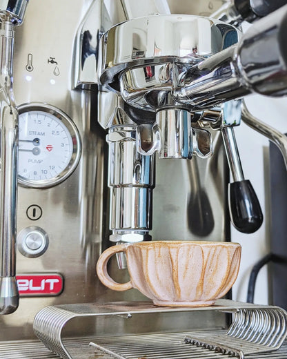 Thrown on the wheel and carved by hand, these espresso cups are great for hitting your caffeine needs. They are made from a dark-grey stoneware clay, with white glaze on the inside, and pink on the outside.