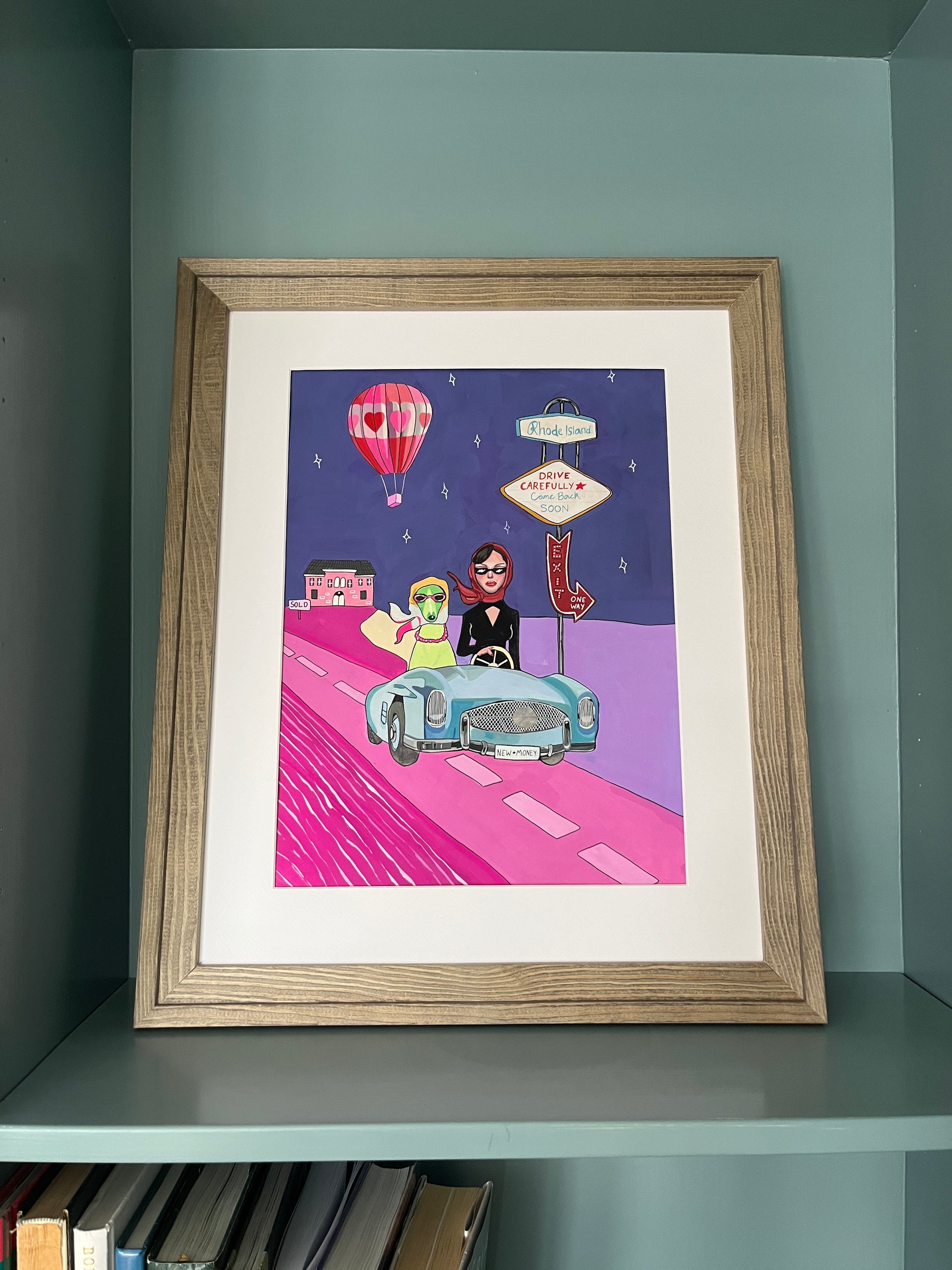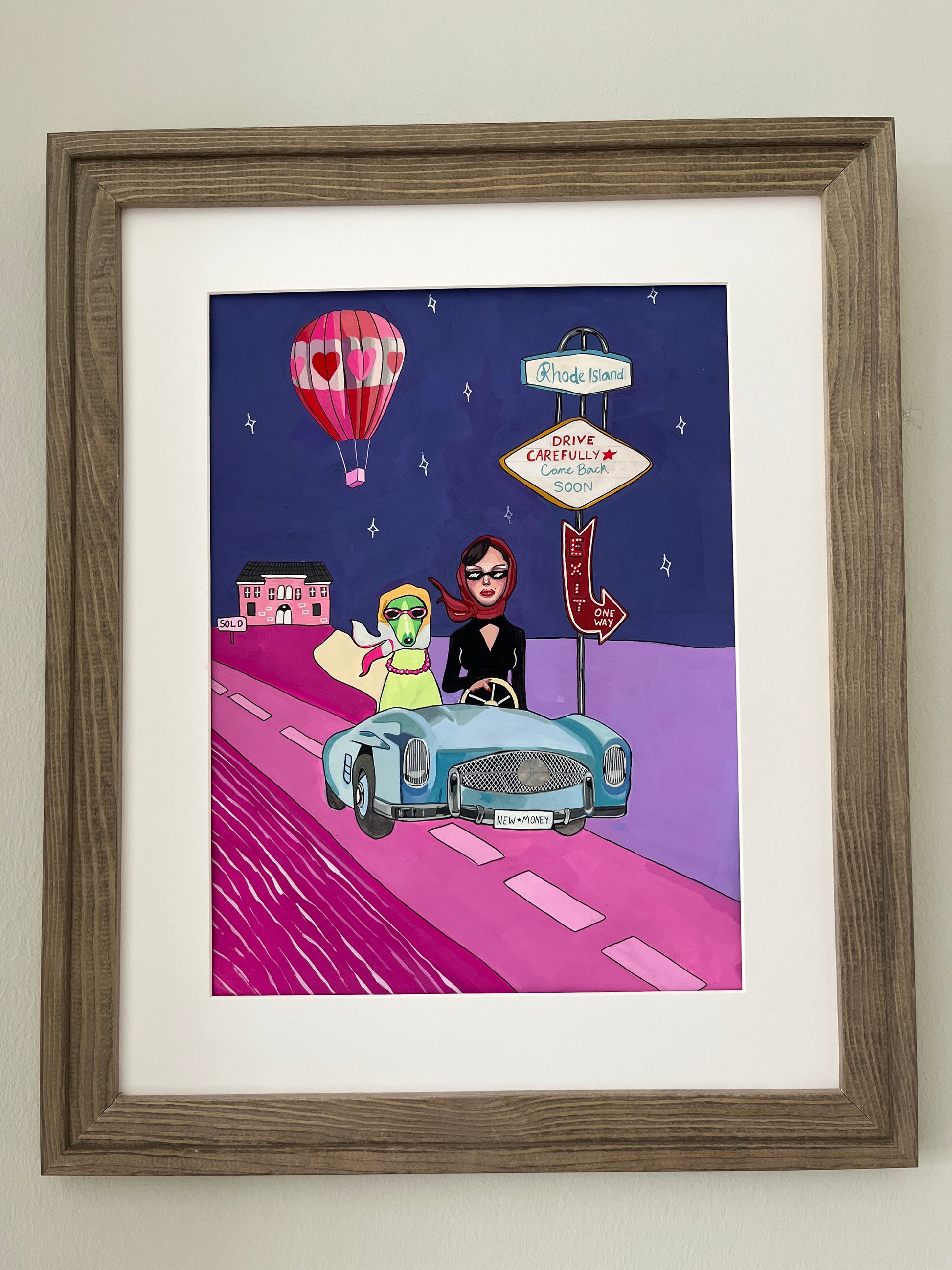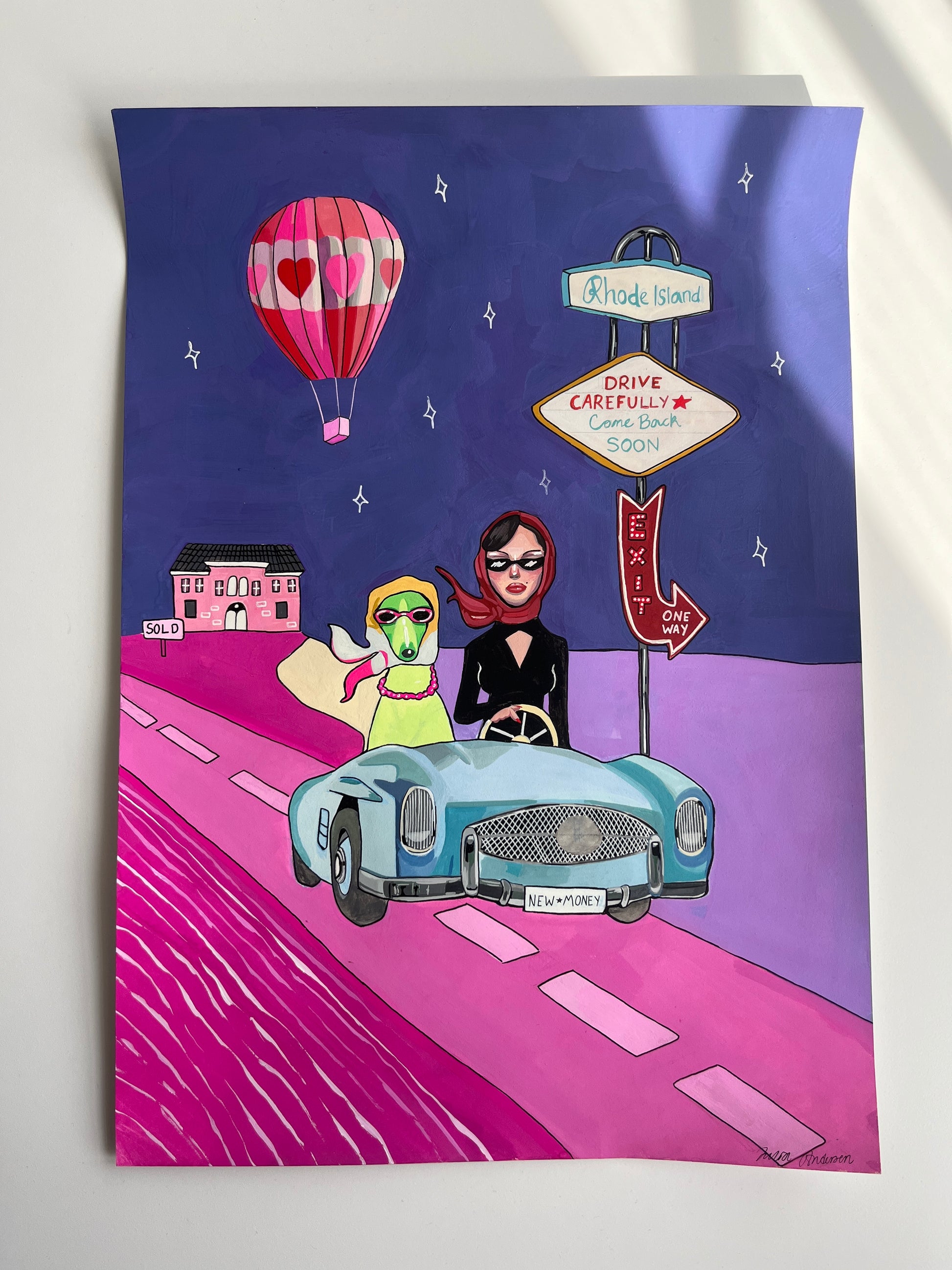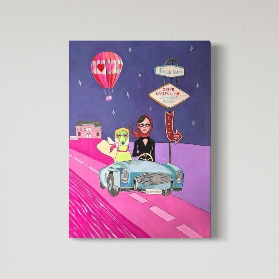 Julia Andersen's handmade painting with a playful motif of a dog and woman riding a car. This is a colorful, imaginative and unique art piece that definitely will add style and personality to your wall!