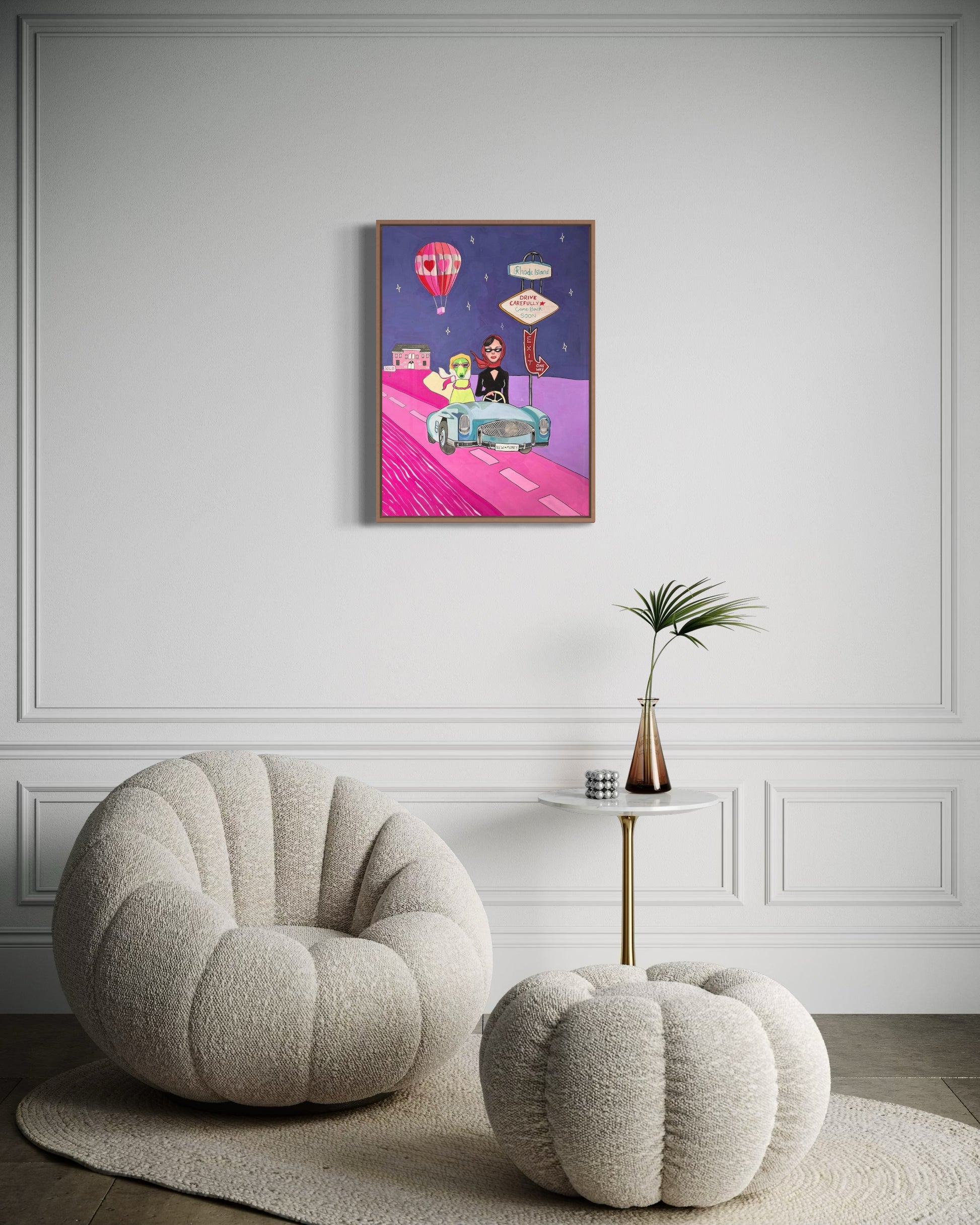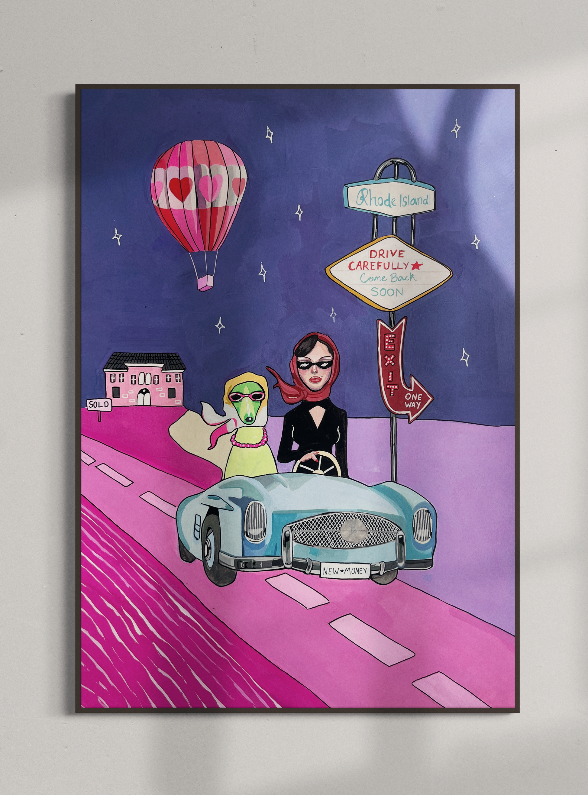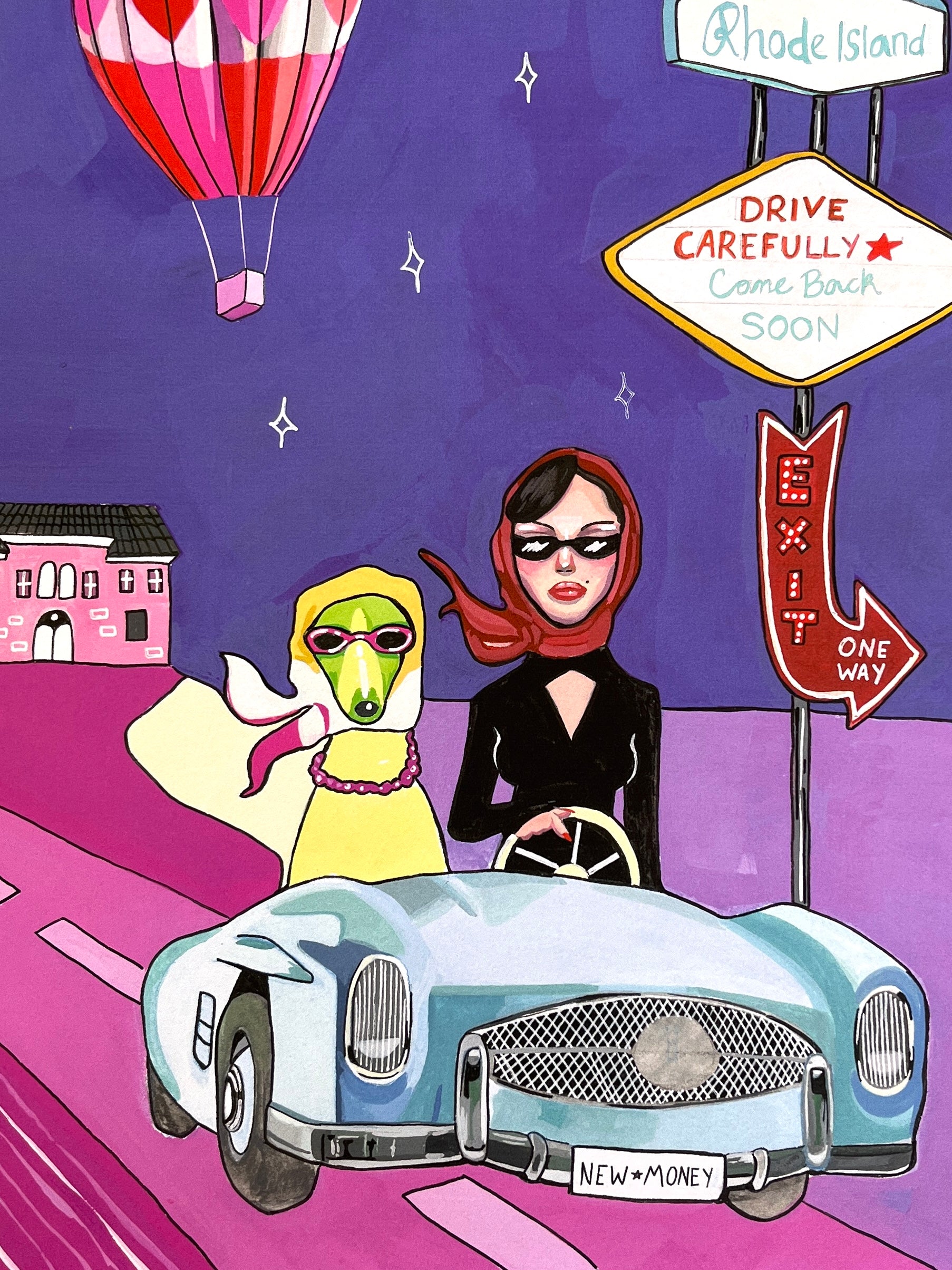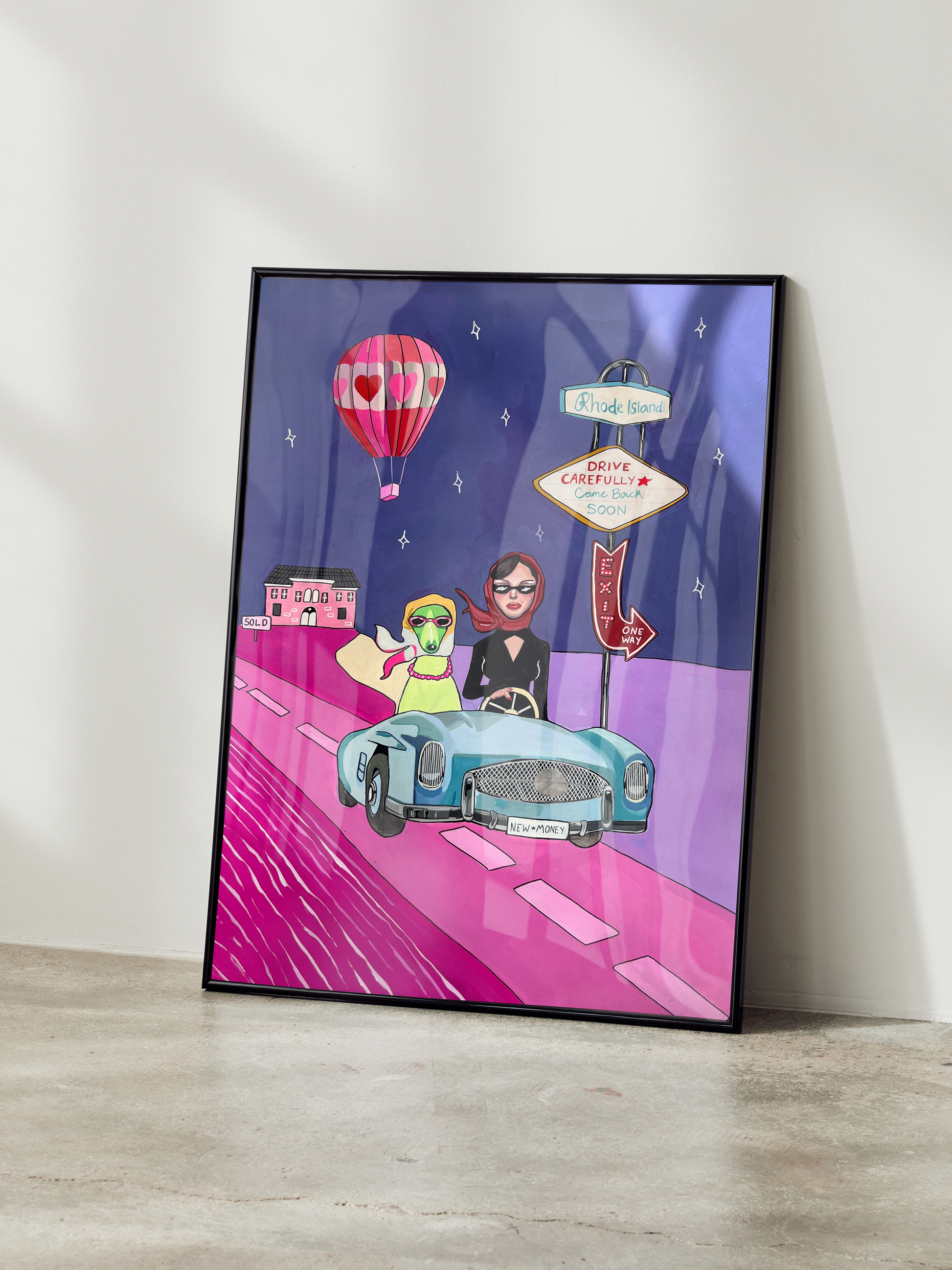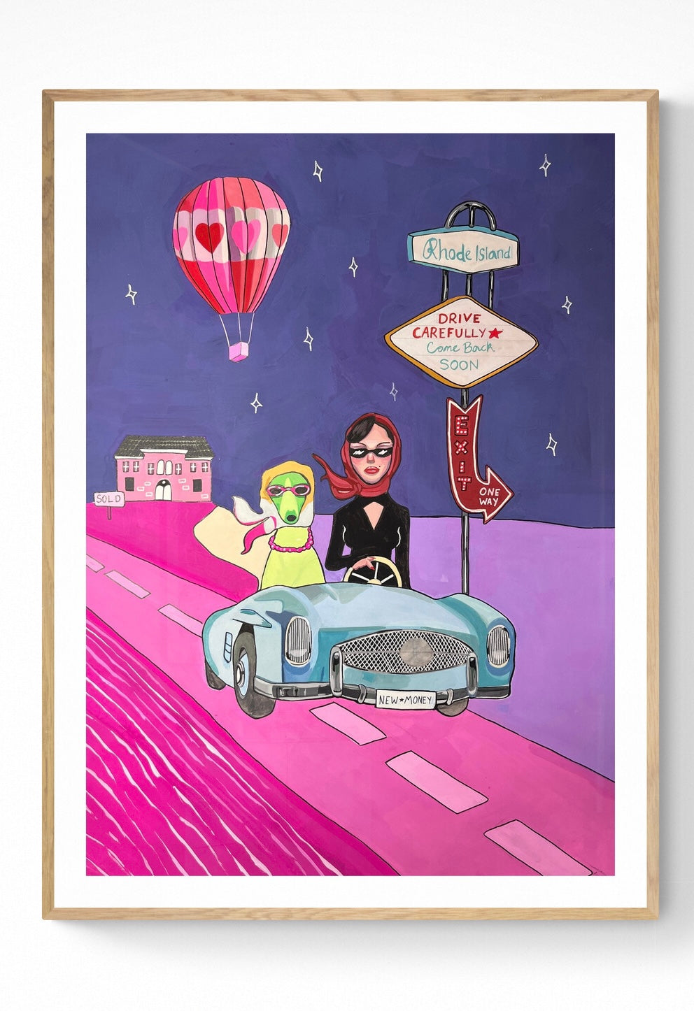 Julia Andersen's high quality poster with a playful motif of a dog and woman riding a car. This is a colorful, imaginative and unique art piece that definitely will add style and personality to your wall!