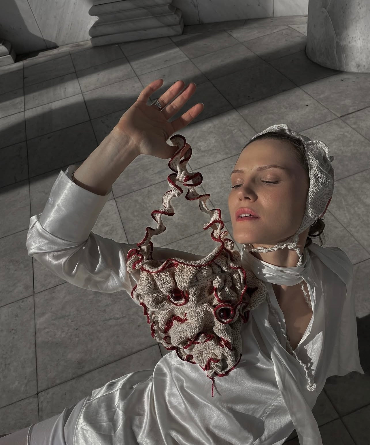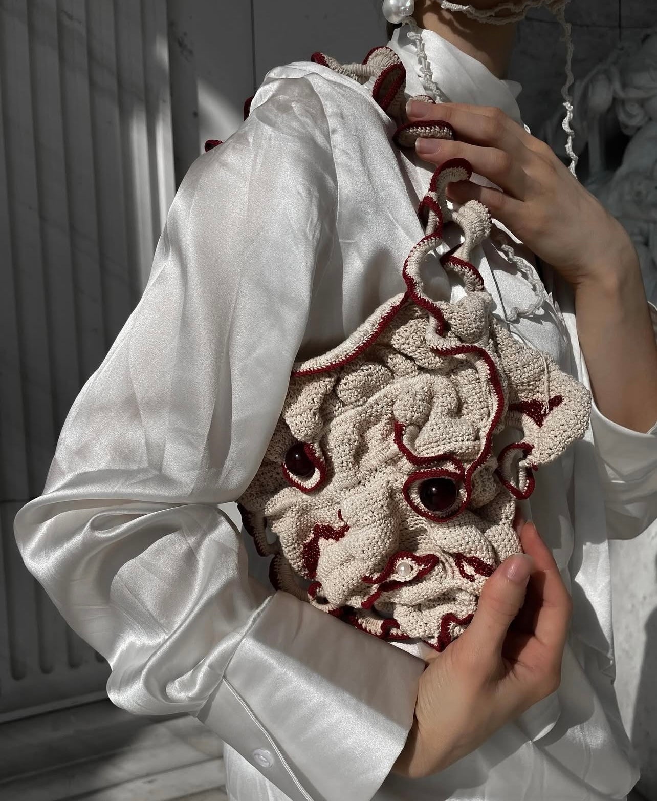 A precious piece of crochet couture, the Reliquiae Purse is a tribute to our ancestral forms and the fossilized traces they left behind. This handcrafted creation captures the essence of time, memory, and transformation, much like a morphed memory ingrained within ancient rock.