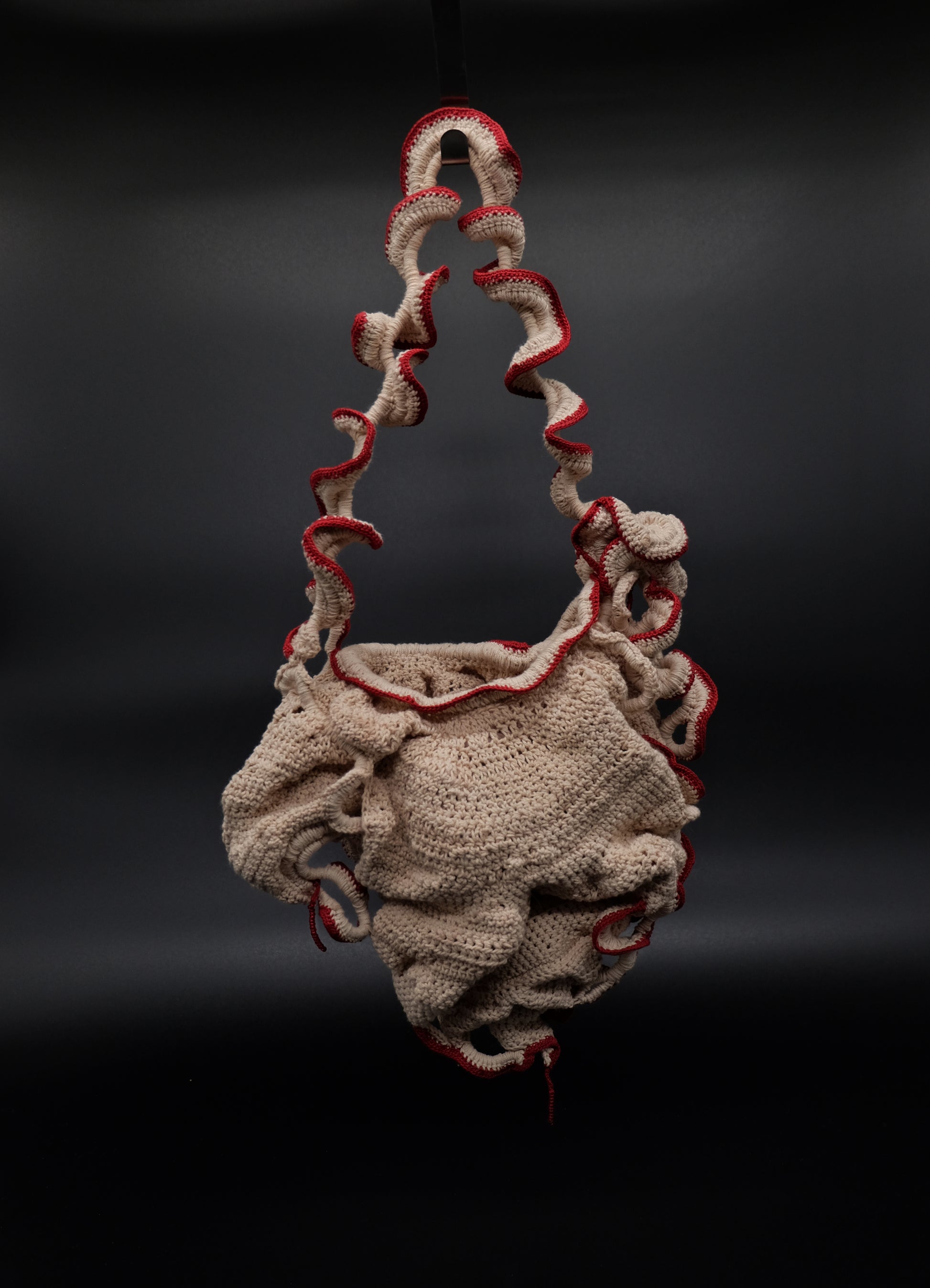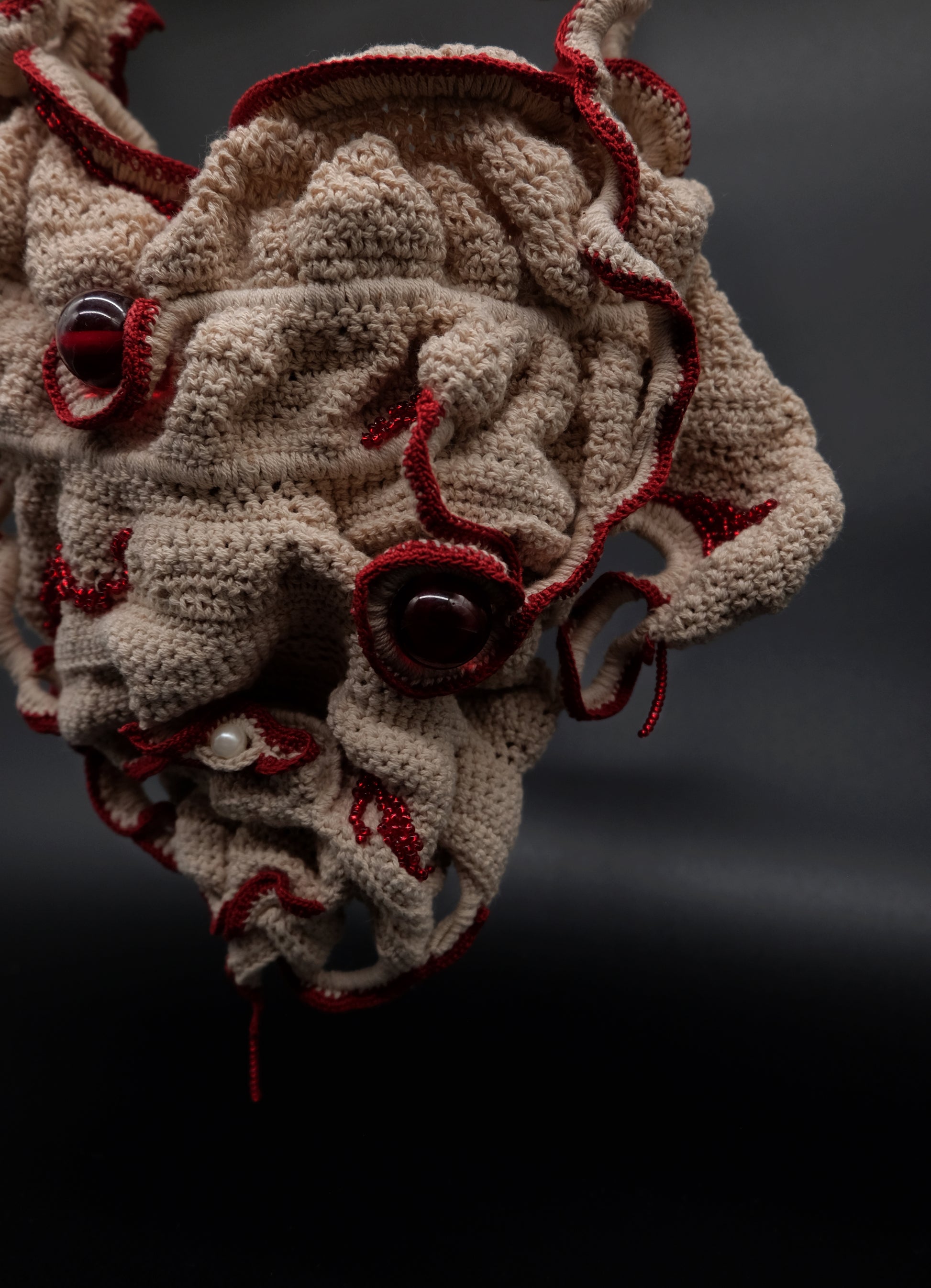 Delicate yet powerful, the purse features intricate crochet work, its textures and patterns echoing natural formations etched by time. Adorned with blood-red beads, each shimmering detail symbolizes the boundless strength and vitality contained in your heartbeat—a poignant reminder of the life force that connects us to our history and carries us forward.
