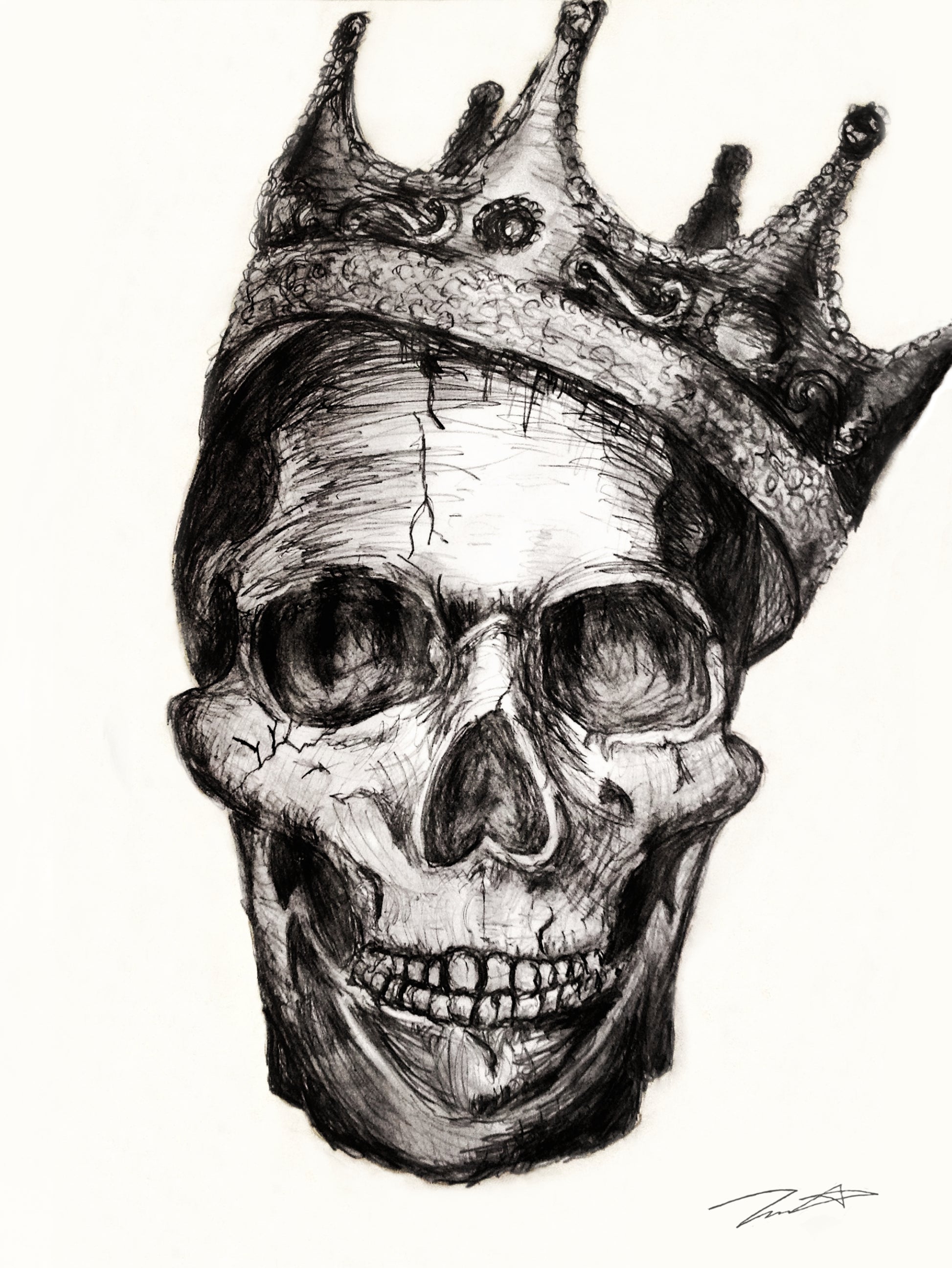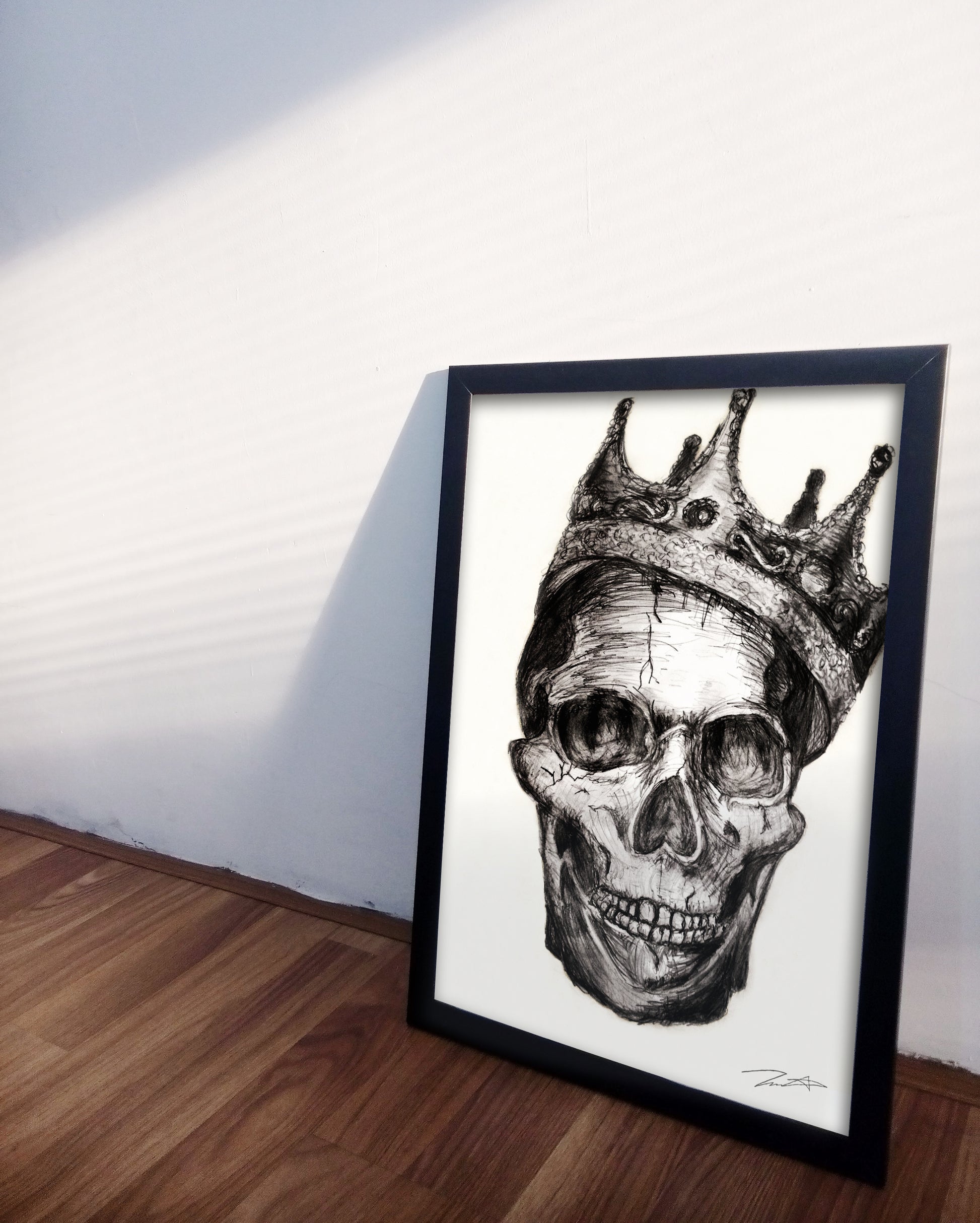 Black and white skull with a crown. The original artwork of 'Revolution' was exhibited at the Ung Liljevalchs spring salon in 2015 and was drawn with an ordinary mechanical pencil on office paper.