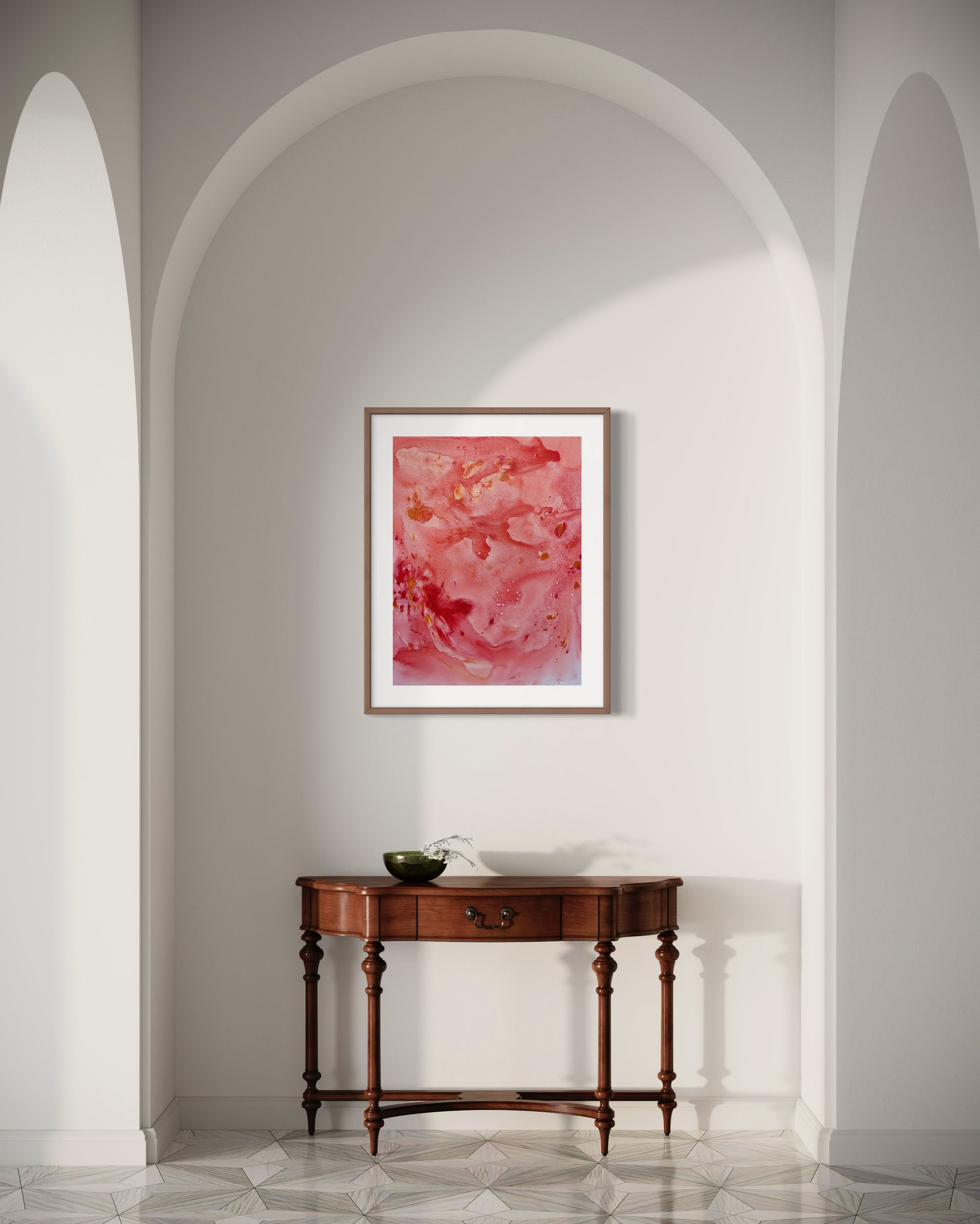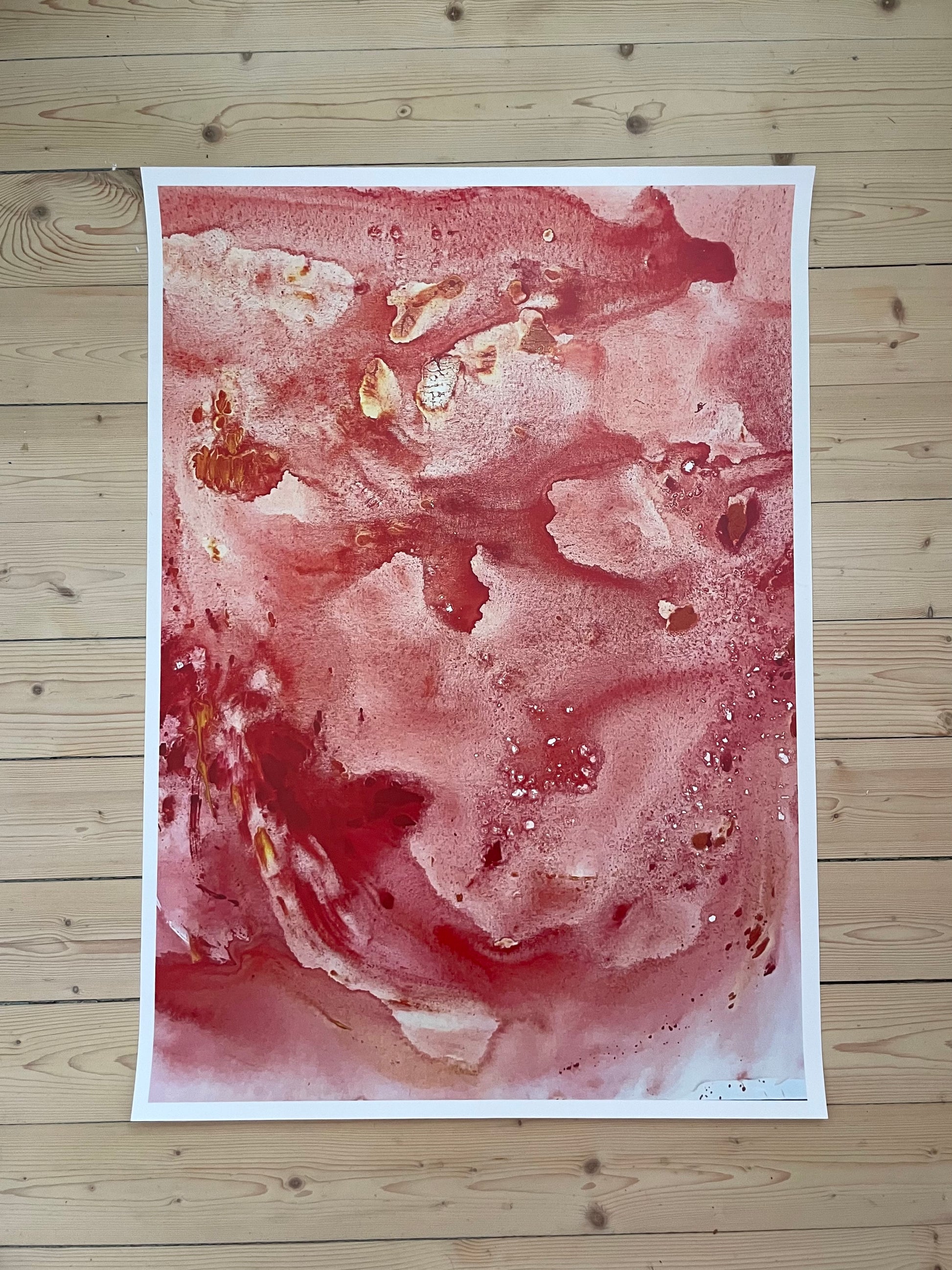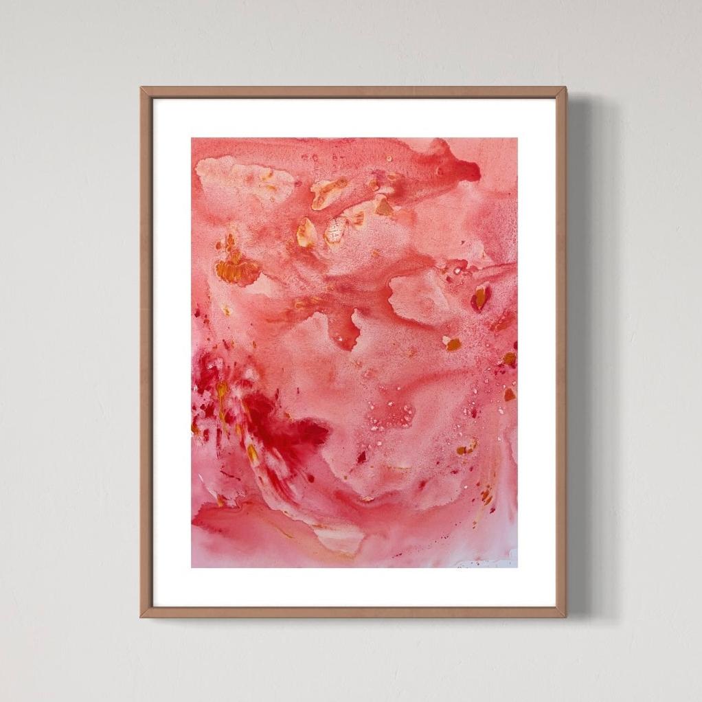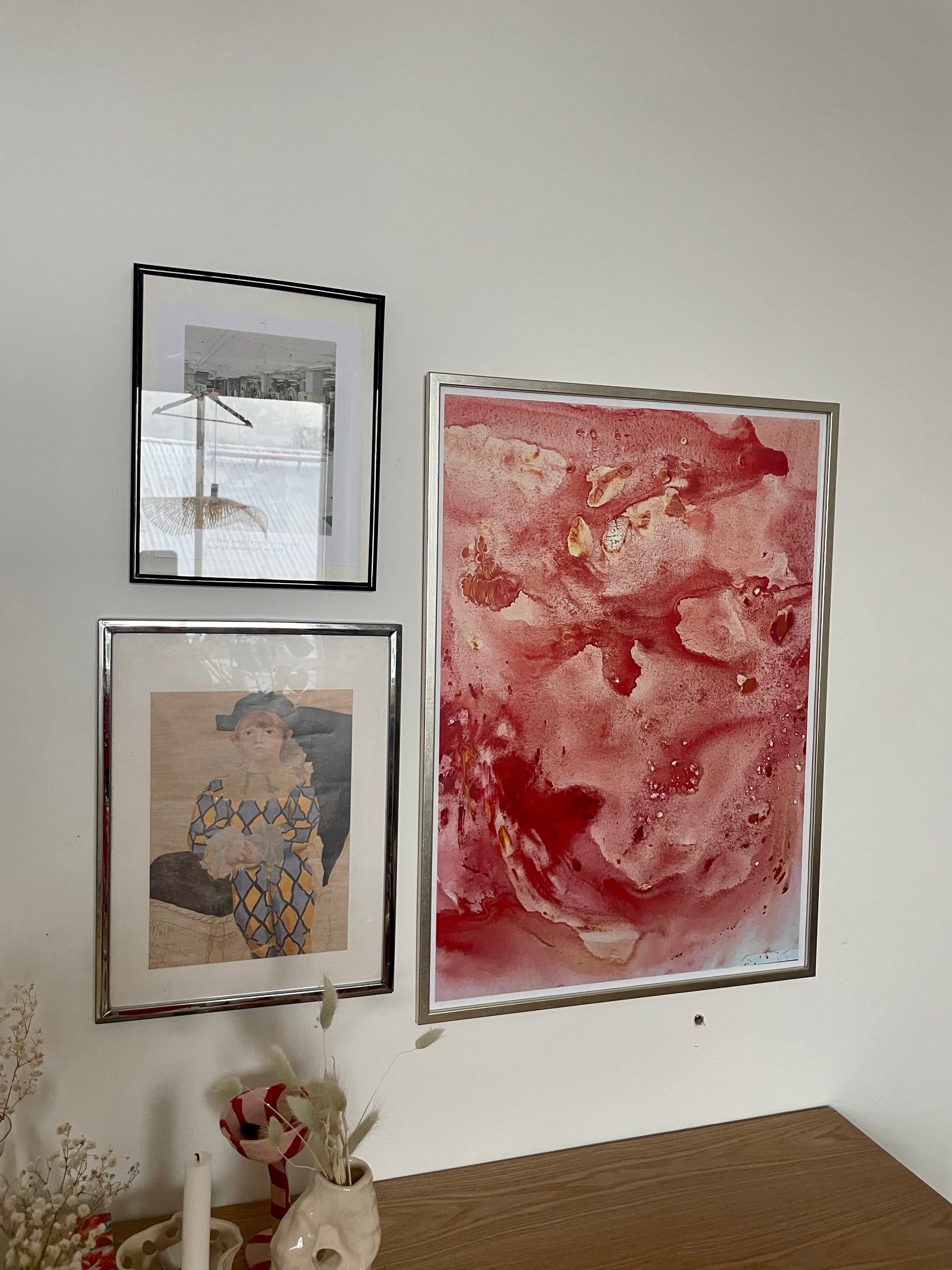 Bring bold energy to your space with Röd rörig röra by Freja Öhman — an expressive abstract art print bursting with vivid red and pink tones. This contemporary wall art captures movement, emotion, and intensity through layered brushstrokes and playful details.