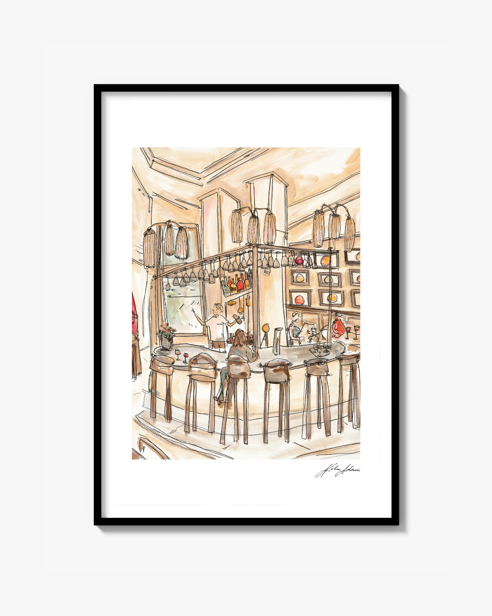 Elevate your decor with the “Collage” art print poster, a hand-signed illustration by Nike Adawi. Inspired by the lively ambiance of a chic bar setting, featuring elegant bar stools, hanging lights, and carefully displayed bottles and glassware. The warm tones and detailed line work create an inviting, sophisticated atmosphere.