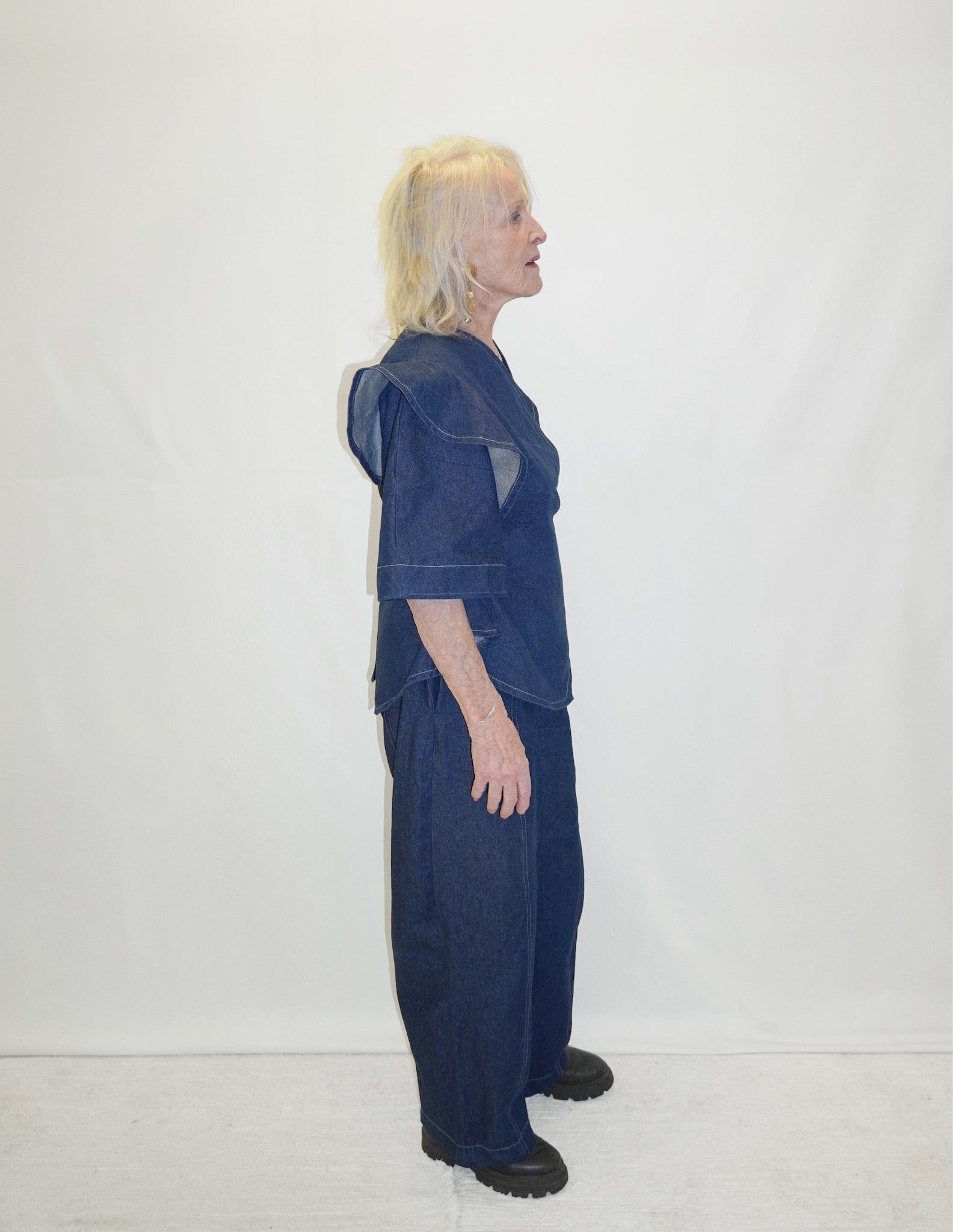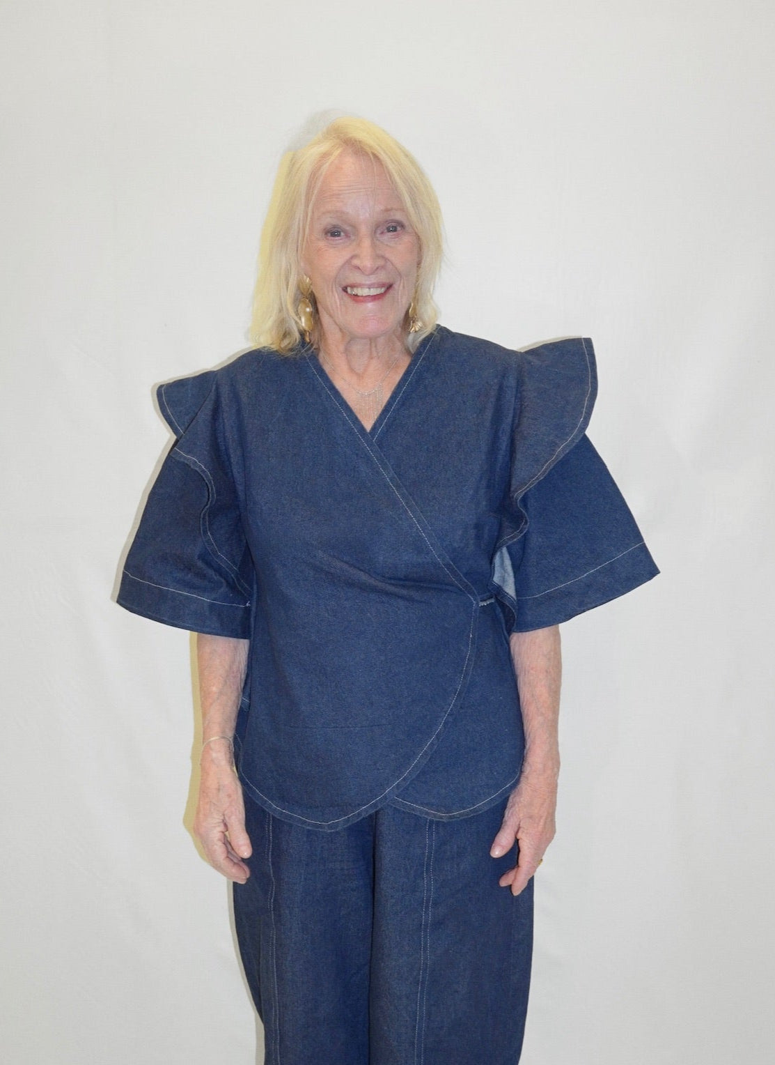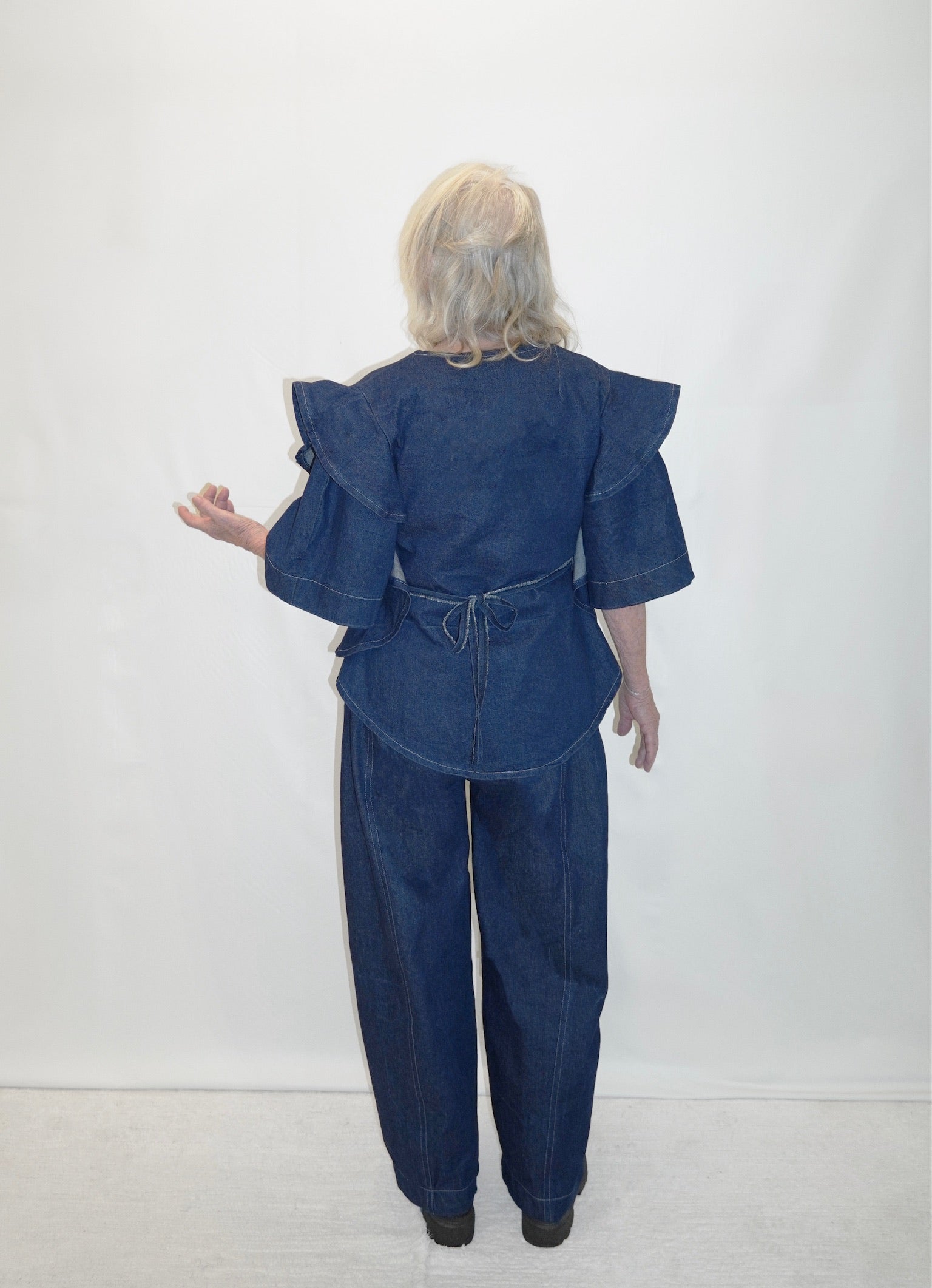 A blue denim blouse with flounces along the side and shoulder. The blouse wraps around and ties with a denim string at the back or side. Featuring light blue stitching as a contrast to the dark blue. A unique blouse that is suitable for any occasion. Make it part of a planned outfit with the Alba jeans, or make it your own style by pairing it with whatever you like. The Alba top is comfortable and with the ruffles, it adds that little extra.