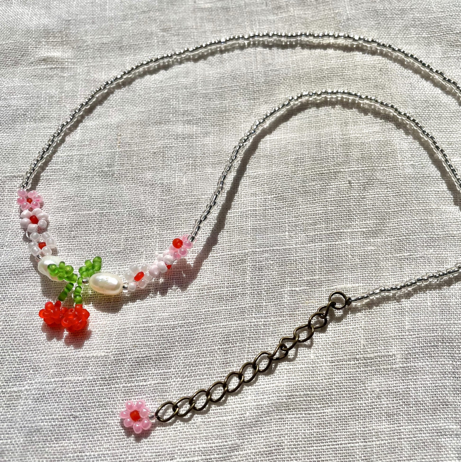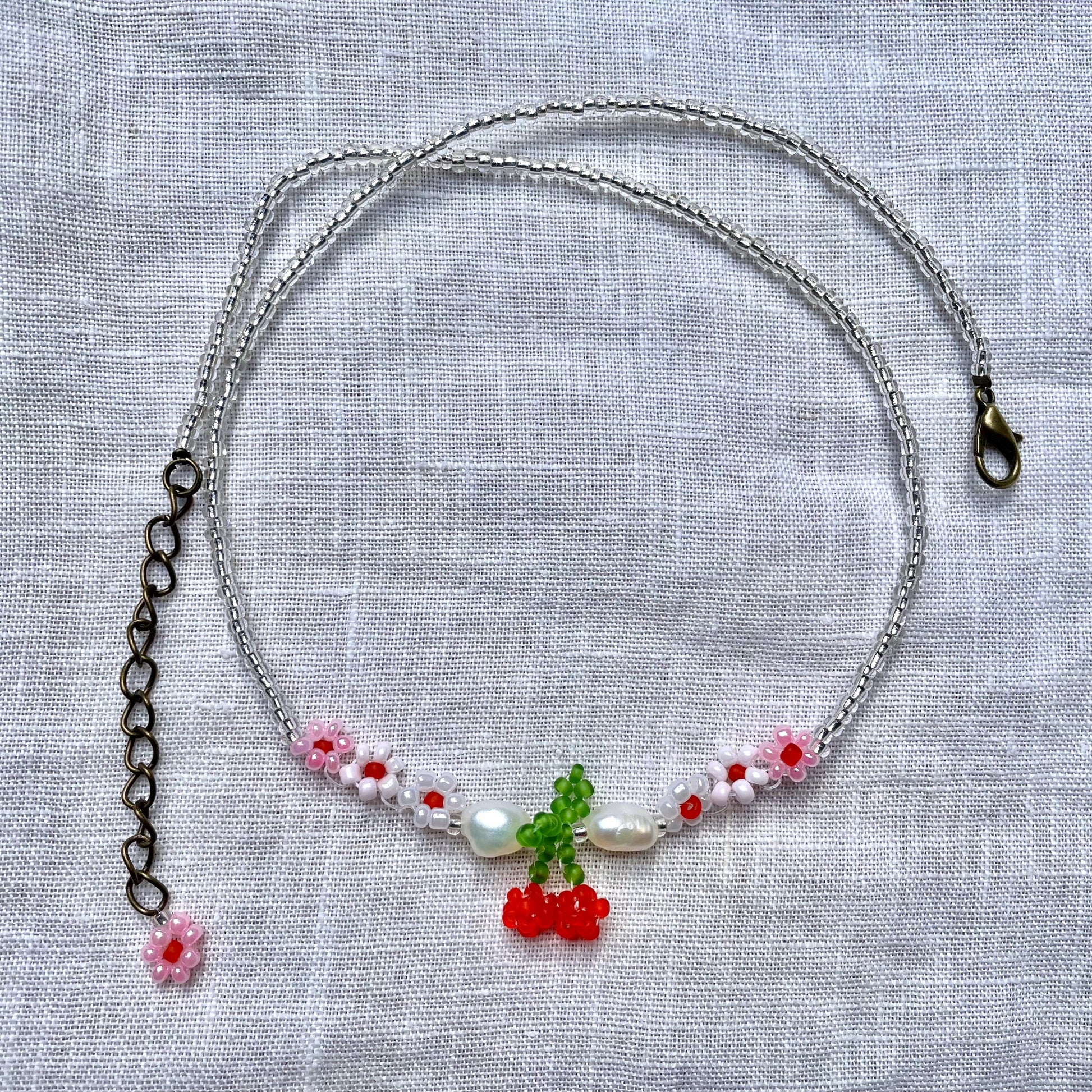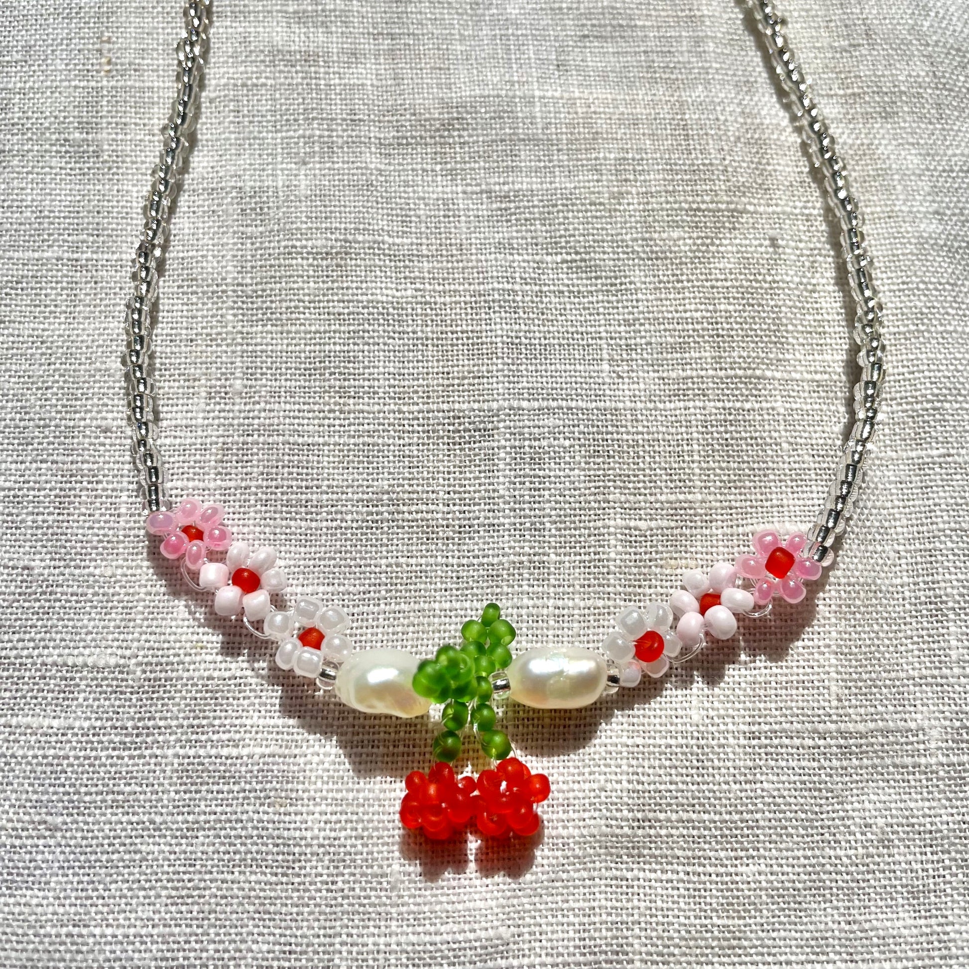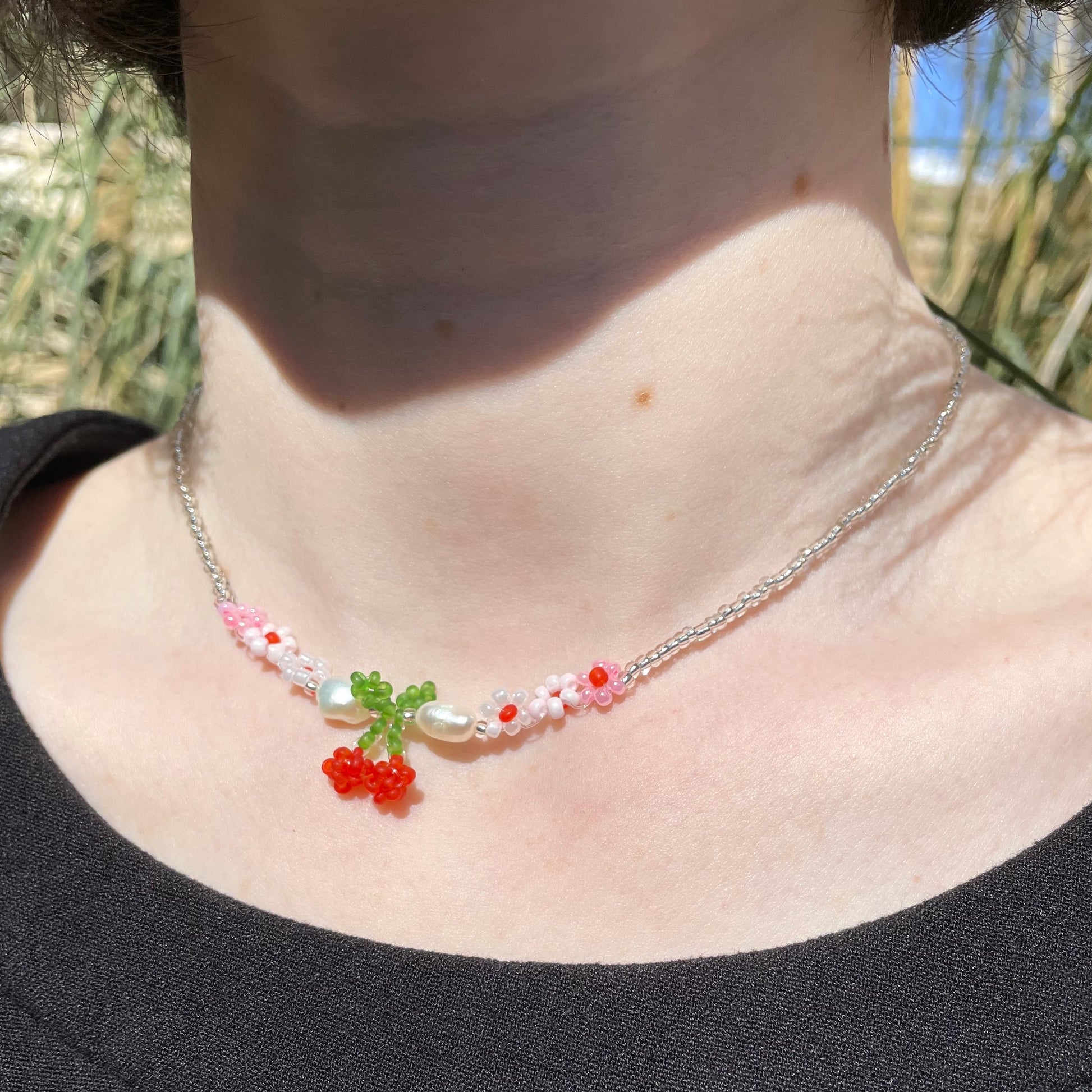 A beautiful beaded necklace with cherry and freshwater pearls is handmade with love and care, evoking gentle and pleasant associations for its owner.