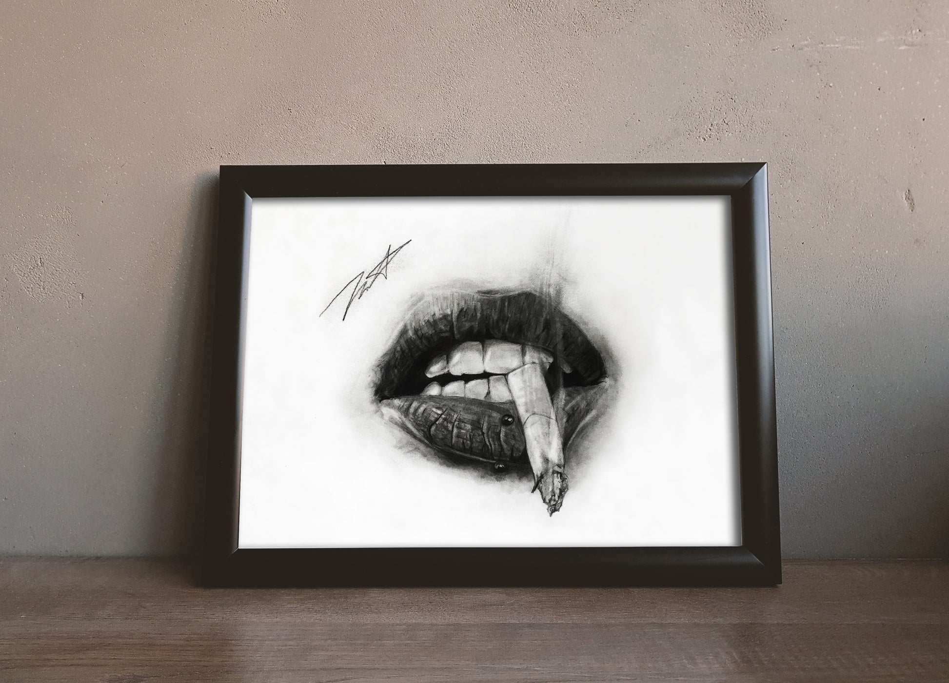 Black and white depiction of a mouth smoking a cigarette. Inspired by a young woman from Rio de Janeiro, the artwork represents the allure of nonchalance.