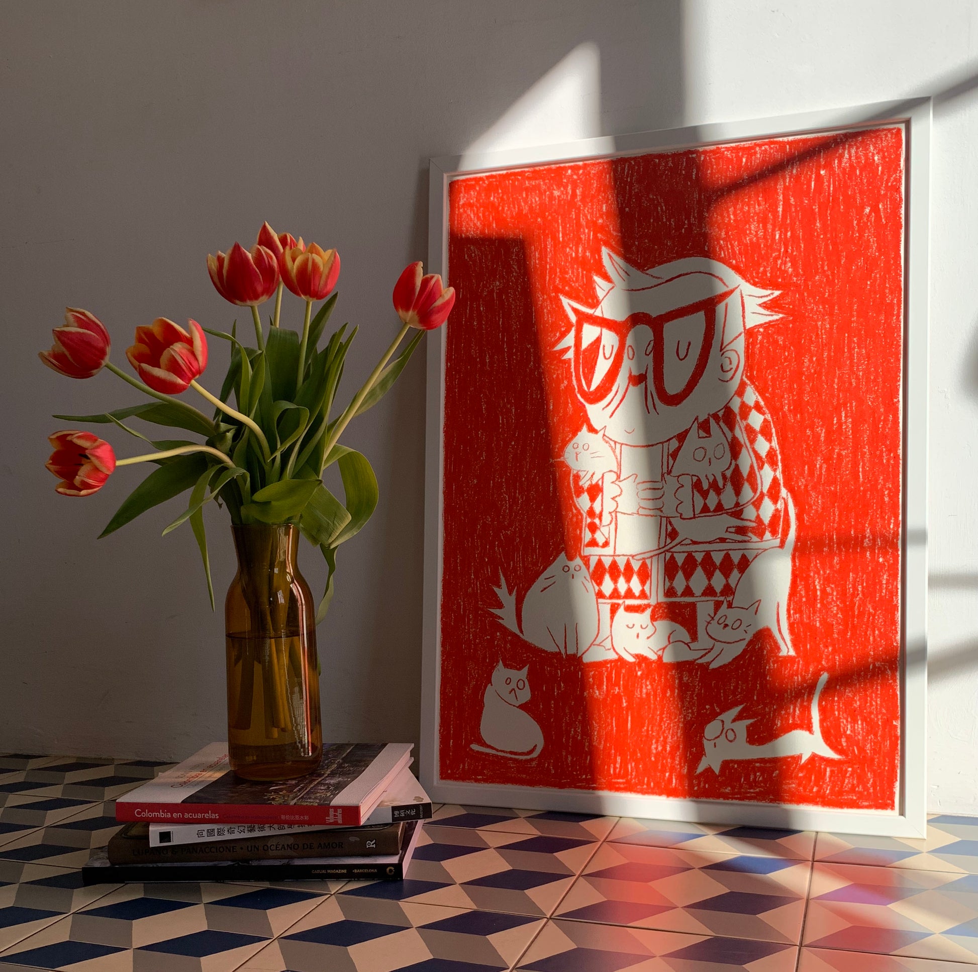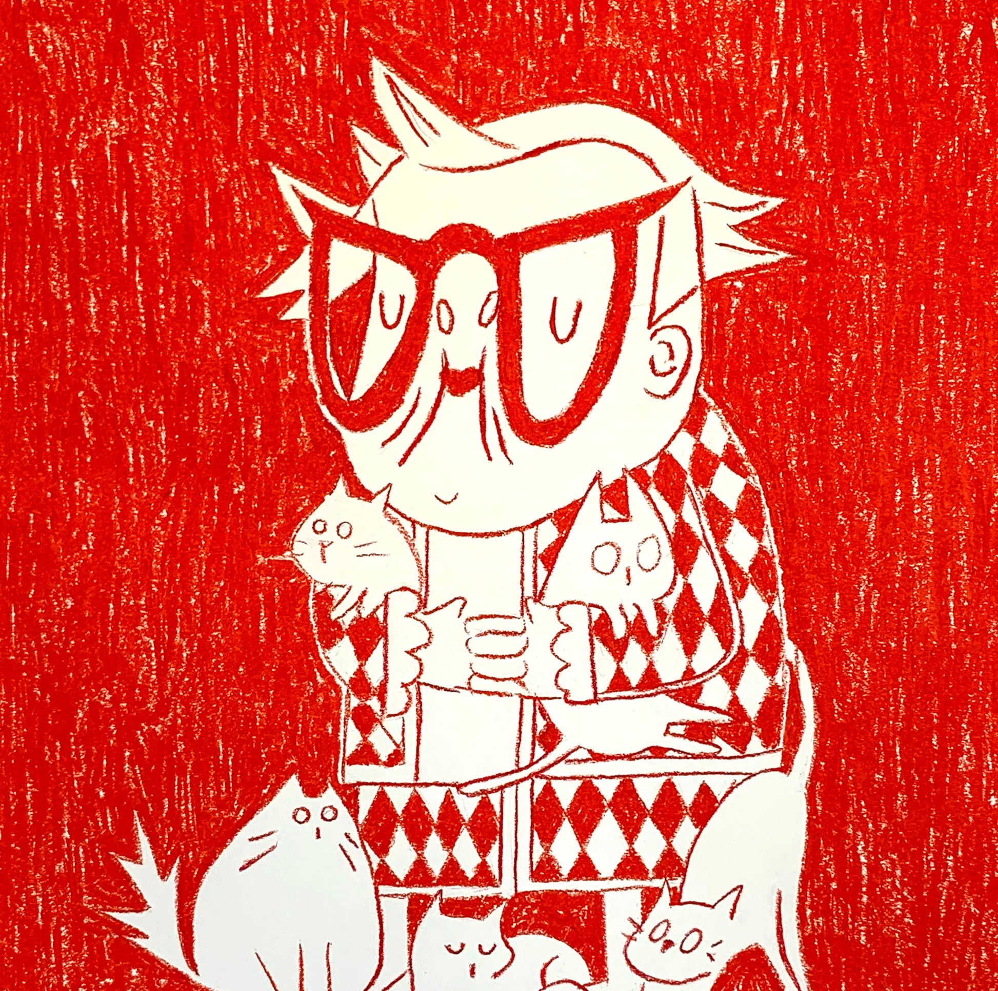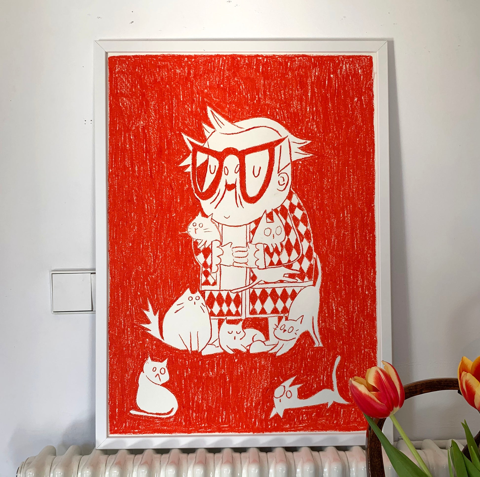 We all have a little crazy cat lady inside us. Original painting, created with oil pastels in red on 250g Materica paper, size 50 x 70 cm.