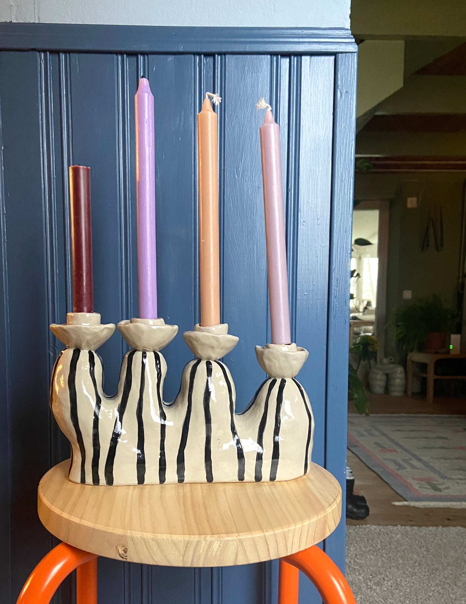 Handmade ceramic candlestick in a striped pattern, neutral colors and an unique, organic shape. This stylish piece of home decor is made by the designer Tahkamik.