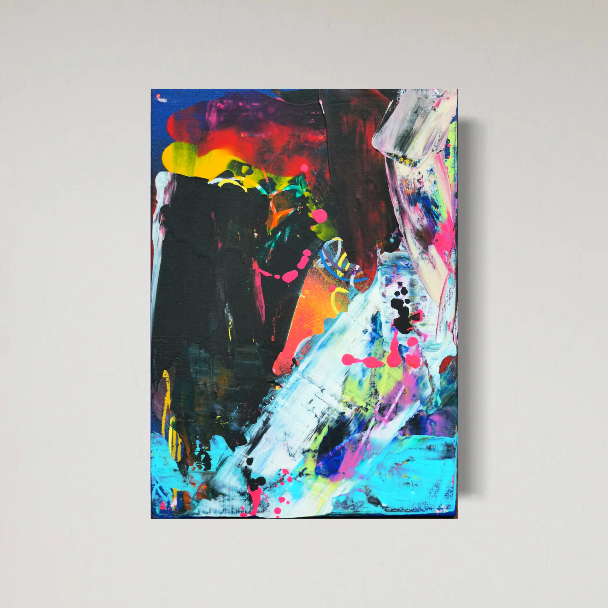 This vivid 5-piece series captures the abstract essence of a sunset in motion. Explosive layers of neon pinks, oranges, turquoise, and black clash and blend across each canvas, evoking the fading light and emotional intensity of dusk. Created with palette knives, brushstrokes, and dynamic spray paint drips, these works pulse with raw energy and layered textures.