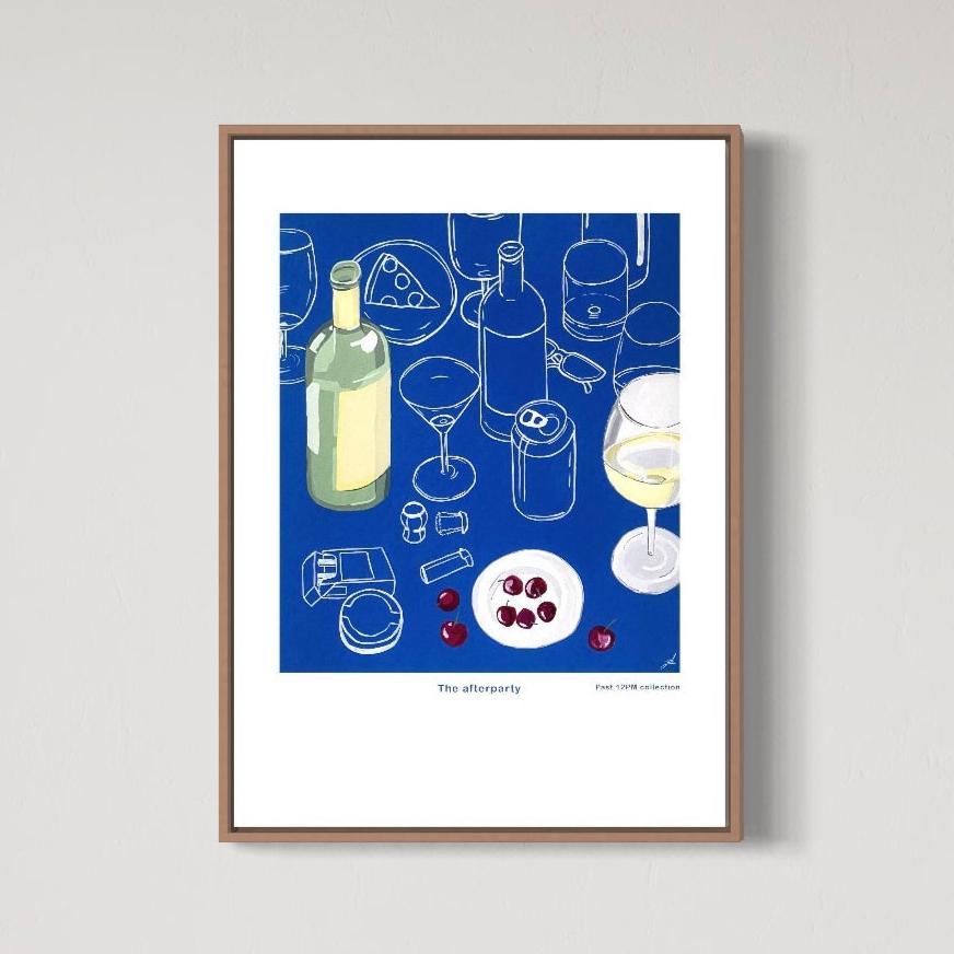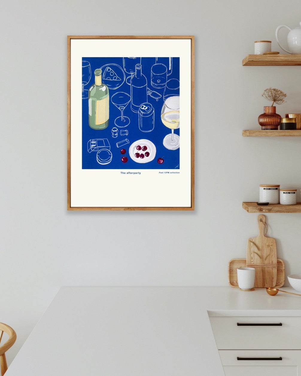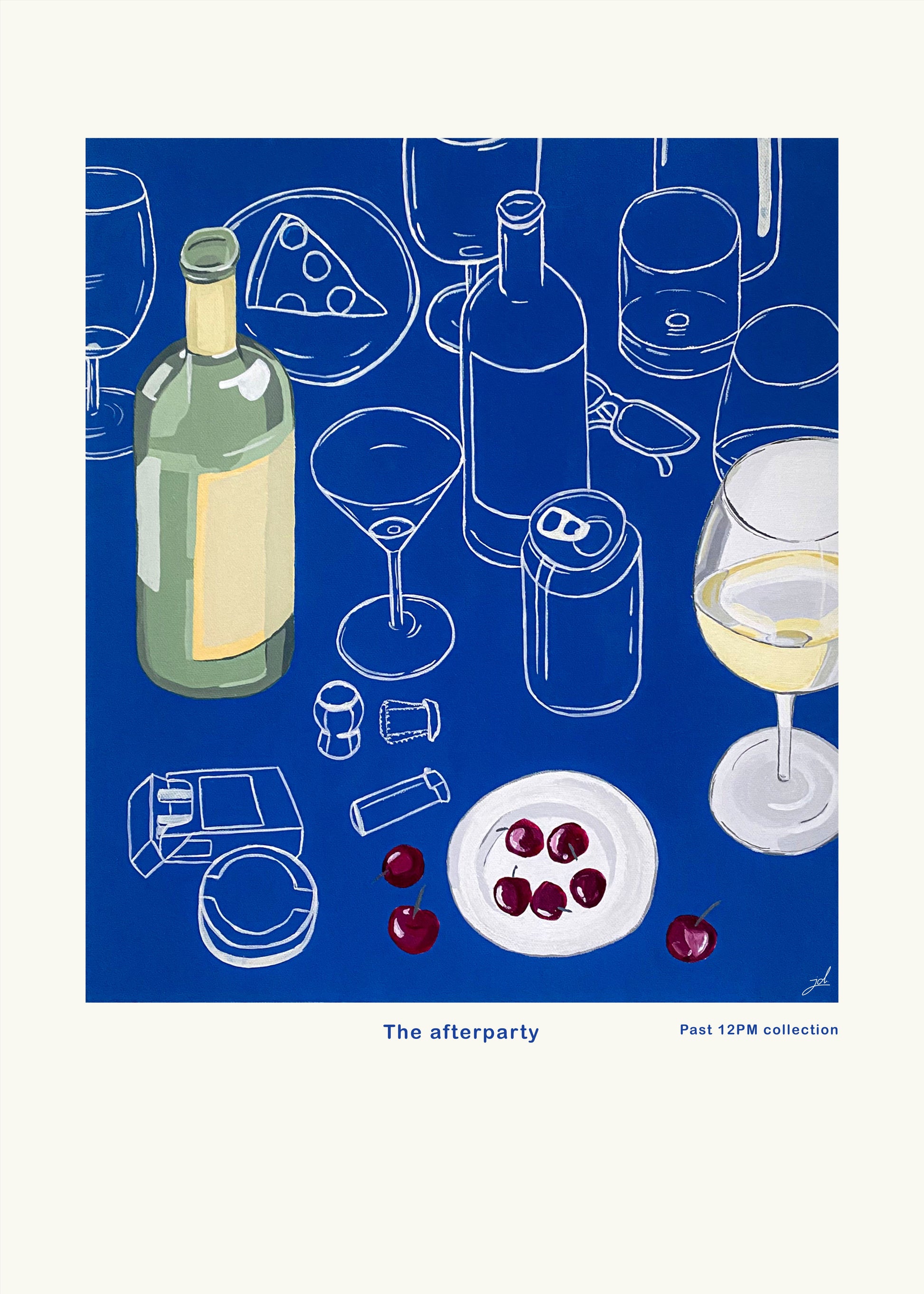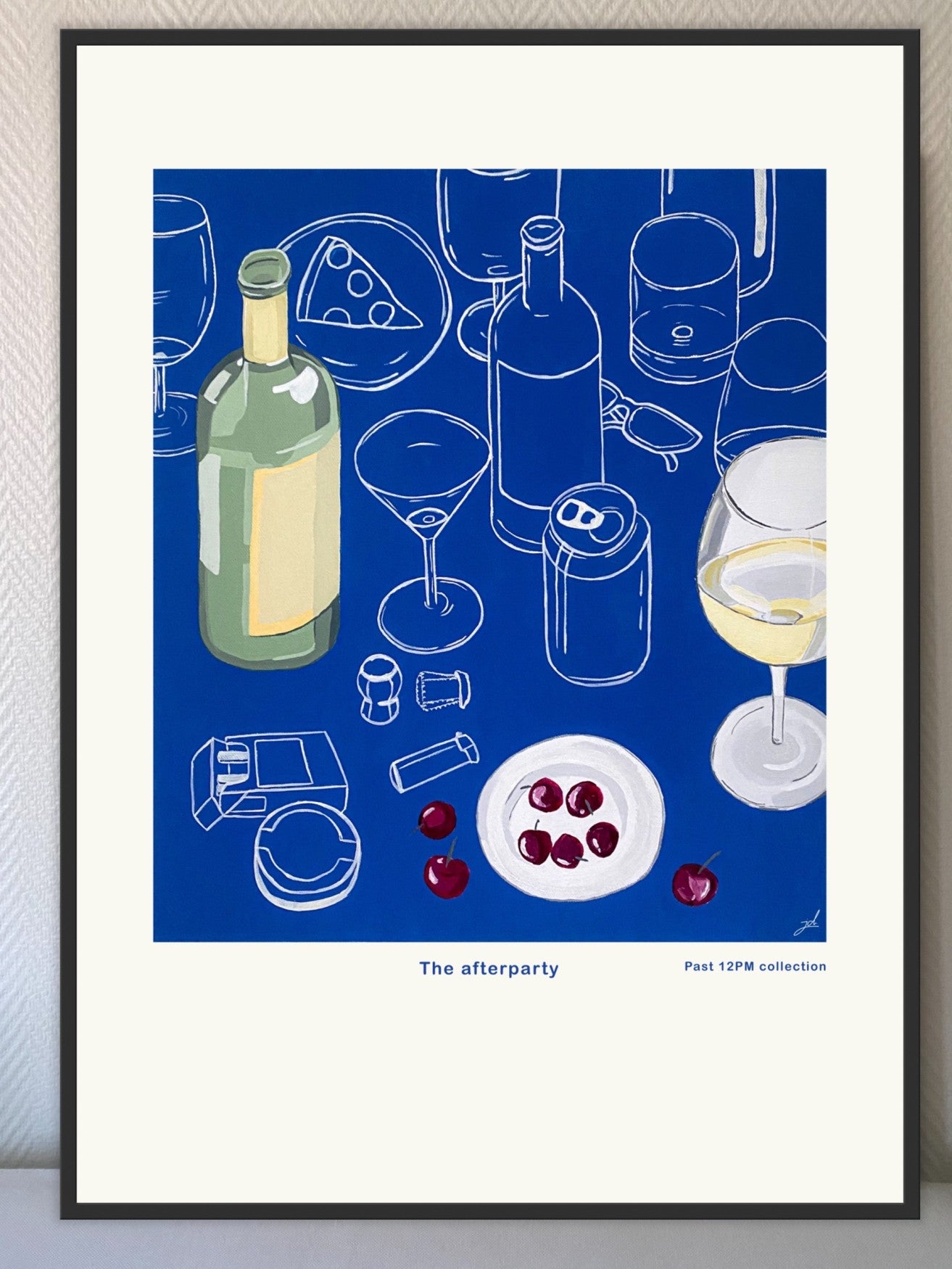 A poster of the handmade, blue colored acrylic painting "The Afterparty" by the talented, Scandinavian artist Julia Diep. The motif is a minimalistic visualisation of glasses and bottles. Perfect for making your home more unique and colorful!