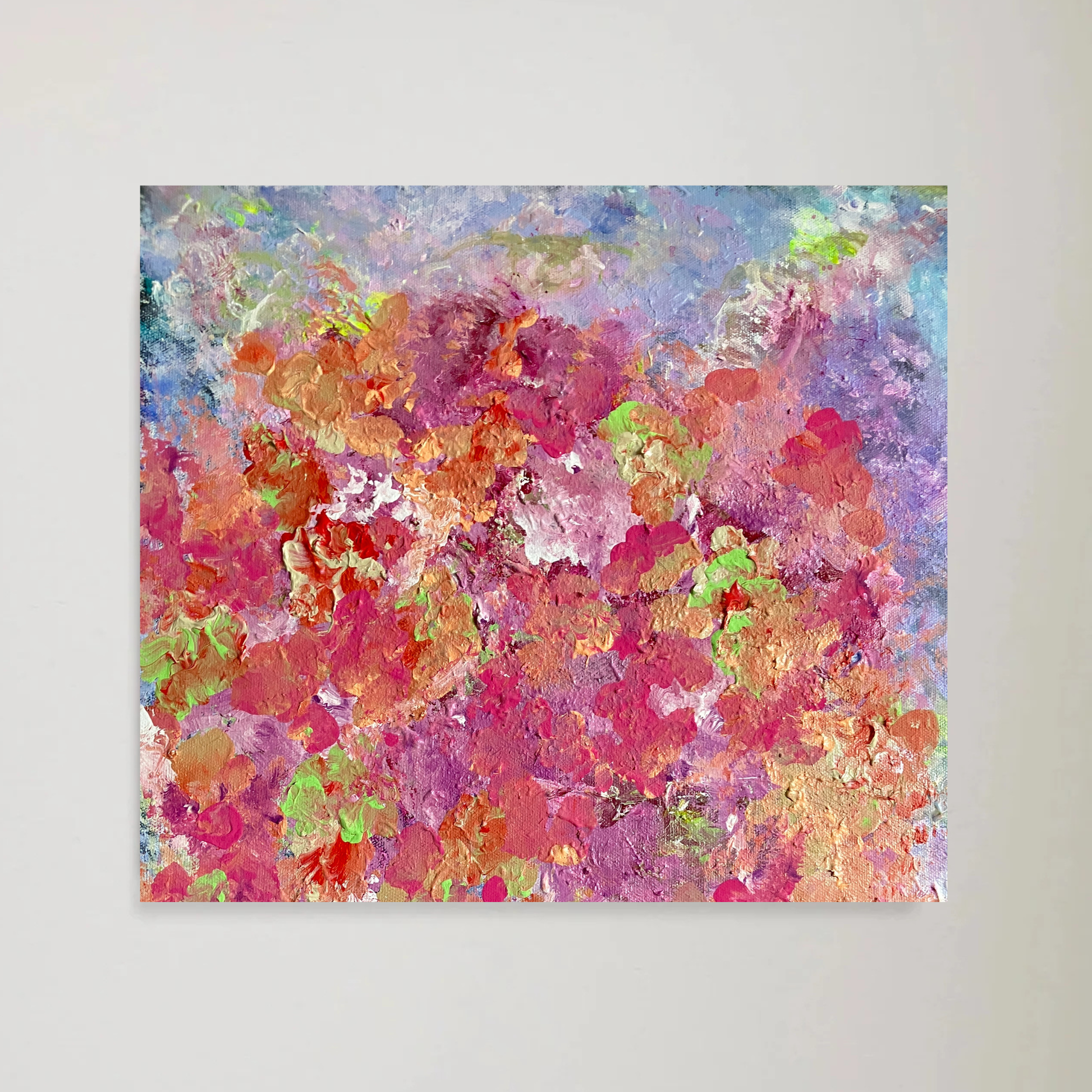 The Bouquet, Buketten in swedish is a strong colorful acrylic painting painted on black canvas and the sides are painted in the same bluecolored as in the bottom of the panting.