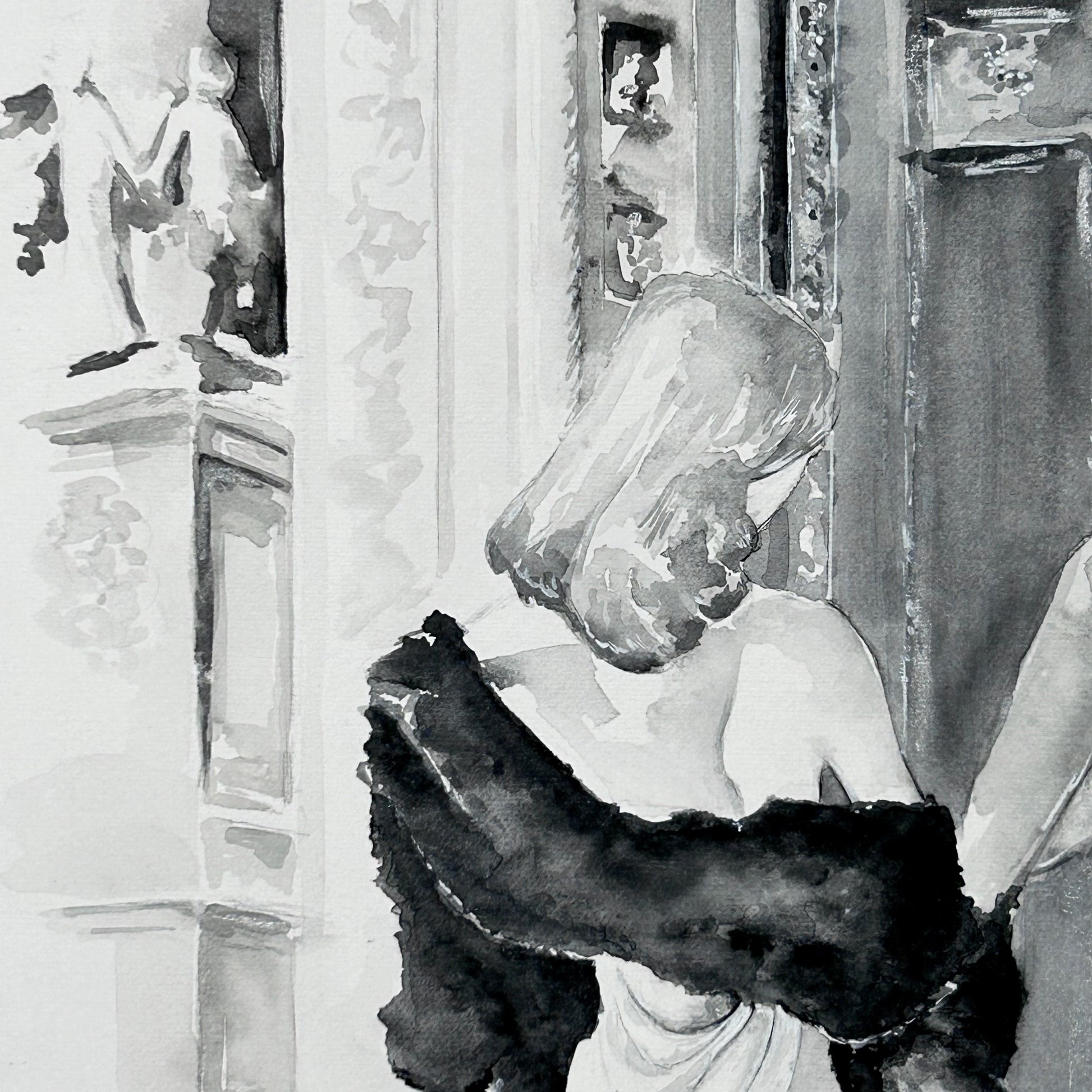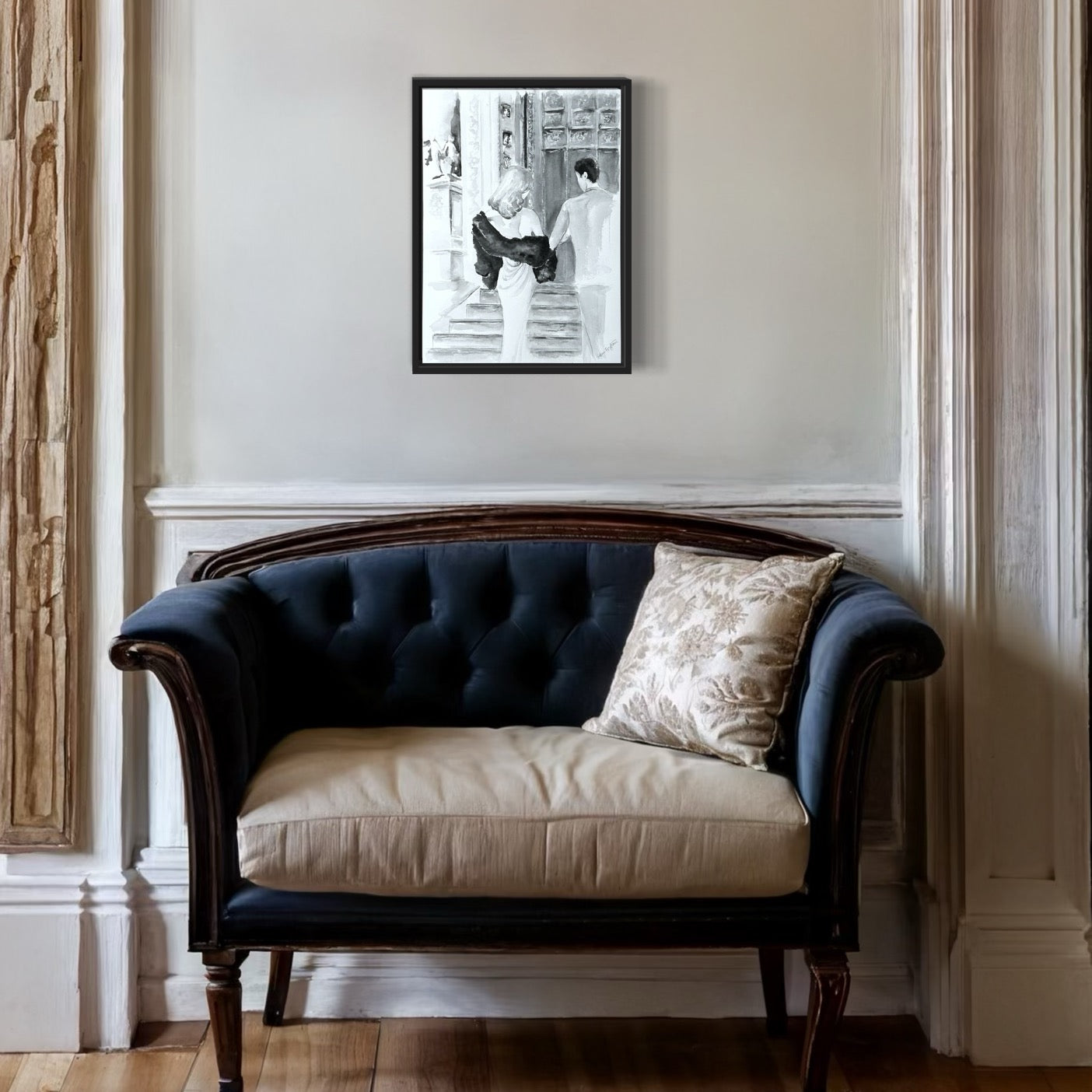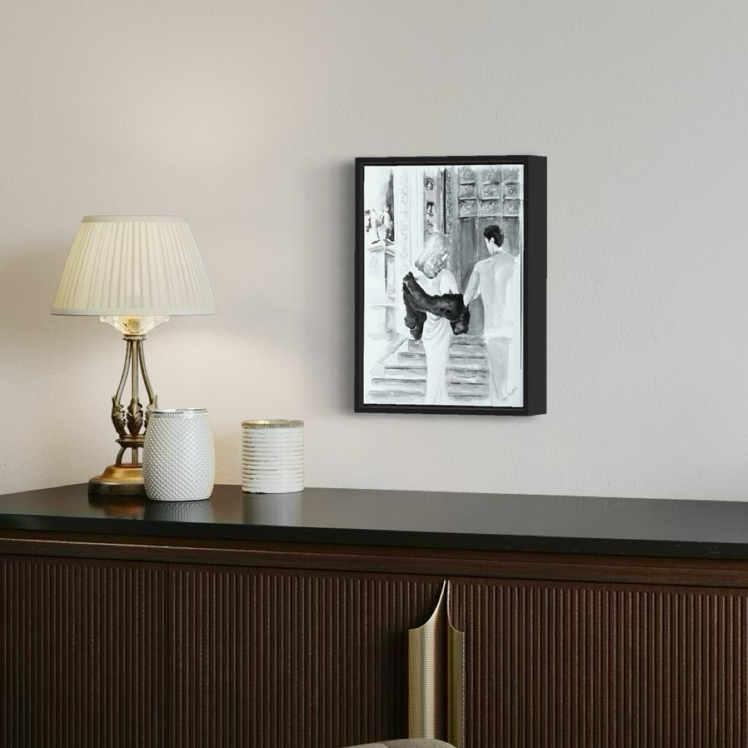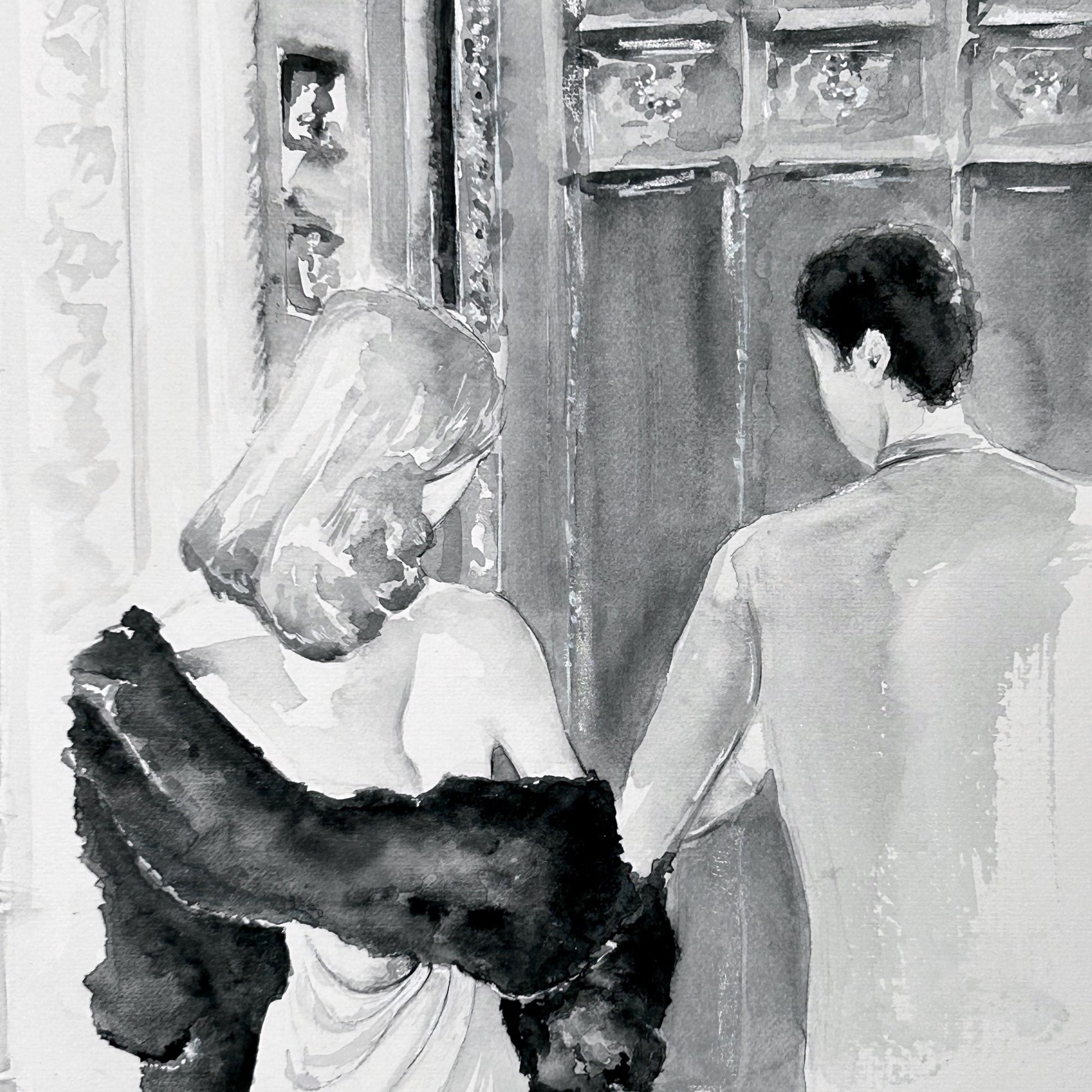 The Couple is a watercolor painting in black and white depicting a couple walking arm in arm up a flight of stairs to a building towards a large gate. The building has several architectural details such as the sculpture at the top left and to the left of it large gate. It is not clear what type of building it is, which also it is up to the viewer to interpret.