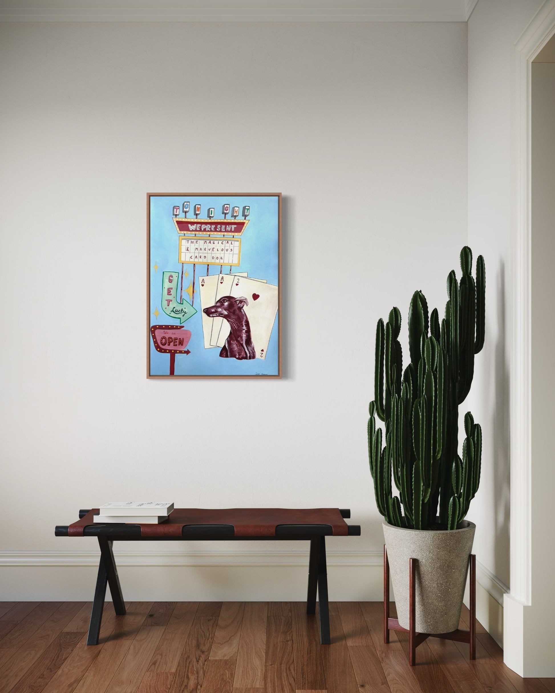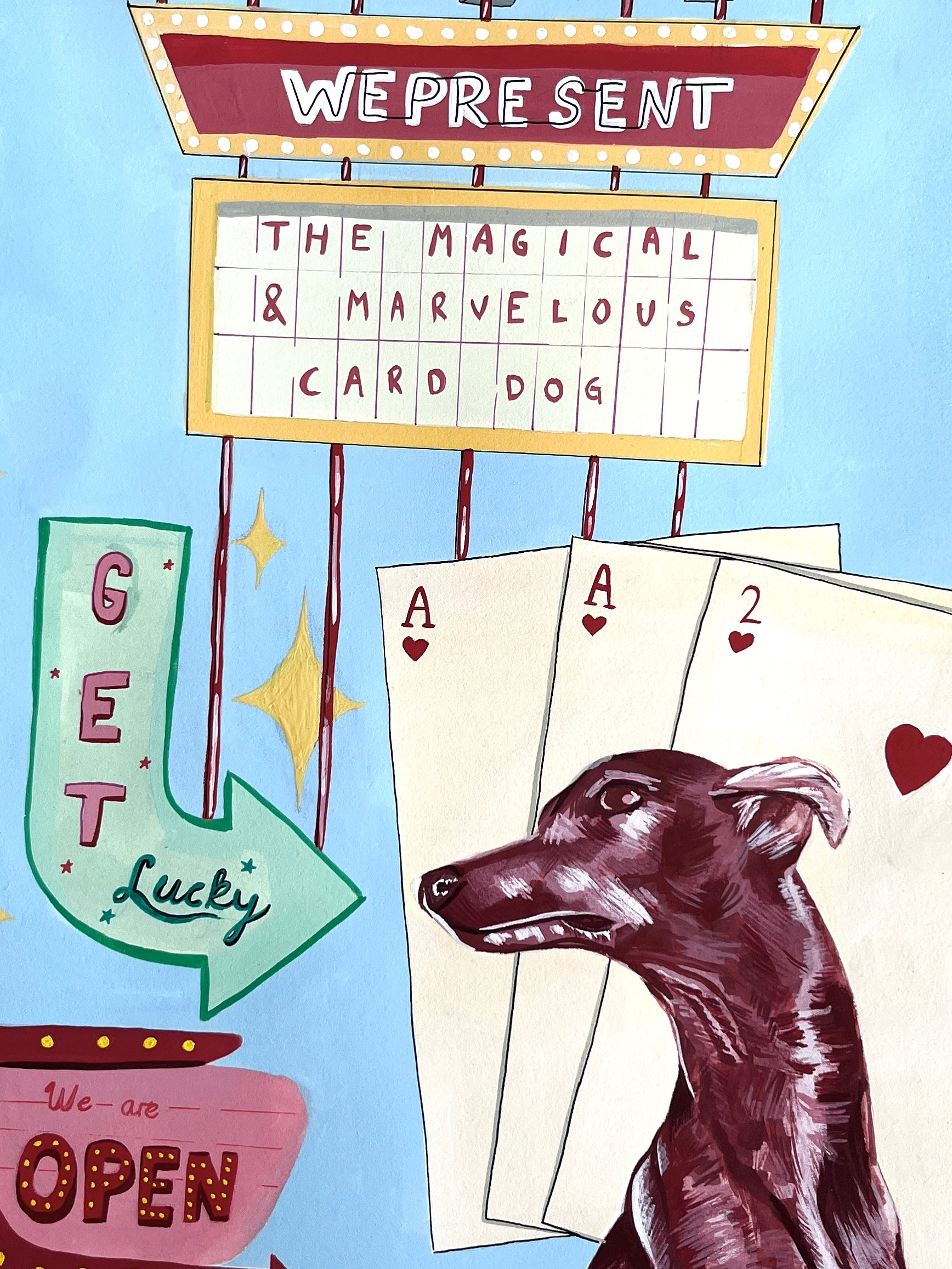A playful and colorful print of, among other things, a dog and cards on a blue background. This artwork by the talented Julia Andersen is a truly unique piece that will bring more style and personality into your home.