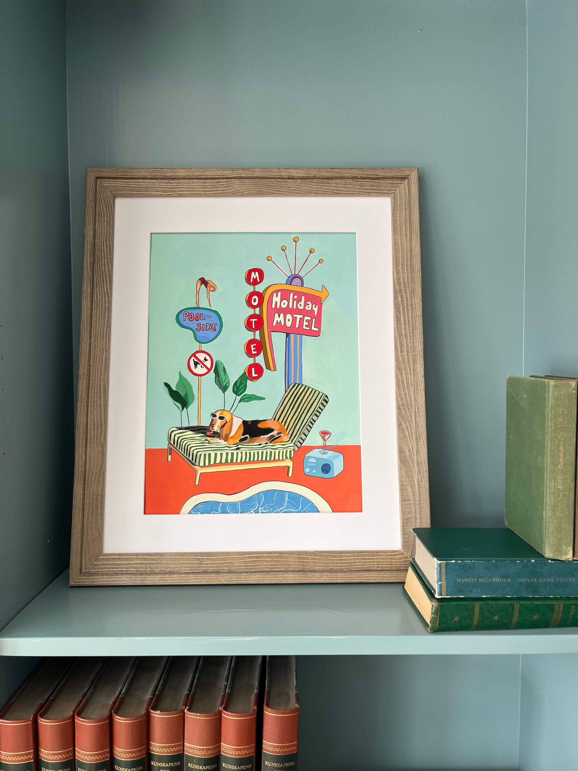 Make your home decor more fun and colorful with this art piece called "The Motel Dog" by Julia Andersen. The handmade painting pictures a dog in a motel and has a unique, playful look!