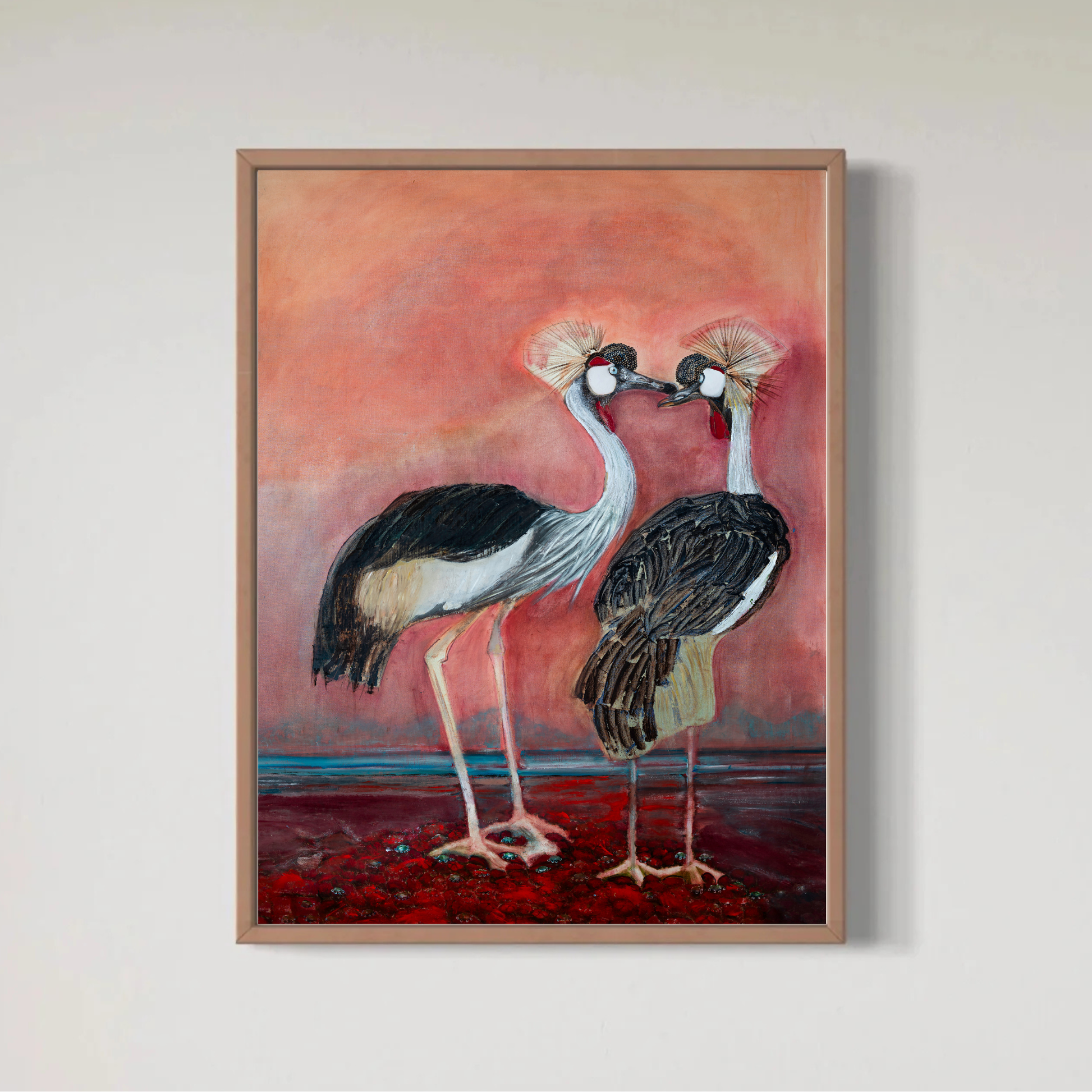 The title The Royals referred to the species of the birds, the Grey Crowned Cranes, though their elegance made the name feel almost literal. I found most birds endlessly fascinating; I had yet to meet an ugly one. These two, in particular, struck me as majestic and full of personality. Painting them allowed me to capture both their grace and their quiet curiosity.