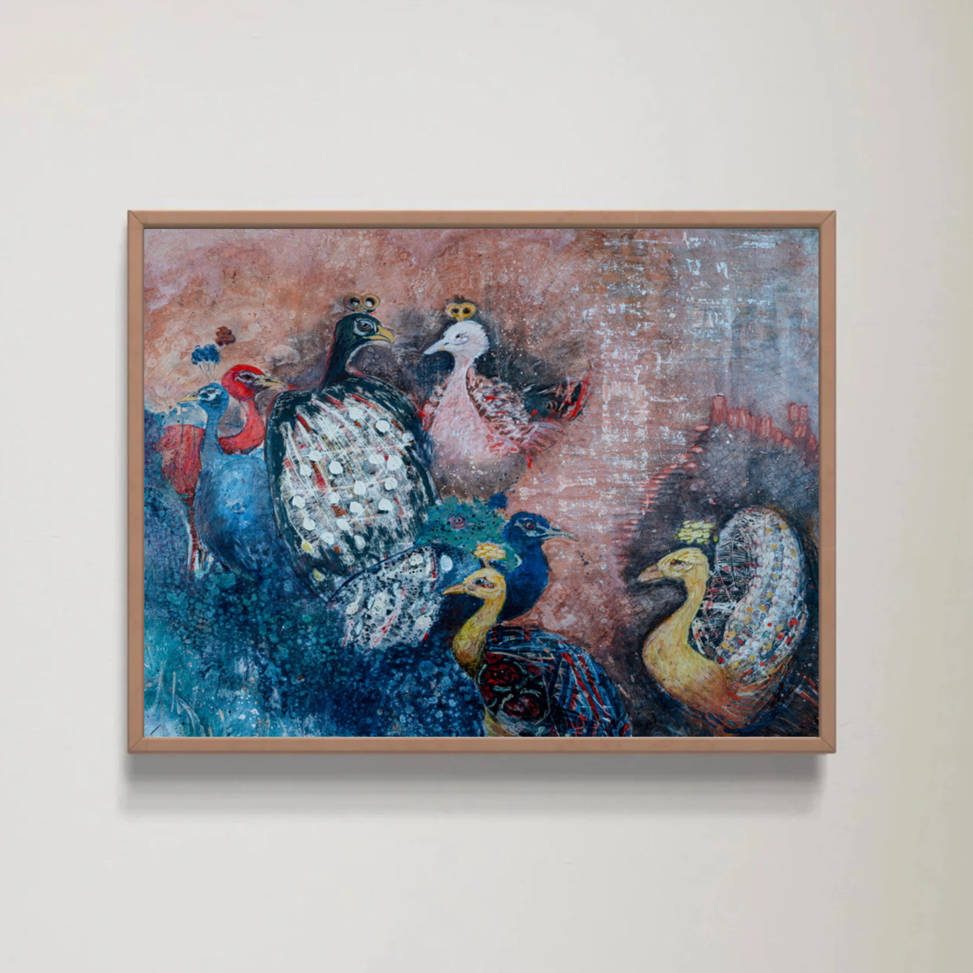 The Wedding was a gathering of birds born entirely from my imagination. I spent a lot of time among birds and loved observing their movements and behavior, but I never painted them while I was with them. Instead, I let the impressions linger and reappear later in paint. The patterns and colors came from memory, shaped by rhythm and instinct more than realism.