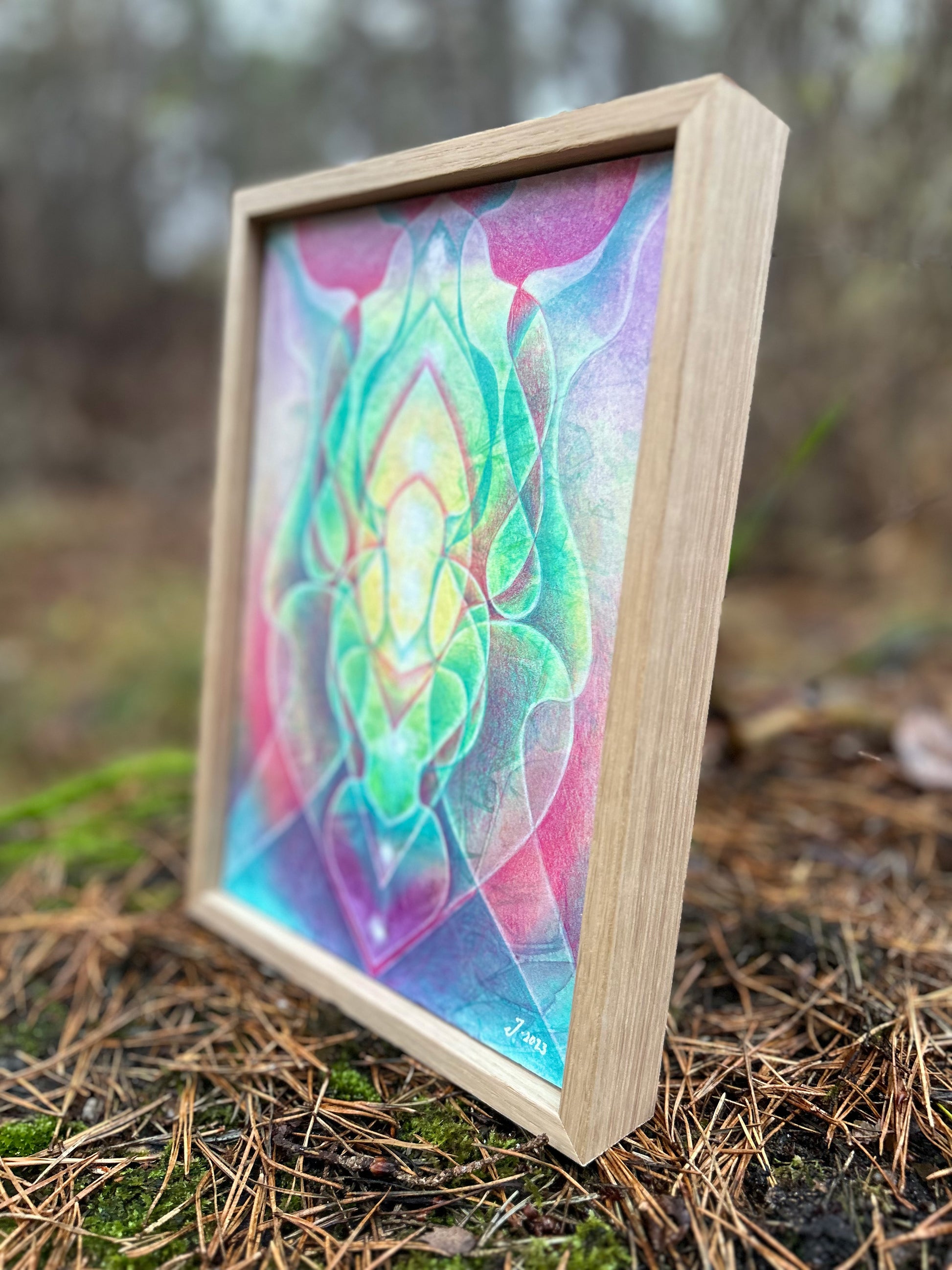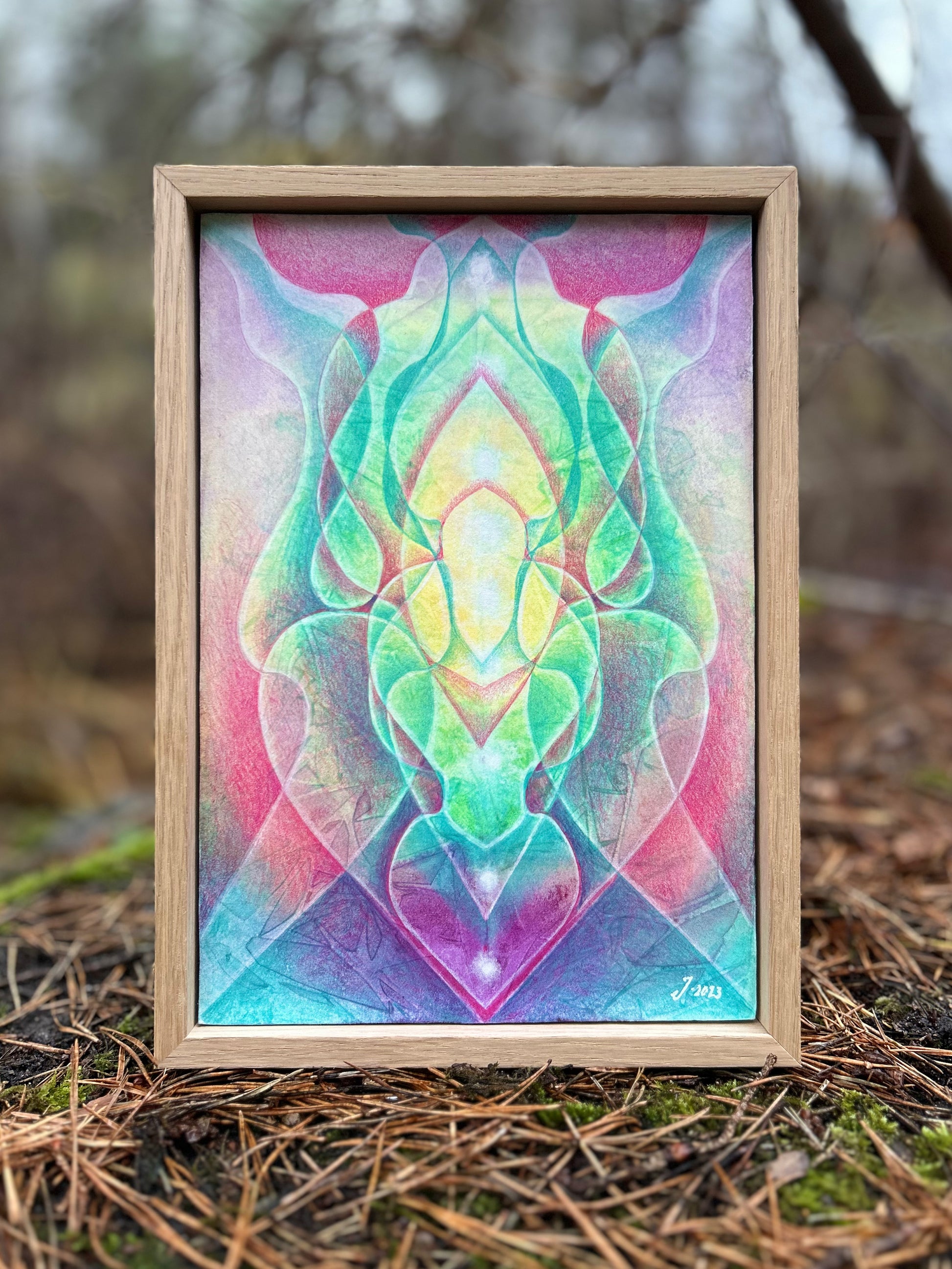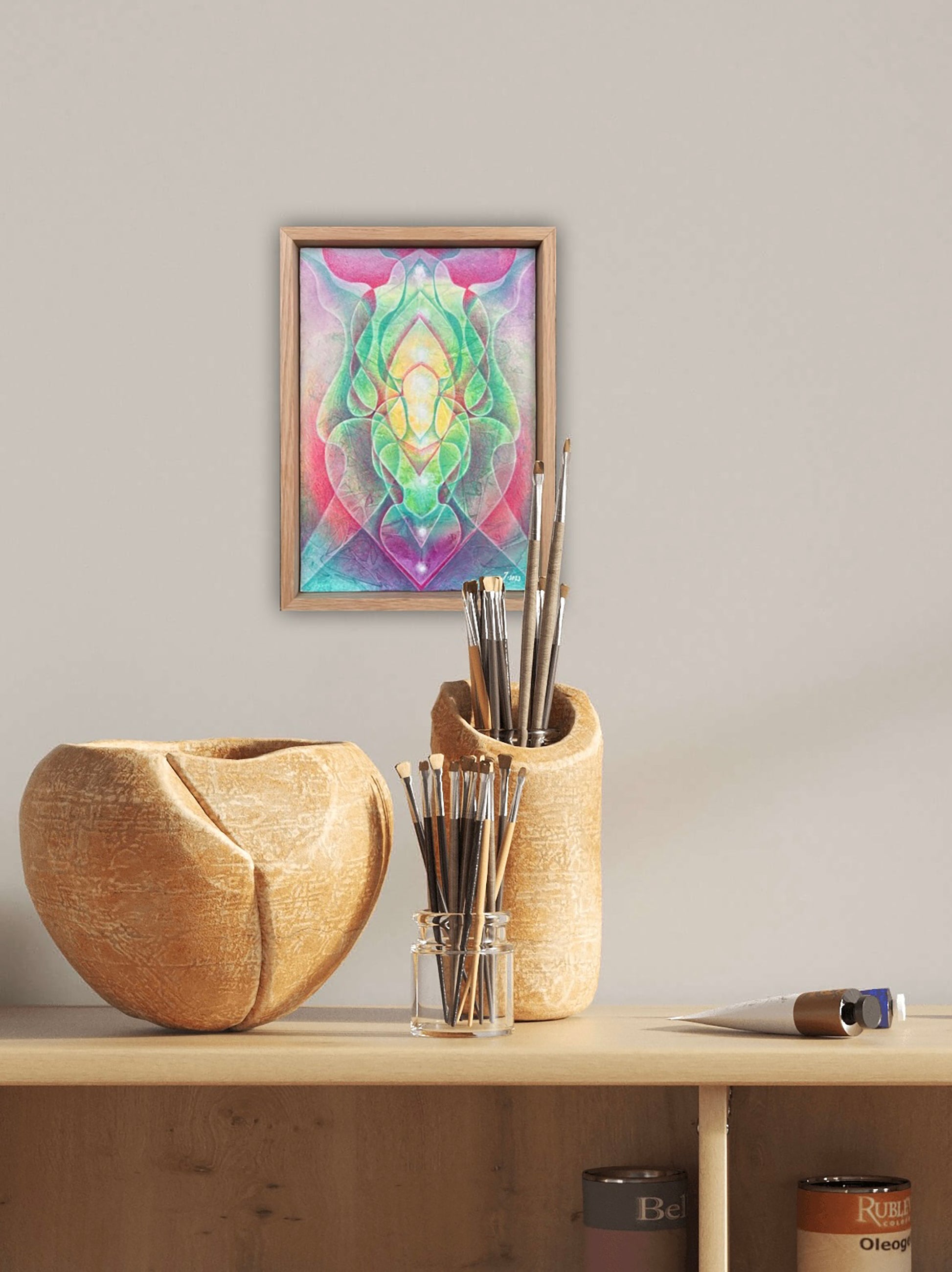 Abstract watercolor with overlapping soft shapes in shades of red, yellow, green, and pinkish-purple. Forms reaching upward in a receptive gesture flow welcomingly back down and outward.