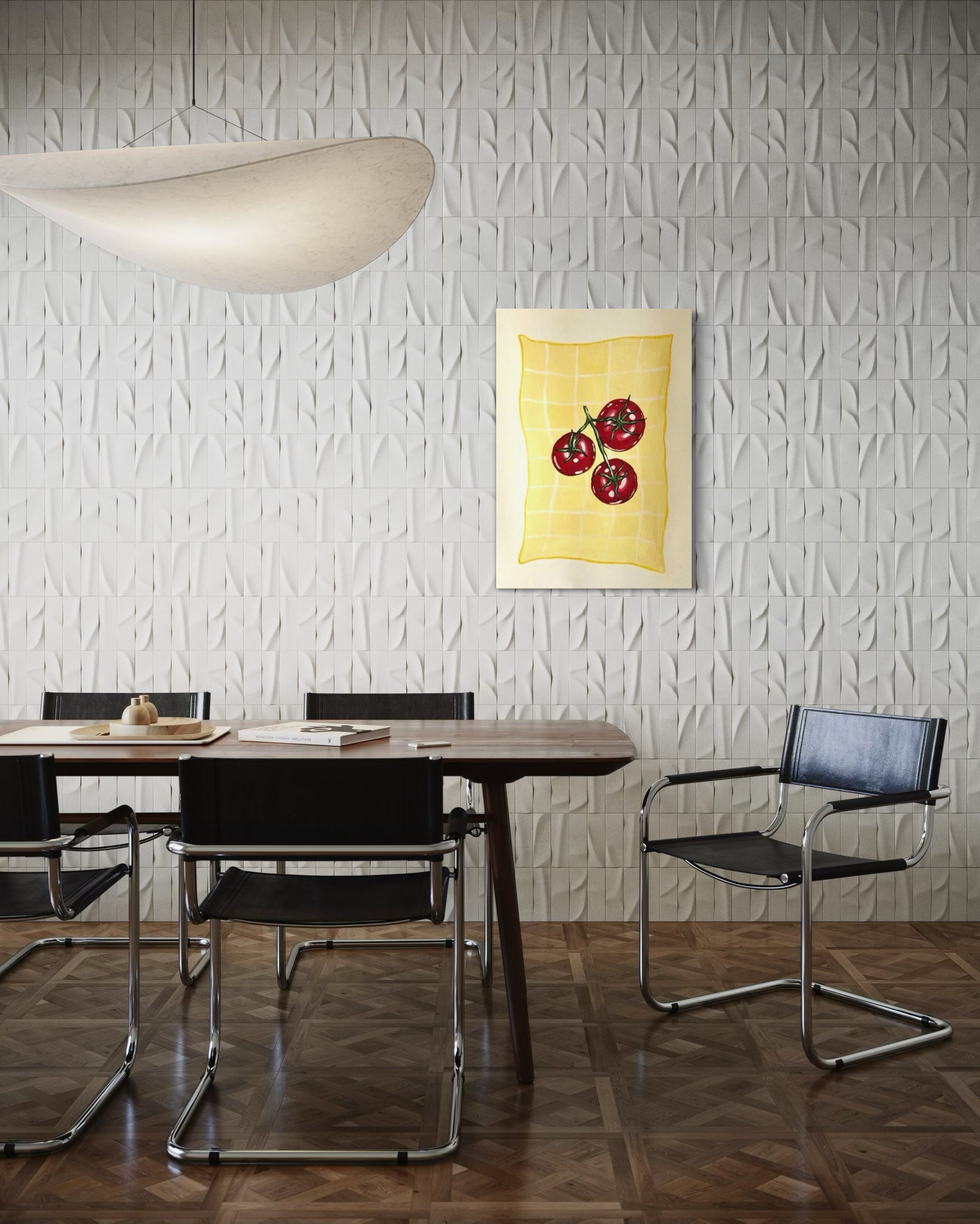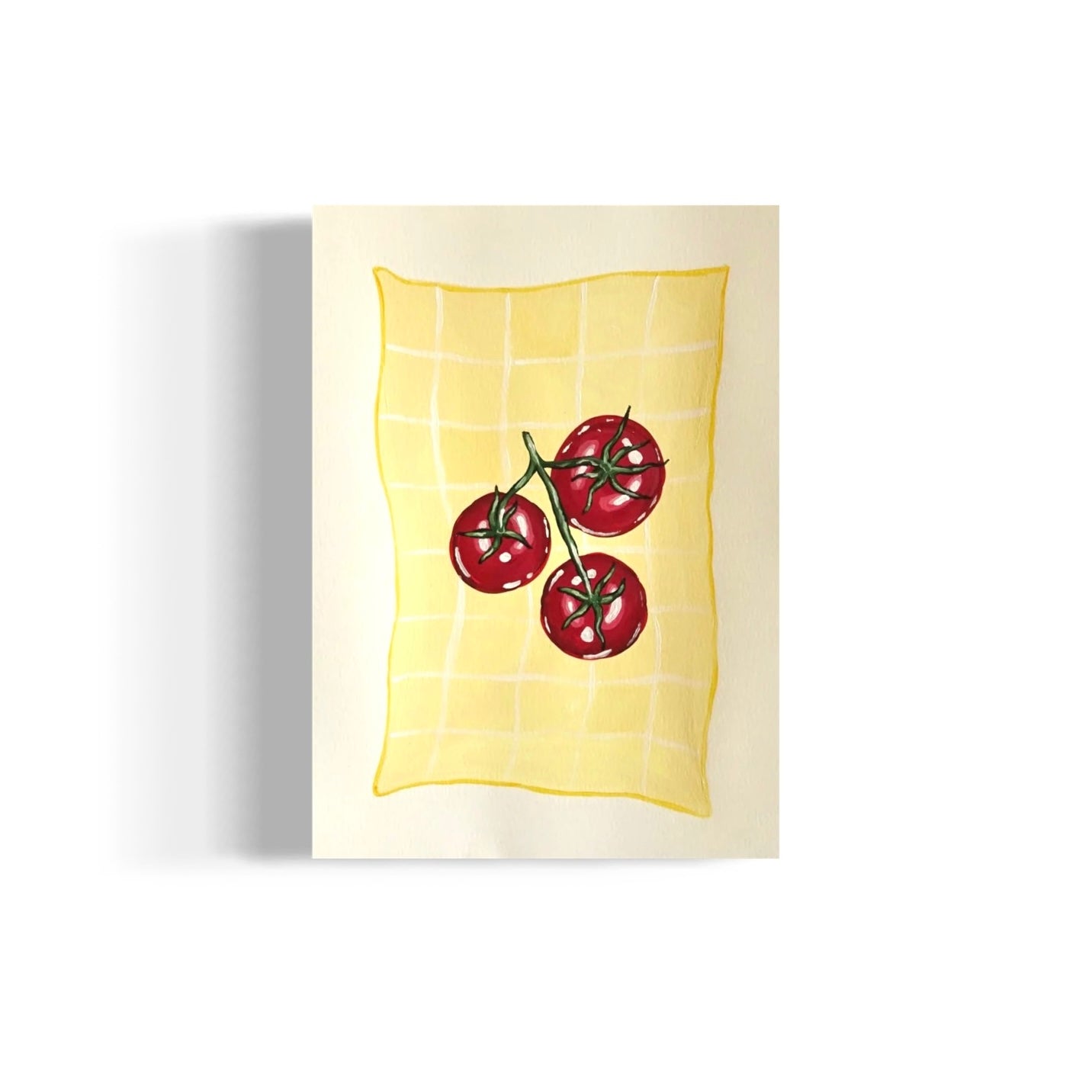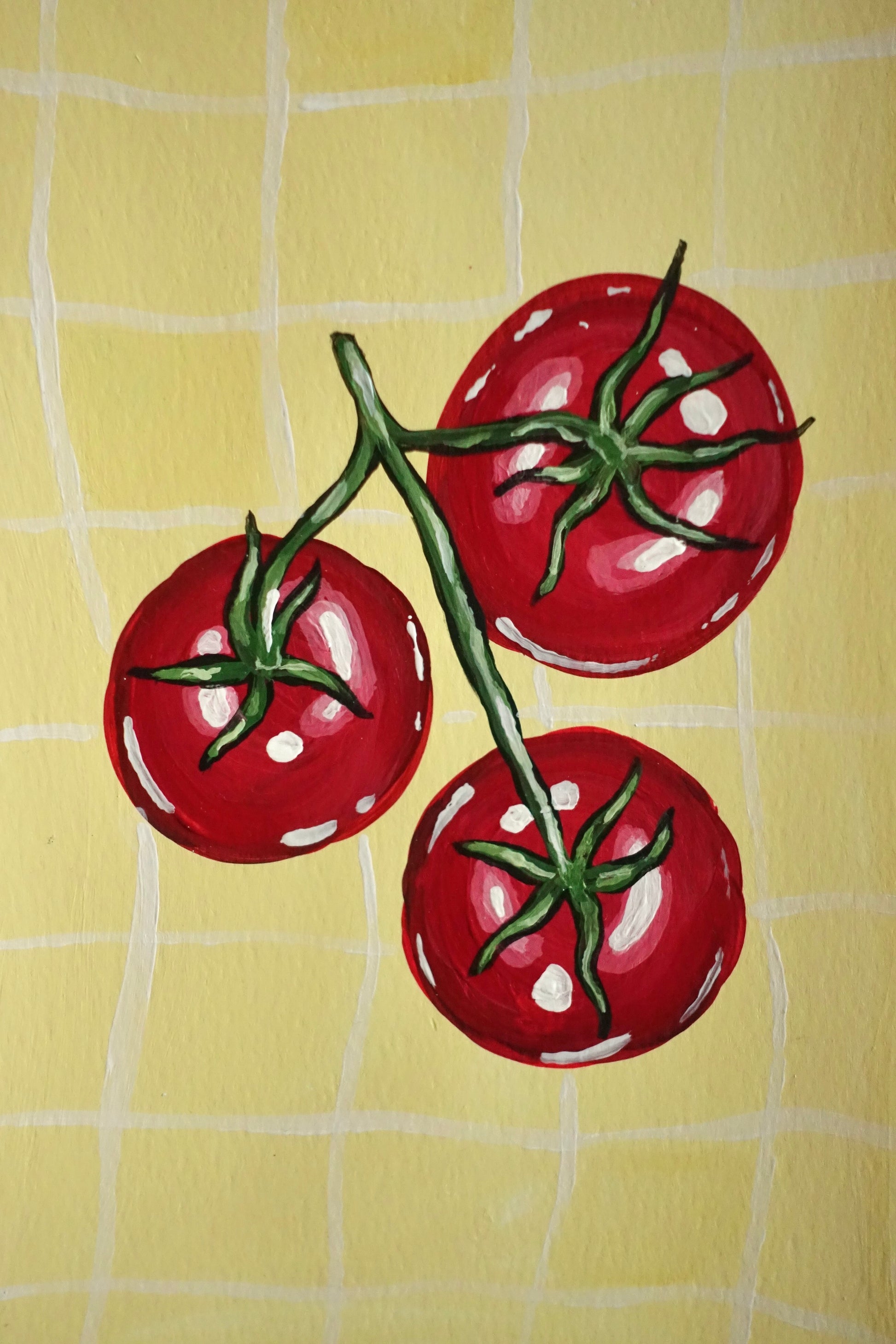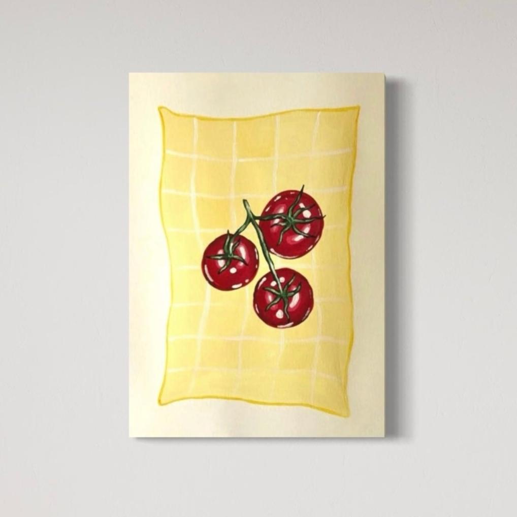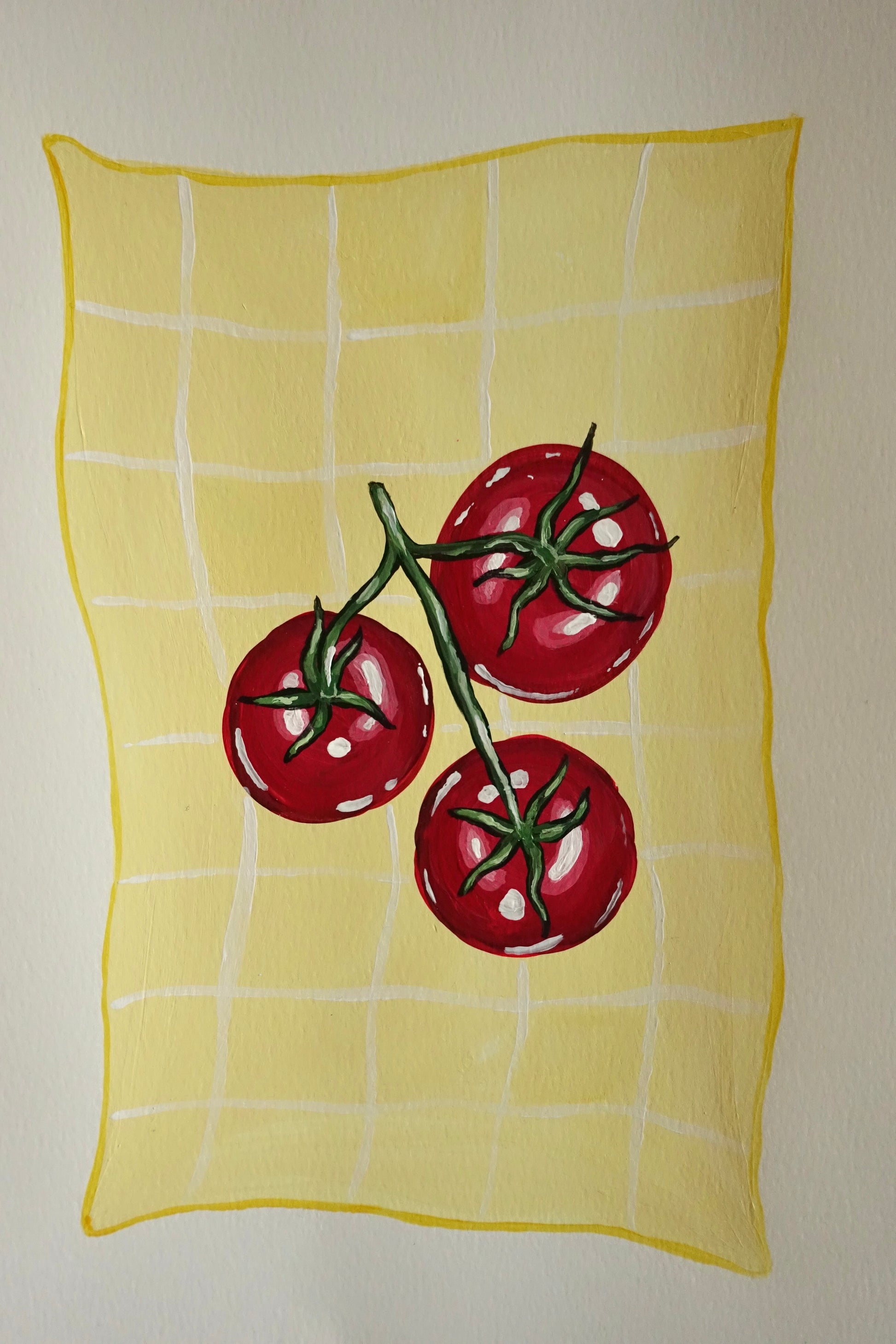 The artist Alice Söderholm's handmade painting "Tre Tomater" visualises three tomatoes on a yellow checkered, wavy background. Decorate your wall with this beautiful, unique artwork and make your home decor more colorful and stylish!