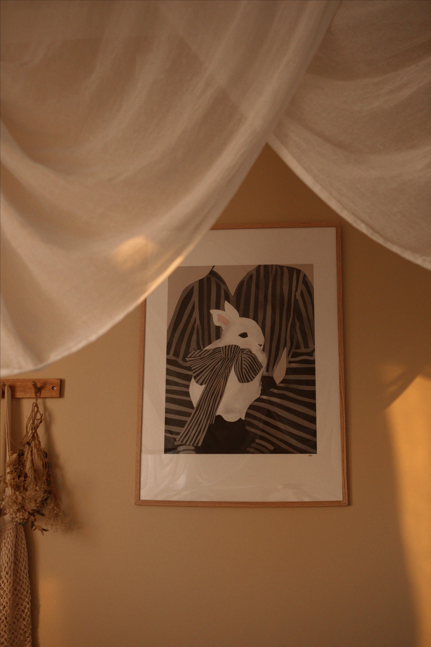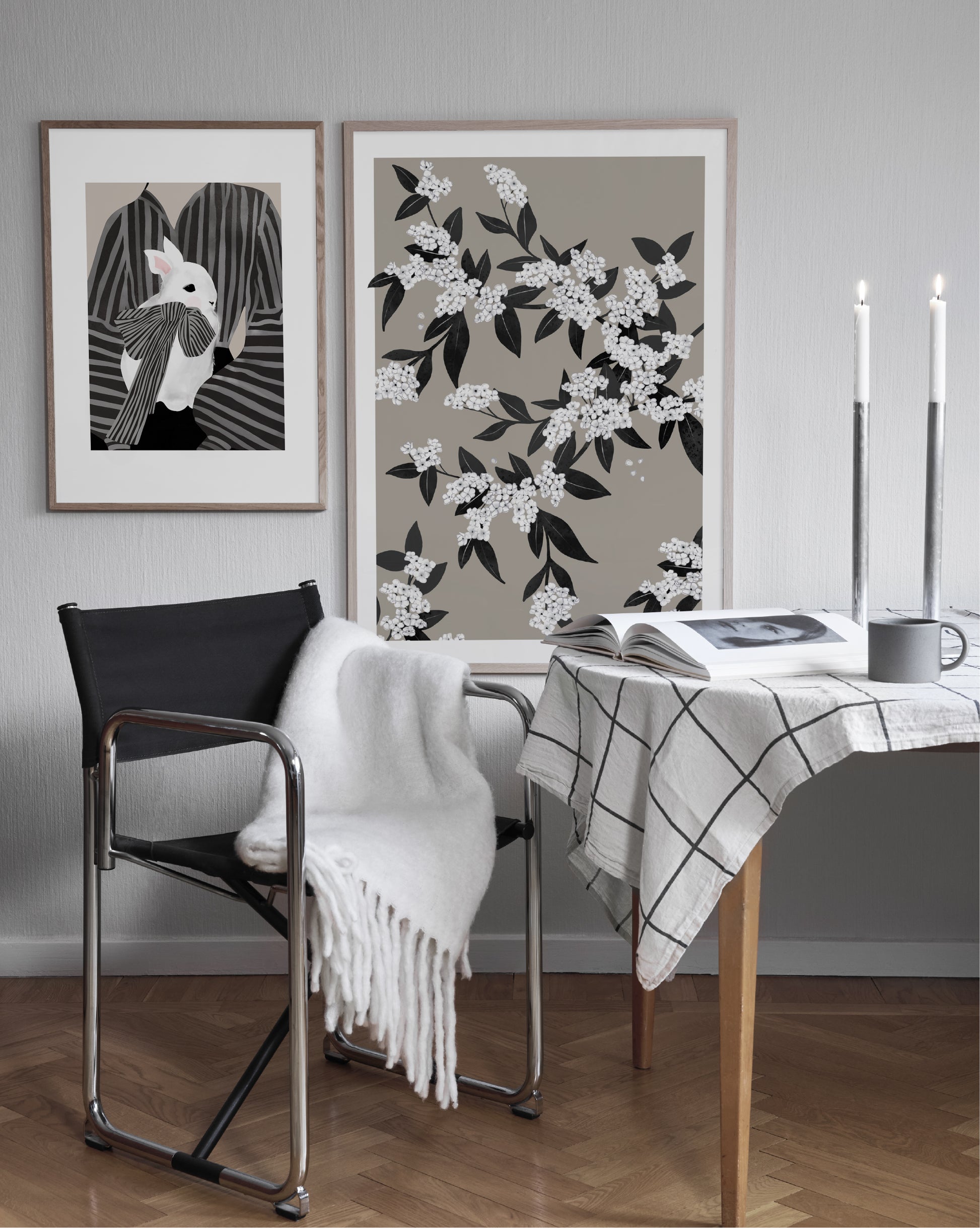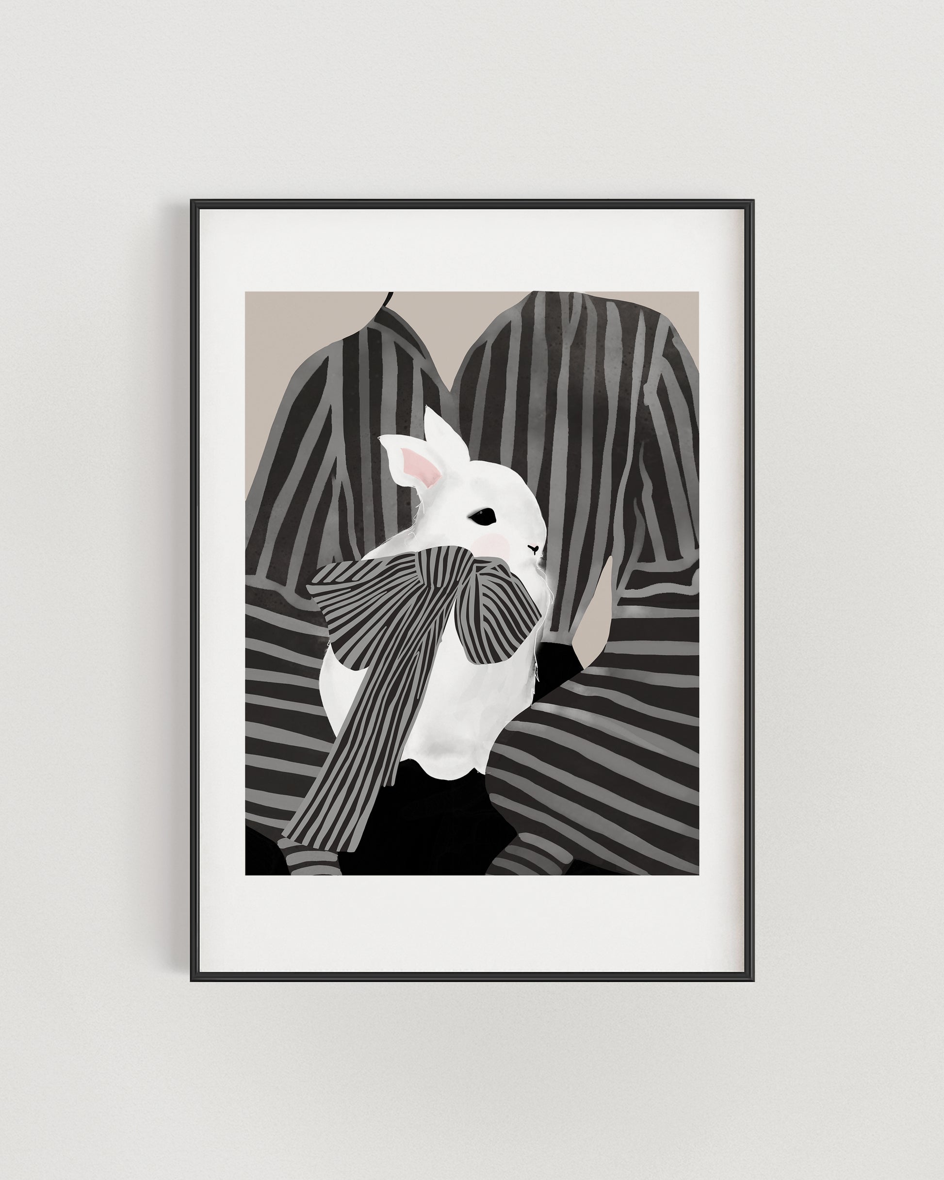 “Twinning” by Emma Älveus is a bold black-and-white artwork featuring a mirrored composition with a white bunny at the center, surrounded by abstract, botanical shapes. The graphic contrast and playful subject bring a sense of character and calm to any modern or minimalist space.