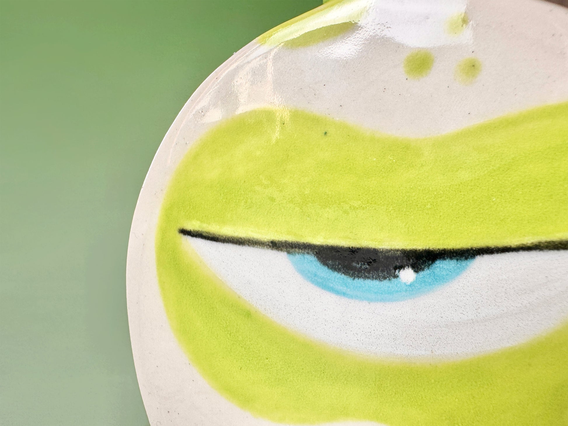 This hand built vase is made from stoneware clay and is painted with vibrant underglazes before its first firing. The eye on each side has a different expression, changing the look when you turn it around. It is then coated with a transparent glaze and fired a second time. Each piece takes about 3-4 weeks to complete and is truly one of a kind.