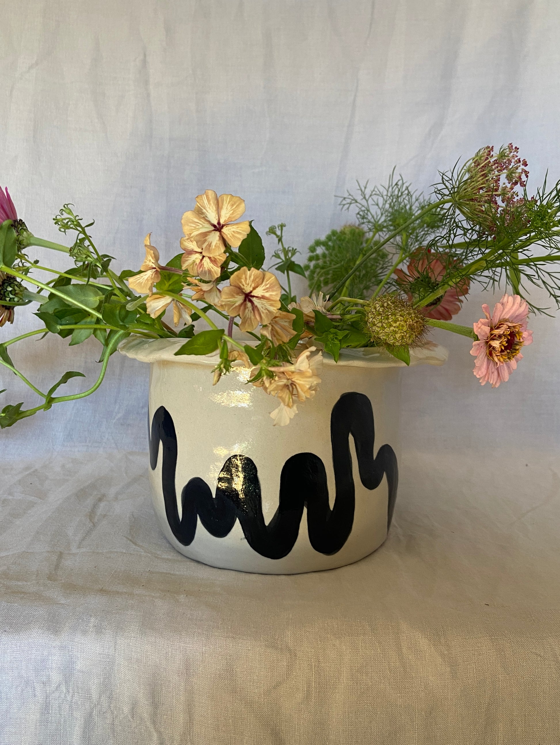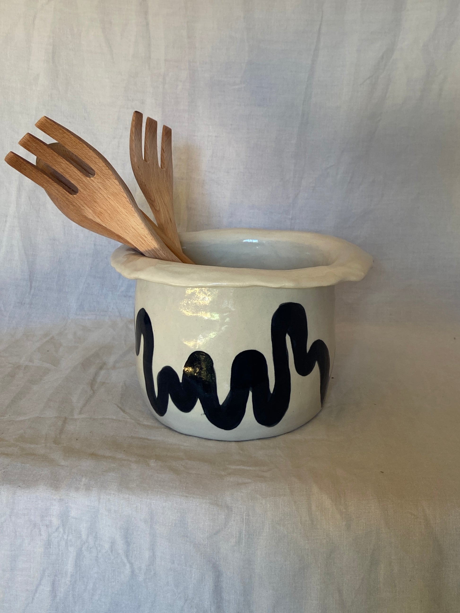 This is a fun, handmade vase with a unique shape by the ceramicist Tahkamik. Its unique shape will truly make it stand out in your kitchen.