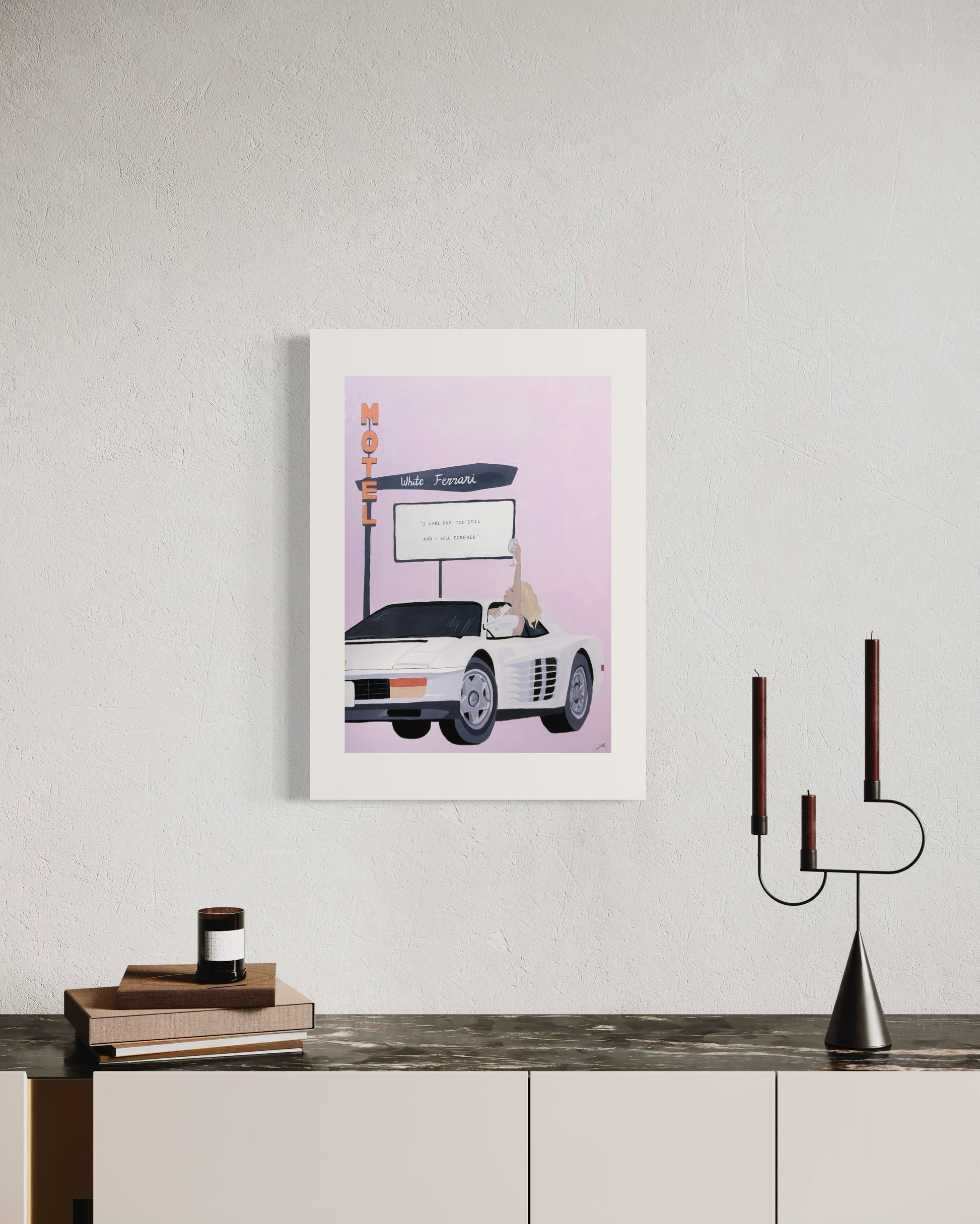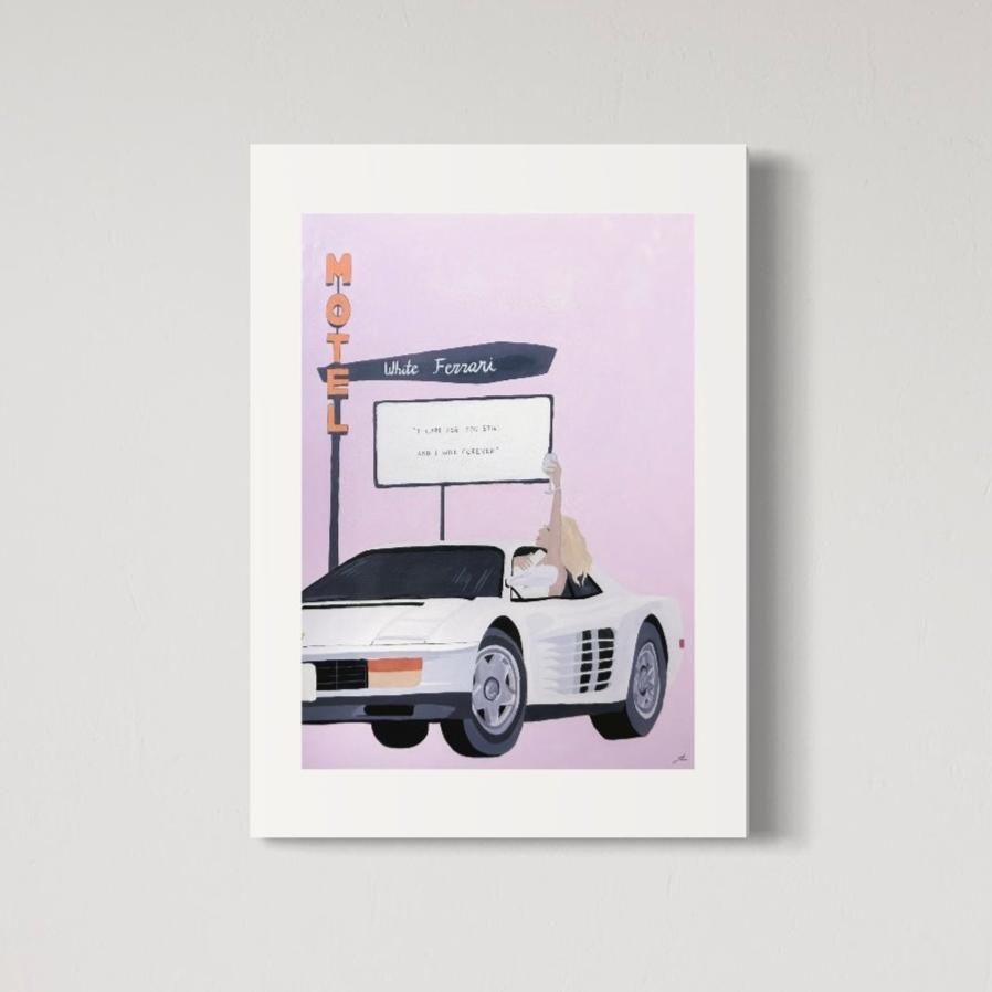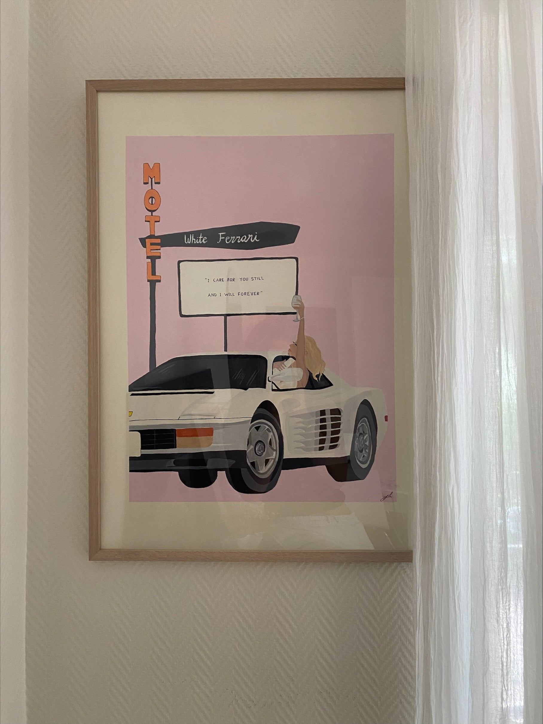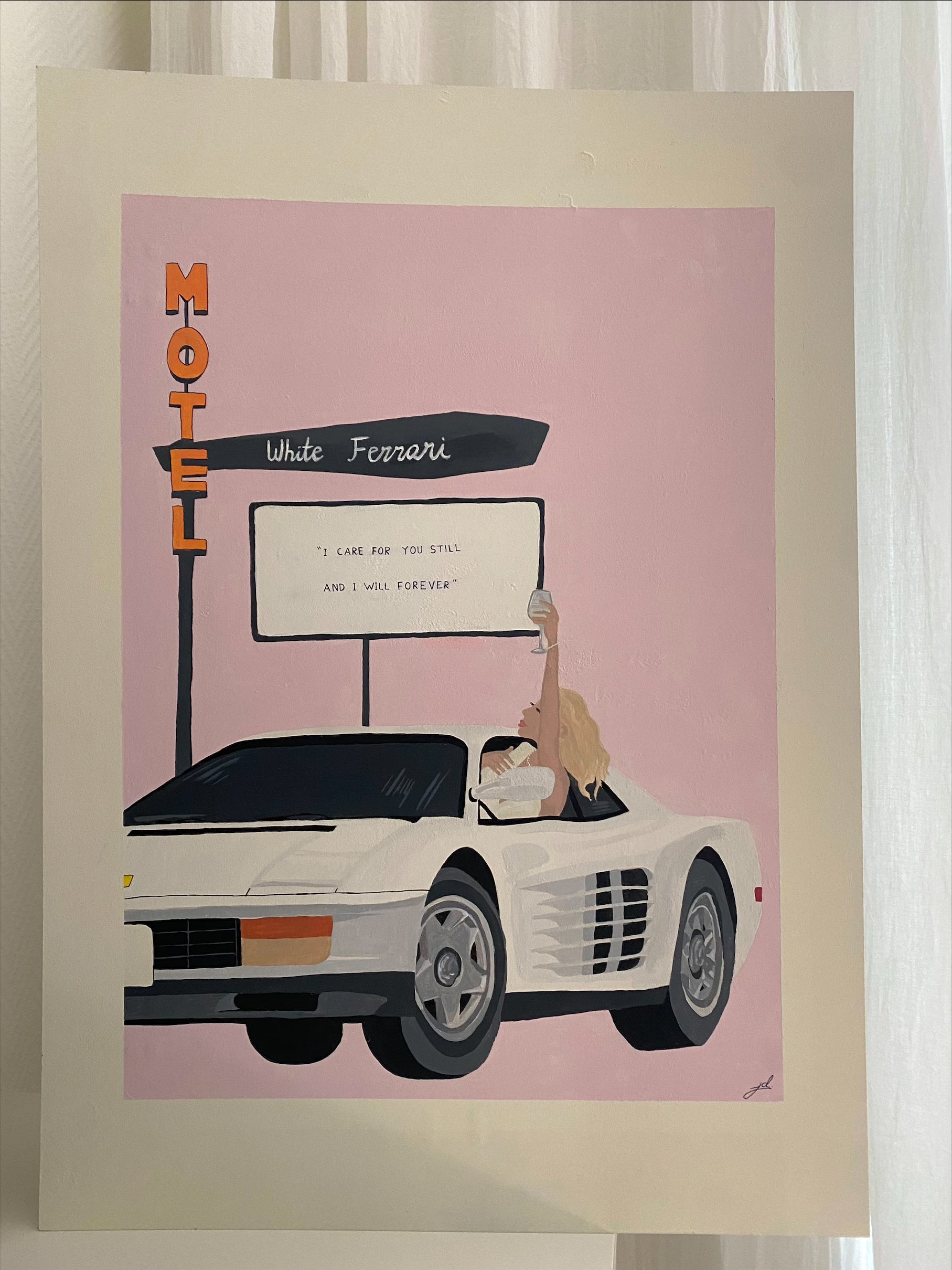 The original handmade, acrylic painting "White Ferrari" by the artist Julia Diep. A unique, colorful art piece picturing a stylish woman in a car. Perfect for the Scandinavian styled home!